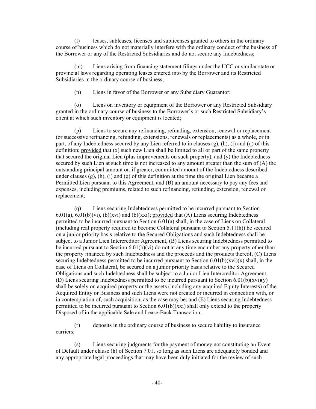 (l) leases, subleases, licenses and sublicenses granted to others in the ordinary course of business which do not materially interfere with the ordinary conduct of the business of the Borrower or any of the Restricted Subsidiaries and do not secure any Indebtedness; (m) Liens arising from financing statement filings under the UCC or similar state or provincial laws regarding operating leases entered into by the Borrower and its Restricted Subsidiaries in the ordinary course of business; (n) Liens in favor of the Borrower or any Subsidiary Guarantor; (o) Liens on inventory or equipment of the Borrower or any Restricted Subsidiary granted in the ordinary course of business to the Borrower’s or such Restricted Subsidiary’s client at which such inventory or equipment is located; (p) Liens to secure any refinancing, refunding, extension, renewal or replacement (or successive refinancing, refunding, extensions, renewals or replacements) as a whole, or in part, of any Indebtedness secured by any Lien referred to in clauses (g), (h), (i) and (q) of this definition; provided that (x) such new Lien shall be limited to all or part of the same property that secured the original Lien (plus improvements on such property), and (y) the Indebtedness secured by such Lien at such time is not increased to any amount greater than the sum of (A) the outstanding principal amount or, if greater, committed amount of the Indebtedness described under clauses (g), (h), (i) and (q) of this definition at the time the original Lien became a Permitted Lien pursuant to this Agreement, and (B) an amount necessary to pay any fees and expenses, including premiums, related to such refinancing, refunding, extension, renewal or replacement; (q) Liens securing Indebtedness permitted to be incurred pursuant to Section 6.01(a), 6.01(b)(vi), (b)(xvi) and (b)(xxi); provided that (A) Liens securing Indebtedness permitted to be incurred pursuant to Section 6.01(a) shall, in the case of Liens on Collateral (including real property required to become Collateral pursuant to Section 5.11(h)) be secured on a junior priority basis relative to the Secured Obligations and such Indebtedness shall be subject to a Junior Lien Intercreditor Agreement, (B) Liens securing Indebtedness permitted to be incurred pursuant to Section 6.01(b)(vi) do not at any time encumber any property other than the property financed by such Indebtedness and the proceeds and the products thereof, (C) Liens securing Indebtedness permitted to be incurred pursuant to Section 6.01(b)(xvi)(x) shall, in the case of Liens on Collateral, be secured on a junior priority basis relative to the Secured Obligations and such Indebtedness shall be subject to a Junior Lien Intercreditor Agreement, (D) Liens securing Indebtedness permitted to be incurred pursuant to Section 6.01(b)(xvi)(y) shall be solely on acquired property or the assets (including any acquired Equity Interests) of the Acquired Entity or Business and such Liens were not created or incurred in connection with, or in contemplation of, such acquisition, as the case may be; and (E) Liens securing Indebtedness permitted to be incurred pursuant to Section 6.01(b)(xxi) shall only extend to the property Disposed of in the applicable Sale and Lease-Back Transaction; (r) deposits in the ordinary course of business to secure liability to insurance carriers; (s) Liens securing judgments for the payment of money not constituting an Event of Default under clause (h) of Section 7.01, so long as such Liens are adequately bonded and any appropriate legal proceedings that may have been duly initiated for the review of such - 40-