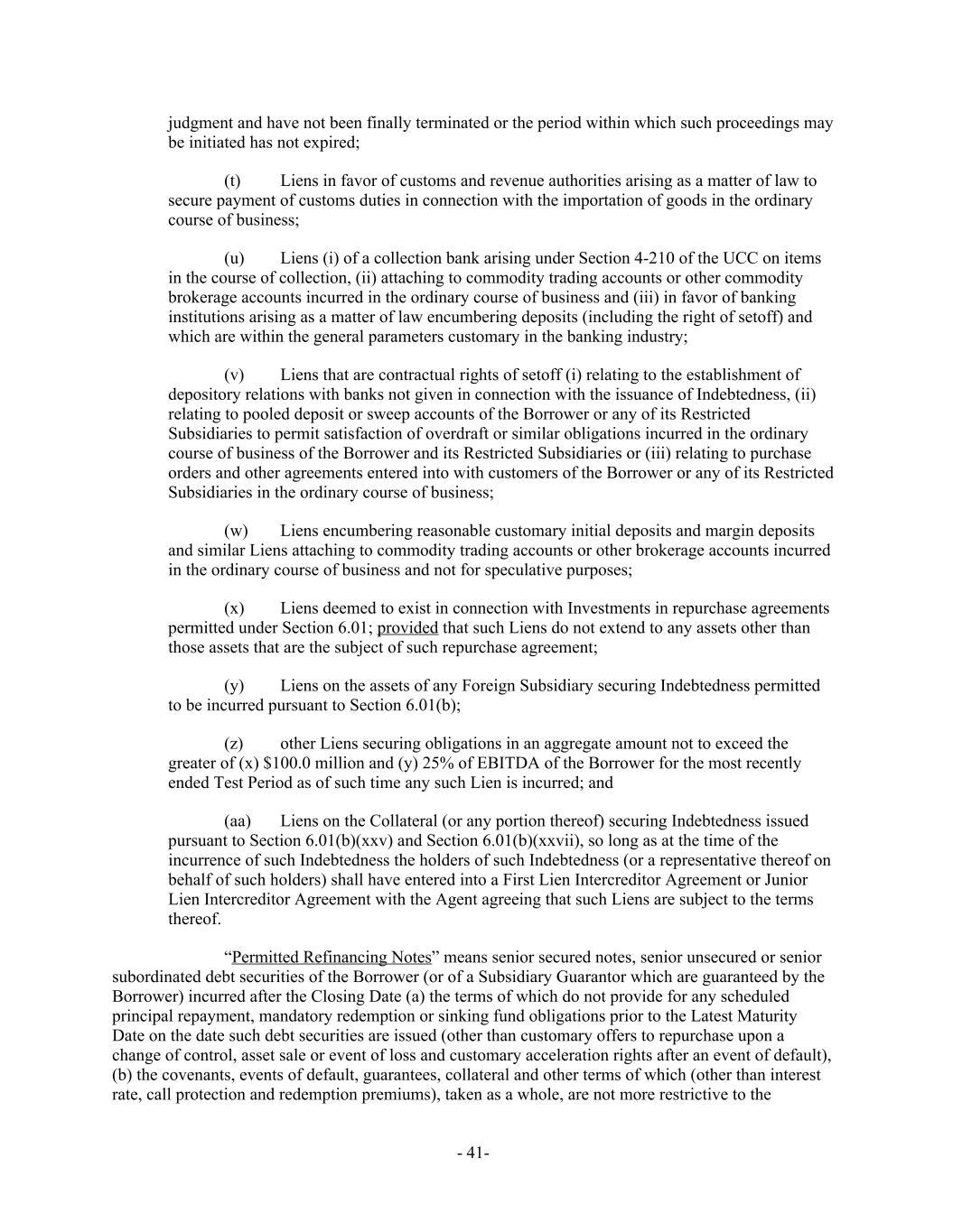 judgment and have not been finally terminated or the period within which such proceedings may be initiated has not expired; (t) Liens in favor of customs and revenue authorities arising as a matter of law to secure payment of customs duties in connection with the importation of goods in the ordinary course of business; (u) Liens (i) of a collection bank arising under Section 4-210 of the UCC on items in the course of collection, (ii) attaching to commodity trading accounts or other commodity brokerage accounts incurred in the ordinary course of business and (iii) in favor of banking institutions arising as a matter of law encumbering deposits (including the right of setoff) and which are within the general parameters customary in the banking industry; (v) Liens that are contractual rights of setoff (i) relating to the establishment of depository relations with banks not given in connection with the issuance of Indebtedness, (ii) relating to pooled deposit or sweep accounts of the Borrower or any of its Restricted Subsidiaries to permit satisfaction of overdraft or similar obligations incurred in the ordinary course of business of the Borrower and its Restricted Subsidiaries or (iii) relating to purchase orders and other agreements entered into with customers of the Borrower or any of its Restricted Subsidiaries in the ordinary course of business; (w) Liens encumbering reasonable customary initial deposits and margin deposits and similar Liens attaching to commodity trading accounts or other brokerage accounts incurred in the ordinary course of business and not for speculative purposes; (x) Liens deemed to exist in connection with Investments in repurchase agreements permitted under Section 6.01; provided that such Liens do not extend to any assets other than those assets that are the subject of such repurchase agreement; (y) Liens on the assets of any Foreign Subsidiary securing Indebtedness permitted to be incurred pursuant to Section 6.01(b); (z) other Liens securing obligations in an aggregate amount not to exceed the greater of (x) $100.0 million and (y) 25% of EBITDA of the Borrower for the most recently ended Test Period as of such time any such Lien is incurred; and (aa) Liens on the Collateral (or any portion thereof) securing Indebtedness issued pursuant to Section 6.01(b)(xxv) and Section 6.01(b)(xxvii), so long as at the time of the incurrence of such Indebtedness the holders of such Indebtedness (or a representative thereof on behalf of such holders) shall have entered into a First Lien Intercreditor Agreement or Junior Lien Intercreditor Agreement with the Agent agreeing that such Liens are subject to the terms thereof. “Permitted Refinancing Notes” means senior secured notes, senior unsecured or senior subordinated debt securities of the Borrower (or of a Subsidiary Guarantor which are guaranteed by the Borrower) incurred after the Closing Date (a) the terms of which do not provide for any scheduled principal repayment, mandatory redemption or sinking fund obligations prior to the Latest Maturity Date on the date such debt securities are issued (other than customary offers to repurchase upon a change of control, asset sale or event of loss and customary acceleration rights after an event of default), (b) the covenants, events of default, guarantees, collateral and other terms of which (other than interest rate, call protection and redemption premiums), taken as a whole, are not more restrictive to the - 41-