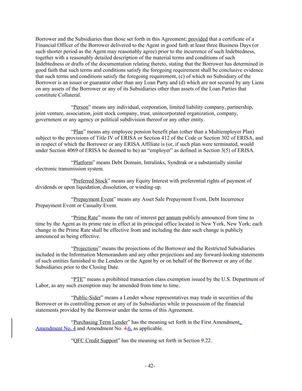 Borrower and the Subsidiaries than those set forth in this Agreement; provided that a certificate of a Financial Officer of the Borrower delivered to the Agent in good faith at least three Business Days (or such shorter period as the Agent may reasonably agree) prior to the incurrence of such Indebtedness, together with a reasonably detailed description of the material terms and conditions of such Indebtedness or drafts of the documentation relating thereto, stating that the Borrower has determined in good faith that such terms and conditions satisfy the foregoing requirement shall be conclusive evidence that such terms and conditions satisfy the foregoing requirement, (c) of which no Subsidiary of the Borrower is an issuer or guarantor other than any Loan Party and (d) which are not secured by any Liens on any assets of the Borrower or any of its Subsidiaries other than assets of the Loan Parties that constitute Collateral. “Person” means any individual, corporation, limited liability company, partnership, joint venture, association, joint stock company, trust, unincorporated organization, company, government or any agency or political subdivision thereof or any other entity. “Plan” means any employee pension benefit plan (other than a Multiemployer Plan) subject to the provisions of Title IV of ERISA or Section 412 of the Code or Section 302 of ERISA, and in respect of which the Borrower or any ERISA Affiliate is (or, if such plan were terminated, would under Section 4069 of ERISA be deemed to be) an “employer” as defined in Section 3(5) of ERISA. “Platform” means Debt Domain, Intralinks, Syndtrak or a substantially similar electronic transmission system. “Preferred Stock” means any Equity Interest with preferential rights of payment of dividends or upon liquidation, dissolution, or winding-up. “Prepayment Event” means any Asset Sale Prepayment Event, Debt Incurrence Prepayment Event or Casualty Event. “Prime Rate” means the rate of interest per annum publicly announced from time to time by the Agent as its prime rate in effect at its principal office located in New York, New York; each change in the Prime Rate shall be effective from and including the date such change is publicly announced as being effective. “Projections” means the projections of the Borrower and the Restricted Subsidiaries included in the Information Memorandum and any other projections and any forward-looking statements of such entities furnished to the Lenders or the Agent by or on behalf of the Borrower or any of the Subsidiaries prior to the Closing Date. “PTE” means a prohibited transaction class exemption issued by the U.S. Department of Labor, as any such exemption may be amended from time to time. “Public-Sider” means a Lender whose representatives may trade in securities of the Borrower or its controlling person or any of its Subsidiaries while in possession of the financial statements provided by the Borrower under the terms of this Agreement. “Purchasing Term Lender” has the meaning set forth in the First Amendment, Amendment No. 4 and Amendment No. 4,6, as applicable. “QFC Credit Support” has the meaning set forth in Section 9.22. - 42-