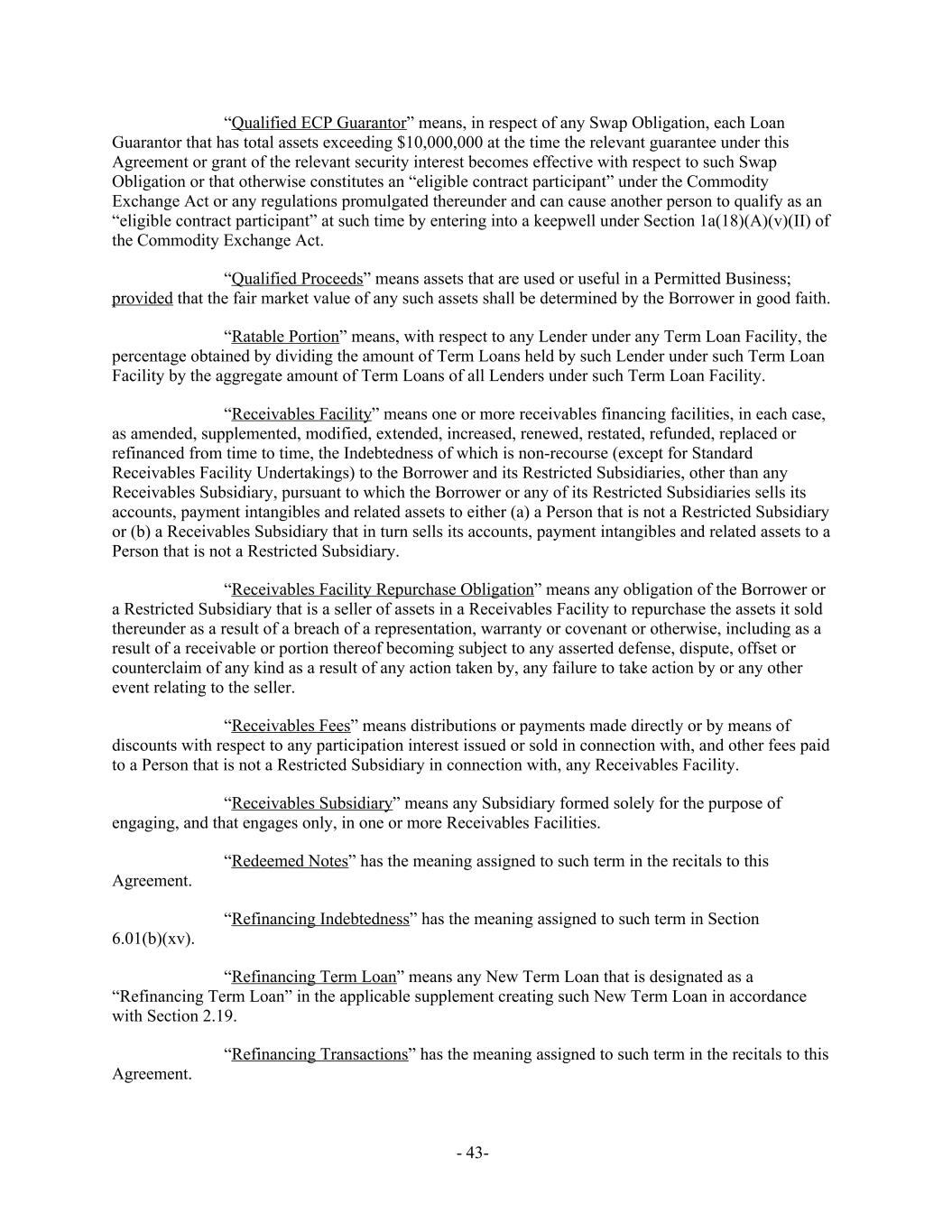 “Qualified ECP Guarantor” means, in respect of any Swap Obligation, each Loan Guarantor that has total assets exceeding $10,000,000 at the time the relevant guarantee under this Agreement or grant of the relevant security interest becomes effective with respect to such Swap Obligation or that otherwise constitutes an “eligible contract participant” under the Commodity Exchange Act or any regulations promulgated thereunder and can cause another person to qualify as an “eligible contract participant” at such time by entering into a keepwell under Section 1a(18)(A)(v)(II) of the Commodity Exchange Act. “Qualified Proceeds” means assets that are used or useful in a Permitted Business; provided that the fair market value of any such assets shall be determined by the Borrower in good faith. “Ratable Portion” means, with respect to any Lender under any Term Loan Facility, the percentage obtained by dividing the amount of Term Loans held by such Lender under such Term Loan Facility by the aggregate amount of Term Loans of all Lenders under such Term Loan Facility. “Receivables Facility” means one or more receivables financing facilities, in each case, as amended, supplemented, modified, extended, increased, renewed, restated, refunded, replaced or refinanced from time to time, the Indebtedness of which is non-recourse (except for Standard Receivables Facility Undertakings) to the Borrower and its Restricted Subsidiaries, other than any Receivables Subsidiary, pursuant to which the Borrower or any of its Restricted Subsidiaries sells its accounts, payment intangibles and related assets to either (a) a Person that is not a Restricted Subsidiary or (b) a Receivables Subsidiary that in turn sells its accounts, payment intangibles and related assets to a Person that is not a Restricted Subsidiary. “Receivables Facility Repurchase Obligation” means any obligation of the Borrower or a Restricted Subsidiary that is a seller of assets in a Receivables Facility to repurchase the assets it sold thereunder as a result of a breach of a representation, warranty or covenant or otherwise, including as a result of a receivable or portion thereof becoming subject to any asserted defense, dispute, offset or counterclaim of any kind as a result of any action taken by, any failure to take action by or any other event relating to the seller. “Receivables Fees” means distributions or payments made directly or by means of discounts with respect to any participation interest issued or sold in connection with, and other fees paid to a Person that is not a Restricted Subsidiary in connection with, any Receivables Facility. “Receivables Subsidiary” means any Subsidiary formed solely for the purpose of engaging, and that engages only, in one or more Receivables Facilities. “Redeemed Notes” has the meaning assigned to such term in the recitals to this Agreement. “Refinancing Indebtedness” has the meaning assigned to such term in Section 6.01(b)(xv). “Refinancing Term Loan” means any New Term Loan that is designated as a “Refinancing Term Loan” in the applicable supplement creating such New Term Loan in accordance with Section 2.19. “Refinancing Transactions” has the meaning assigned to such term in the recitals to this Agreement. - 43-