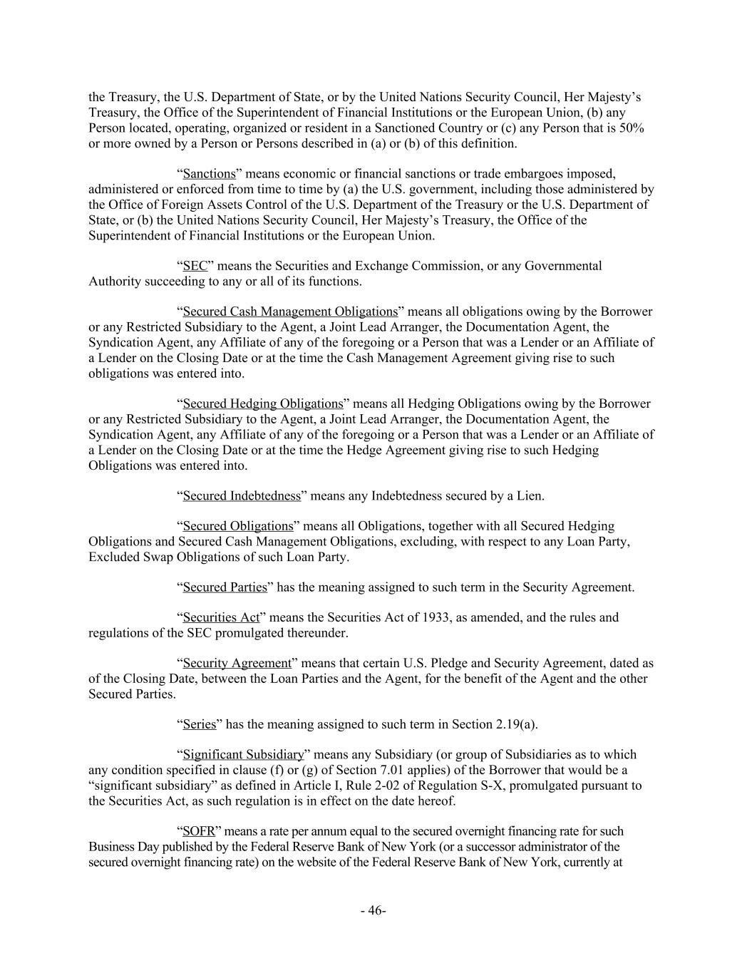 the Treasury, the U.S. Department of State, or by the United Nations Security Council, Her Majesty’s Treasury, the Office of the Superintendent of Financial Institutions or the European Union, (b) any Person located, operating, organized or resident in a Sanctioned Country or (c) any Person that is 50% or more owned by a Person or Persons described in (a) or (b) of this definition. “Sanctions” means economic or financial sanctions or trade embargoes imposed, administered or enforced from time to time by (a) the U.S. government, including those administered by the Office of Foreign Assets Control of the U.S. Department of the Treasury or the U.S. Department of State, or (b) the United Nations Security Council, Her Majesty’s Treasury, the Office of the Superintendent of Financial Institutions or the European Union. “SEC” means the Securities and Exchange Commission, or any Governmental Authority succeeding to any or all of its functions. “Secured Cash Management Obligations” means all obligations owing by the Borrower or any Restricted Subsidiary to the Agent, a Joint Lead Arranger, the Documentation Agent, the Syndication Agent, any Affiliate of any of the foregoing or a Person that was a Lender or an Affiliate of a Lender on the Closing Date or at the time the Cash Management Agreement giving rise to such obligations was entered into. “Secured Hedging Obligations” means all Hedging Obligations owing by the Borrower or any Restricted Subsidiary to the Agent, a Joint Lead Arranger, the Documentation Agent, the Syndication Agent, any Affiliate of any of the foregoing or a Person that was a Lender or an Affiliate of a Lender on the Closing Date or at the time the Hedge Agreement giving rise to such Hedging Obligations was entered into. “Secured Indebtedness” means any Indebtedness secured by a Lien. “Secured Obligations” means all Obligations, together with all Secured Hedging Obligations and Secured Cash Management Obligations, excluding, with respect to any Loan Party, Excluded Swap Obligations of such Loan Party. “Secured Parties” has the meaning assigned to such term in the Security Agreement. “Securities Act” means the Securities Act of 1933, as amended, and the rules and regulations of the SEC promulgated thereunder. “Security Agreement” means that certain U.S. Pledge and Security Agreement, dated as of the Closing Date, between the Loan Parties and the Agent, for the benefit of the Agent and the other Secured Parties. “Series” has the meaning assigned to such term in Section 2.19(a). “Significant Subsidiary” means any Subsidiary (or group of Subsidiaries as to which any condition specified in clause (f) or (g) of Section 7.01 applies) of the Borrower that would be a “significant subsidiary” as defined in Article I, Rule 2-02 of Regulation S-X, promulgated pursuant to the Securities Act, as such regulation is in effect on the date hereof. “SOFR” means a rate per annum equal to the secured overnight financing rate for such Business Day published by the Federal Reserve Bank of New York (or a successor administrator of the secured overnight financing rate) on the website of the Federal Reserve Bank of New York, currently at - 46-