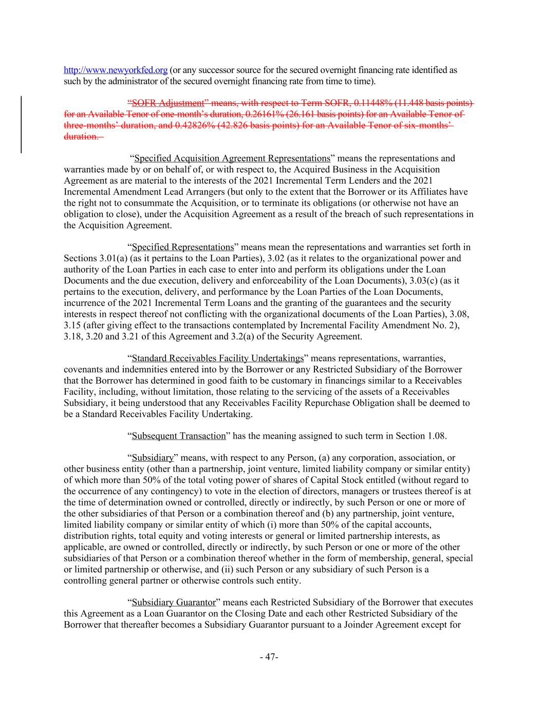http://www.newyorkfed.org (or any successor source for the secured overnight financing rate identified as such by the administrator of the secured overnight financing rate from time to time). “SOFR Adjustment” means, with respect to Term SOFR, 0.11448% (11.448 basis points) for an Available Tenor of one-month’s duration, 0.26161% (26.161 basis points) for an Available Tenor of three-months’ duration, and 0.42826% (42.826 basis points) for an Available Tenor of six-months’ duration. “Specified Acquisition Agreement Representations” means the representations and warranties made by or on behalf of, or with respect to, the Acquired Business in the Acquisition Agreement as are material to the interests of the 2021 Incremental Term Lenders and the 2021 Incremental Amendment Lead Arrangers (but only to the extent that the Borrower or its Affiliates have the right not to consummate the Acquisition, or to terminate its obligations (or otherwise not have an obligation to close), under the Acquisition Agreement as a result of the breach of such representations in the Acquisition Agreement. “Specified Representations” means mean the representations and warranties set forth in Sections 3.01(a) (as it pertains to the Loan Parties), 3.02 (as it relates to the organizational power and authority of the Loan Parties in each case to enter into and perform its obligations under the Loan Documents and the due execution, delivery and enforceability of the Loan Documents), 3.03(c) (as it pertains to the execution, delivery, and performance by the Loan Parties of the Loan Documents, incurrence of the 2021 Incremental Term Loans and the granting of the guarantees and the security interests in respect thereof not conflicting with the organizational documents of the Loan Parties), 3.08, 3.15 (after giving effect to the transactions contemplated by Incremental Facility Amendment No. 2), 3.18, 3.20 and 3.21 of this Agreement and 3.2(a) of the Security Agreement. “Standard Receivables Facility Undertakings” means representations, warranties, covenants and indemnities entered into by the Borrower or any Restricted Subsidiary of the Borrower that the Borrower has determined in good faith to be customary in financings similar to a Receivables Facility, including, without limitation, those relating to the servicing of the assets of a Receivables Subsidiary, it being understood that any Receivables Facility Repurchase Obligation shall be deemed to be a Standard Receivables Facility Undertaking. “Subsequent Transaction” has the meaning assigned to such term in Section 1.08. “Subsidiary” means, with respect to any Person, (a) any corporation, association, or other business entity (other than a partnership, joint venture, limited liability company or similar entity) of which more than 50% of the total voting power of shares of Capital Stock entitled (without regard to the occurrence of any contingency) to vote in the election of directors, managers or trustees thereof is at the time of determination owned or controlled, directly or indirectly, by such Person or one or more of the other subsidiaries of that Person or a combination thereof and (b) any partnership, joint venture, limited liability company or similar entity of which (i) more than 50% of the capital accounts, distribution rights, total equity and voting interests or general or limited partnership interests, as applicable, are owned or controlled, directly or indirectly, by such Person or one or more of the other subsidiaries of that Person or a combination thereof whether in the form of membership, general, special or limited partnership or otherwise, and (ii) such Person or any subsidiary of such Person is a controlling general partner or otherwise controls such entity. “Subsidiary Guarantor” means each Restricted Subsidiary of the Borrower that executes this Agreement as a Loan Guarantor on the Closing Date and each other Restricted Subsidiary of the Borrower that thereafter becomes a Subsidiary Guarantor pursuant to a Joinder Agreement except for - 47-