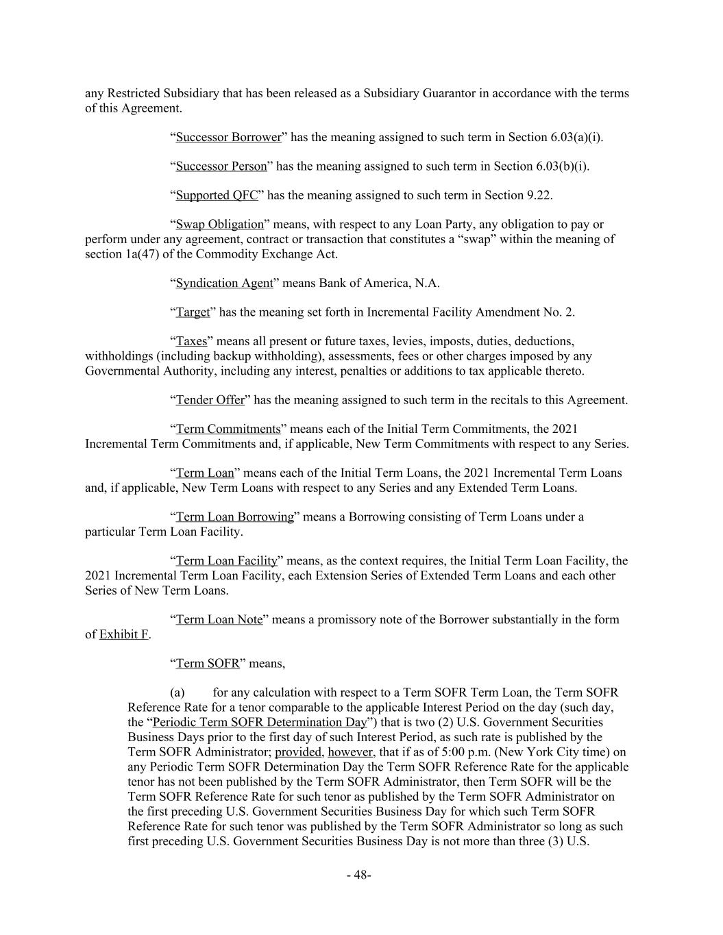 any Restricted Subsidiary that has been released as a Subsidiary Guarantor in accordance with the terms of this Agreement. “Successor Borrower” has the meaning assigned to such term in Section 6.03(a)(i). “Successor Person” has the meaning assigned to such term in Section 6.03(b)(i). “Supported QFC” has the meaning assigned to such term in Section 9.22. “Swap Obligation” means, with respect to any Loan Party, any obligation to pay or perform under any agreement, contract or transaction that constitutes a “swap” within the meaning of section 1a(47) of the Commodity Exchange Act. “Syndication Agent” means Bank of America, N.A. “Target” has the meaning set forth in Incremental Facility Amendment No. 2. “Taxes” means all present or future taxes, levies, imposts, duties, deductions, withholdings (including backup withholding), assessments, fees or other charges imposed by any Governmental Authority, including any interest, penalties or additions to tax applicable thereto. “Tender Offer” has the meaning assigned to such term in the recitals to this Agreement. “Term Commitments” means each of the Initial Term Commitments, the 2021 Incremental Term Commitments and, if applicable, New Term Commitments with respect to any Series. “Term Loan” means each of the Initial Term Loans, the 2021 Incremental Term Loans and, if applicable, New Term Loans with respect to any Series and any Extended Term Loans. “Term Loan Borrowing” means a Borrowing consisting of Term Loans under a particular Term Loan Facility. “Term Loan Facility” means, as the context requires, the Initial Term Loan Facility, the 2021 Incremental Term Loan Facility, each Extension Series of Extended Term Loans and each other Series of New Term Loans. “Term Loan Note” means a promissory note of the Borrower substantially in the form of Exhibit F. “Term SOFR” means, (a) for any calculation with respect to a Term SOFR Term Loan, the Term SOFR Reference Rate for a tenor comparable to the applicable Interest Period on the day (such day, the “Periodic Term SOFR Determination Day”) that is two (2) U.S. Government Securities Business Days prior to the first day of such Interest Period, as such rate is published by the Term SOFR Administrator; provided, however, that if as of 5:00 p.m. (New York City time) on any Periodic Term SOFR Determination Day the Term SOFR Reference Rate for the applicable tenor has not been published by the Term SOFR Administrator, then Term SOFR will be the Term SOFR Reference Rate for such tenor as published by the Term SOFR Administrator on the first preceding U.S. Government Securities Business Day for which such Term SOFR Reference Rate for such tenor was published by the Term SOFR Administrator so long as such first preceding U.S. Government Securities Business Day is not more than three (3) U.S. - 48-