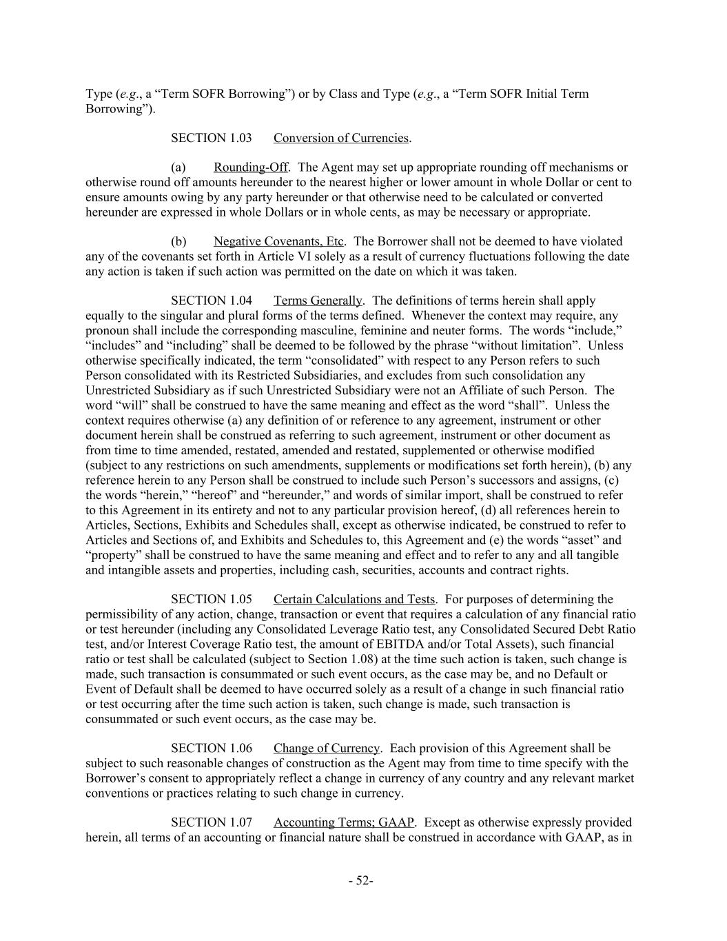 Type (e.g., a “Term SOFR Borrowing”) or by Class and Type (e.g., a “Term SOFR Initial Term Borrowing”). Conversion of Currencies.SECTION 1.03 Rounding-Off. The Agent may set up appropriate rounding off mechanisms or(a) otherwise round off amounts hereunder to the nearest higher or lower amount in whole Dollar or cent to ensure amounts owing by any party hereunder or that otherwise need to be calculated or converted hereunder are expressed in whole Dollars or in whole cents, as may be necessary or appropriate. Negative Covenants, Etc. The Borrower shall not be deemed to have violated(b) any of the covenants set forth in Article VI solely as a result of currency fluctuations following the date any action is taken if such action was permitted on the date on which it was taken. Terms Generally. The definitions of terms herein shall applySECTION 1.04 equally to the singular and plural forms of the terms defined. Whenever the context may require, any pronoun shall include the corresponding masculine, feminine and neuter forms. The words “include,” “includes” and “including” shall be deemed to be followed by the phrase “without limitation”. Unless otherwise specifically indicated, the term “consolidated” with respect to any Person refers to such Person consolidated with its Restricted Subsidiaries, and excludes from such consolidation any Unrestricted Subsidiary as if such Unrestricted Subsidiary were not an Affiliate of such Person. The word “will” shall be construed to have the same meaning and effect as the word “shall”. Unless the context requires otherwise (a) any definition of or reference to any agreement, instrument or other document herein shall be construed as referring to such agreement, instrument or other document as from time to time amended, restated, amended and restated, supplemented or otherwise modified (subject to any restrictions on such amendments, supplements or modifications set forth herein), (b) any reference herein to any Person shall be construed to include such Person’s successors and assigns, (c) the words “herein,” “hereof” and “hereunder,” and words of similar import, shall be construed to refer to this Agreement in its entirety and not to any particular provision hereof, (d) all references herein to Articles, Sections, Exhibits and Schedules shall, except as otherwise indicated, be construed to refer to Articles and Sections of, and Exhibits and Schedules to, this Agreement and (e) the words “asset” and “property” shall be construed to have the same meaning and effect and to refer to any and all tangible and intangible assets and properties, including cash, securities, accounts and contract rights. Certain Calculations and Tests. For purposes of determining theSECTION 1.05 permissibility of any action, change, transaction or event that requires a calculation of any financial ratio or test hereunder (including any Consolidated Leverage Ratio test, any Consolidated Secured Debt Ratio test, and/or Interest Coverage Ratio test, the amount of EBITDA and/or Total Assets), such financial ratio or test shall be calculated (subject to Section 1.08) at the time such action is taken, such change is made, such transaction is consummated or such event occurs, as the case may be, and no Default or Event of Default shall be deemed to have occurred solely as a result of a change in such financial ratio or test occurring after the time such action is taken, such change is made, such transaction is consummated or such event occurs, as the case may be. Change of Currency. Each provision of this Agreement shall beSECTION 1.06 subject to such reasonable changes of construction as the Agent may from time to time specify with the Borrower’s consent to appropriately reflect a change in currency of any country and any relevant market conventions or practices relating to such change in currency. Accounting Terms; GAAP. Except as otherwise expressly providedSECTION 1.07 herein, all terms of an accounting or financial nature shall be construed in accordance with GAAP, as in - 52-