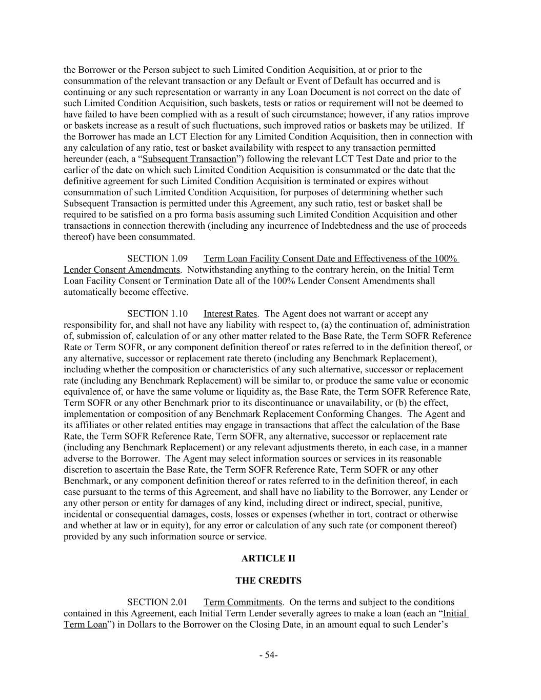 the Borrower or the Person subject to such Limited Condition Acquisition, at or prior to the consummation of the relevant transaction or any Default or Event of Default has occurred and is continuing or any such representation or warranty in any Loan Document is not correct on the date of such Limited Condition Acquisition, such baskets, tests or ratios or requirement will not be deemed to have failed to have been complied with as a result of such circumstance; however, if any ratios improve or baskets increase as a result of such fluctuations, such improved ratios or baskets may be utilized. If the Borrower has made an LCT Election for any Limited Condition Acquisition, then in connection with any calculation of any ratio, test or basket availability with respect to any transaction permitted hereunder (each, a “Subsequent Transaction”) following the relevant LCT Test Date and prior to the earlier of the date on which such Limited Condition Acquisition is consummated or the date that the definitive agreement for such Limited Condition Acquisition is terminated or expires without consummation of such Limited Condition Acquisition, for purposes of determining whether such Subsequent Transaction is permitted under this Agreement, any such ratio, test or basket shall be required to be satisfied on a pro forma basis assuming such Limited Condition Acquisition and other transactions in connection therewith (including any incurrence of Indebtedness and the use of proceeds thereof) have been consummated. Term Loan Facility Consent Date and Effectiveness of the 100% SECTION 1.09 Lender Consent Amendments. Notwithstanding anything to the contrary herein, on the Initial Term Loan Facility Consent or Termination Date all of the 100% Lender Consent Amendments shall automatically become effective. Interest Rates. The Agent does not warrant or accept anySECTION 1.10 responsibility for, and shall not have any liability with respect to, (a) the continuation of, administration of, submission of, calculation of or any other matter related to the Base Rate, the Term SOFR Reference Rate or Term SOFR, or any component definition thereof or rates referred to in the definition thereof, or any alternative, successor or replacement rate thereto (including any Benchmark Replacement), including whether the composition or characteristics of any such alternative, successor or replacement rate (including any Benchmark Replacement) will be similar to, or produce the same value or economic equivalence of, or have the same volume or liquidity as, the Base Rate, the Term SOFR Reference Rate, Term SOFR or any other Benchmark prior to its discontinuance or unavailability, or (b) the effect, implementation or composition of any Benchmark Replacement Conforming Changes. The Agent and its affiliates or other related entities may engage in transactions that affect the calculation of the Base Rate, the Term SOFR Reference Rate, Term SOFR, any alternative, successor or replacement rate (including any Benchmark Replacement) or any relevant adjustments thereto, in each case, in a manner adverse to the Borrower. The Agent may select information sources or services in its reasonable discretion to ascertain the Base Rate, the Term SOFR Reference Rate, Term SOFR or any other Benchmark, or any component definition thereof or rates referred to in the definition thereof, in each case pursuant to the terms of this Agreement, and shall have no liability to the Borrower, any Lender or any other person or entity for damages of any kind, including direct or indirect, special, punitive, incidental or consequential damages, costs, losses or expenses (whether in tort, contract or otherwise and whether at law or in equity), for any error or calculation of any such rate (or component thereof) provided by any such information source or service. ARTICLE II THE CREDITS Term Commitments. On the terms and subject to the conditionsSECTION 2.01 contained in this Agreement, each Initial Term Lender severally agrees to make a loan (each an “Initial Term Loan”) in Dollars to the Borrower on the Closing Date, in an amount equal to such Lender’s - 54-