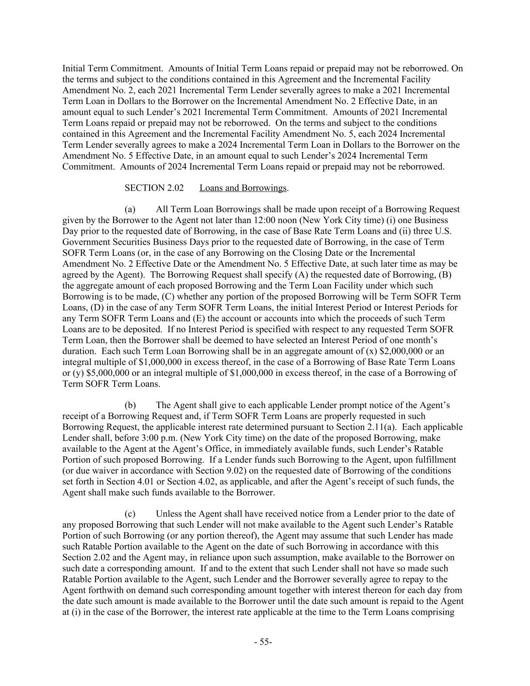 Initial Term Commitment. Amounts of Initial Term Loans repaid or prepaid may not be reborrowed. On the terms and subject to the conditions contained in this Agreement and the Incremental Facility Amendment No. 2, each 2021 Incremental Term Lender severally agrees to make a 2021 Incremental Term Loan in Dollars to the Borrower on the Incremental Amendment No. 2 Effective Date, in an amount equal to such Lender’s 2021 Incremental Term Commitment. Amounts of 2021 Incremental Term Loans repaid or prepaid may not be reborrowed. On the terms and subject to the conditions contained in this Agreement and the Incremental Facility Amendment No. 5, each 2024 Incremental Term Lender severally agrees to make a 2024 Incremental Term Loan in Dollars to the Borrower on the Amendment No. 5 Effective Date, in an amount equal to such Lender’s 2024 Incremental Term Commitment. Amounts of 2024 Incremental Term Loans repaid or prepaid may not be reborrowed. Loans and Borrowings.SECTION 2.02 All Term Loan Borrowings shall be made upon receipt of a Borrowing Request(a) given by the Borrower to the Agent not later than 12:00 noon (New York City time) (i) one Business Day prior to the requested date of Borrowing, in the case of Base Rate Term Loans and (ii) three U.S. Government Securities Business Days prior to the requested date of Borrowing, in the case of Term SOFR Term Loans (or, in the case of any Borrowing on the Closing Date or the Incremental Amendment No. 2 Effective Date or the Amendment No. 5 Effective Date, at such later time as may be agreed by the Agent). The Borrowing Request shall specify (A) the requested date of Borrowing, (B) the aggregate amount of each proposed Borrowing and the Term Loan Facility under which such Borrowing is to be made, (C) whether any portion of the proposed Borrowing will be Term SOFR Term Loans, (D) in the case of any Term SOFR Term Loans, the initial Interest Period or Interest Periods for any Term SOFR Term Loans and (E) the account or accounts into which the proceeds of such Term Loans are to be deposited. If no Interest Period is specified with respect to any requested Term SOFR Term Loan, then the Borrower shall be deemed to have selected an Interest Period of one month’s duration. Each such Term Loan Borrowing shall be in an aggregate amount of (x) $2,000,000 or an integral multiple of $1,000,000 in excess thereof, in the case of a Borrowing of Base Rate Term Loans or (y) $5,000,000 or an integral multiple of $1,000,000 in excess thereof, in the case of a Borrowing of Term SOFR Term Loans. The Agent shall give to each applicable Lender prompt notice of the Agent’s(b) receipt of a Borrowing Request and, if Term SOFR Term Loans are properly requested in such Borrowing Request, the applicable interest rate determined pursuant to Section 2.11(a). Each applicable Lender shall, before 3:00 p.m. (New York City time) on the date of the proposed Borrowing, make available to the Agent at the Agent’s Office, in immediately available funds, such Lender’s Ratable Portion of such proposed Borrowing. If a Lender funds such Borrowing to the Agent, upon fulfillment (or due waiver in accordance with Section 9.02) on the requested date of Borrowing of the conditions set forth in Section 4.01 or Section 4.02, as applicable, and after the Agent’s receipt of such funds, the Agent shall make such funds available to the Borrower. Unless the Agent shall have received notice from a Lender prior to the date of(c) any proposed Borrowing that such Lender will not make available to the Agent such Lender’s Ratable Portion of such Borrowing (or any portion thereof), the Agent may assume that such Lender has made such Ratable Portion available to the Agent on the date of such Borrowing in accordance with this Section 2.02 and the Agent may, in reliance upon such assumption, make available to the Borrower on such date a corresponding amount. If and to the extent that such Lender shall not have so made such Ratable Portion available to the Agent, such Lender and the Borrower severally agree to repay to the Agent forthwith on demand such corresponding amount together with interest thereon for each day from the date such amount is made available to the Borrower until the date such amount is repaid to the Agent at (i) in the case of the Borrower, the interest rate applicable at the time to the Term Loans comprising - 55-