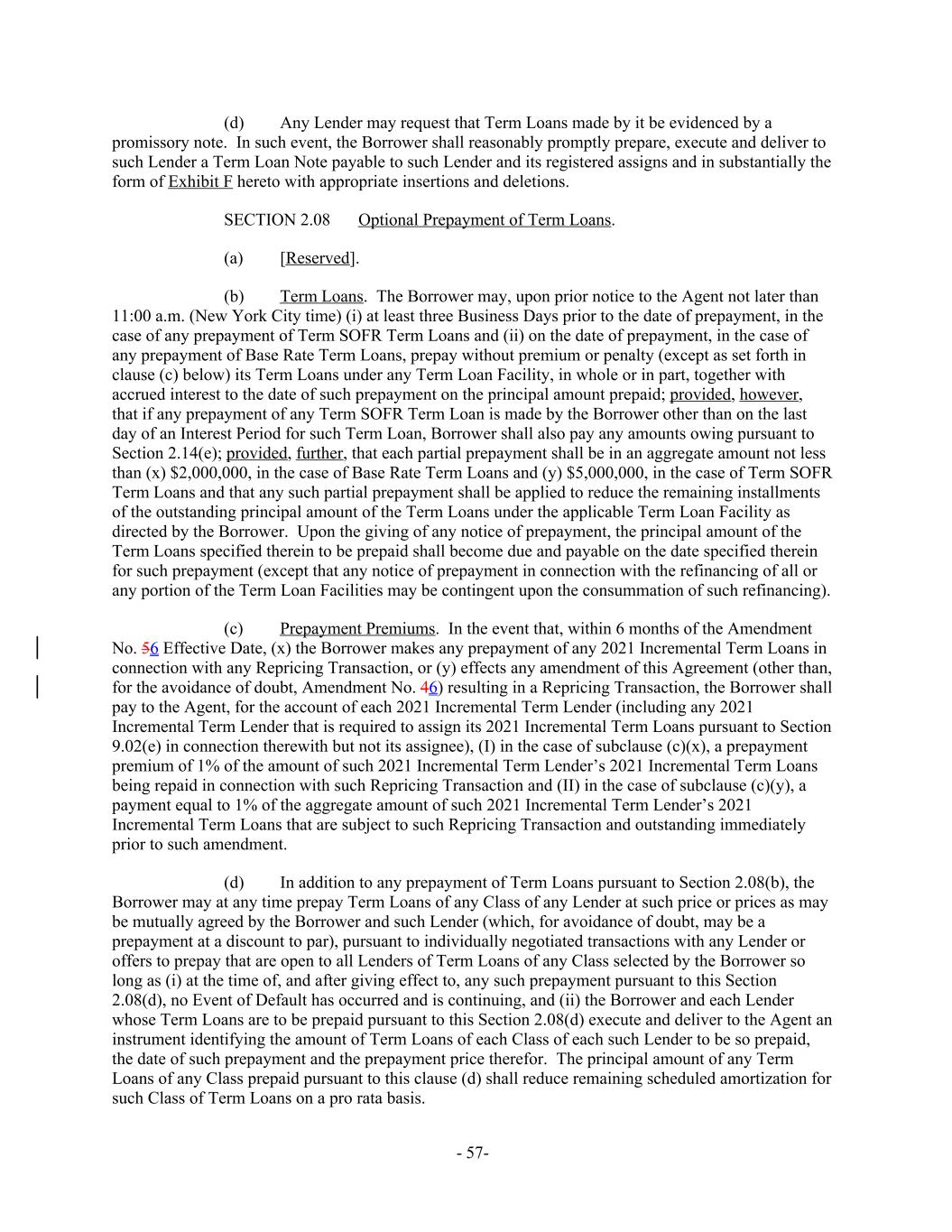 Any Lender may request that Term Loans made by it be evidenced by a(d) promissory note. In such event, the Borrower shall reasonably promptly prepare, execute and deliver to such Lender a Term Loan Note payable to such Lender and its registered assigns and in substantially the form of Exhibit F hereto with appropriate insertions and deletions. Optional Prepayment of Term Loans.SECTION 2.08 [Reserved].(a) Term Loans. The Borrower may, upon prior notice to the Agent not later than(b) 11:00 a.m. (New York City time) (i) at least three Business Days prior to the date of prepayment, in the case of any prepayment of Term SOFR Term Loans and (ii) on the date of prepayment, in the case of any prepayment of Base Rate Term Loans, prepay without premium or penalty (except as set forth in clause (c) below) its Term Loans under any Term Loan Facility, in whole or in part, together with accrued interest to the date of such prepayment on the principal amount prepaid; provided, however, that if any prepayment of any Term SOFR Term Loan is made by the Borrower other than on the last day of an Interest Period for such Term Loan, Borrower shall also pay any amounts owing pursuant to Section 2.14(e); provided, further, that each partial prepayment shall be in an aggregate amount not less than (x) $2,000,000, in the case of Base Rate Term Loans and (y) $5,000,000, in the case of Term SOFR Term Loans and that any such partial prepayment shall be applied to reduce the remaining installments of the outstanding principal amount of the Term Loans under the applicable Term Loan Facility as directed by the Borrower. Upon the giving of any notice of prepayment, the principal amount of the Term Loans specified therein to be prepaid shall become due and payable on the date specified therein for such prepayment (except that any notice of prepayment in connection with the refinancing of all or any portion of the Term Loan Facilities may be contingent upon the consummation of such refinancing). Prepayment Premiums. In the event that, within 6 months of the Amendment(c) No. 56 Effective Date, (x) the Borrower makes any prepayment of any 2021 Incremental Term Loans in connection with any Repricing Transaction, or (y) effects any amendment of this Agreement (other than, for the avoidance of doubt, Amendment No. 46) resulting in a Repricing Transaction, the Borrower shall pay to the Agent, for the account of each 2021 Incremental Term Lender (including any 2021 Incremental Term Lender that is required to assign its 2021 Incremental Term Loans pursuant to Section 9.02(e) in connection therewith but not its assignee), (I) in the case of subclause (c)(x), a prepayment premium of 1% of the amount of such 2021 Incremental Term Lender’s 2021 Incremental Term Loans being repaid in connection with such Repricing Transaction and (II) in the case of subclause (c)(y), a payment equal to 1% of the aggregate amount of such 2021 Incremental Term Lender’s 2021 Incremental Term Loans that are subject to such Repricing Transaction and outstanding immediately prior to such amendment. In addition to any prepayment of Term Loans pursuant to Section 2.08(b), the(d) Borrower may at any time prepay Term Loans of any Class of any Lender at such price or prices as may be mutually agreed by the Borrower and such Lender (which, for avoidance of doubt, may be a prepayment at a discount to par), pursuant to individually negotiated transactions with any Lender or offers to prepay that are open to all Lenders of Term Loans of any Class selected by the Borrower so long as (i) at the time of, and after giving effect to, any such prepayment pursuant to this Section 2.08(d), no Event of Default has occurred and is continuing, and (ii) the Borrower and each Lender whose Term Loans are to be prepaid pursuant to this Section 2.08(d) execute and deliver to the Agent an instrument identifying the amount of Term Loans of each Class of each such Lender to be so prepaid, the date of such prepayment and the prepayment price therefor. The principal amount of any Term Loans of any Class prepaid pursuant to this clause (d) shall reduce remaining scheduled amortization for such Class of Term Loans on a pro rata basis. - 57-