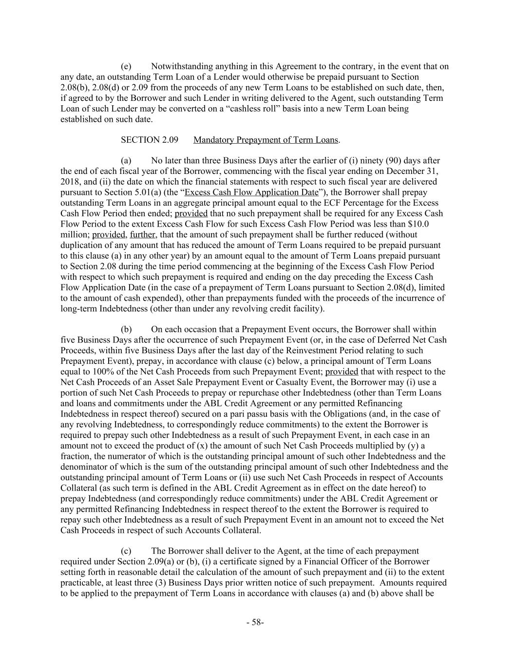 Notwithstanding anything in this Agreement to the contrary, in the event that on(e) any date, an outstanding Term Loan of a Lender would otherwise be prepaid pursuant to Section 2.08(b), 2.08(d) or 2.09 from the proceeds of any new Term Loans to be established on such date, then, if agreed to by the Borrower and such Lender in writing delivered to the Agent, such outstanding Term Loan of such Lender may be converted on a “cashless roll” basis into a new Term Loan being established on such date. Mandatory Prepayment of Term Loans.SECTION 2.09 No later than three Business Days after the earlier of (i) ninety (90) days after(a) the end of each fiscal year of the Borrower, commencing with the fiscal year ending on December 31, 2018, and (ii) the date on which the financial statements with respect to such fiscal year are delivered pursuant to Section 5.01(a) (the “Excess Cash Flow Application Date”), the Borrower shall prepay outstanding Term Loans in an aggregate principal amount equal to the ECF Percentage for the Excess Cash Flow Period then ended; provided that no such prepayment shall be required for any Excess Cash Flow Period to the extent Excess Cash Flow for such Excess Cash Flow Period was less than $10.0 million; provided, further, that the amount of such prepayment shall be further reduced (without duplication of any amount that has reduced the amount of Term Loans required to be prepaid pursuant to this clause (a) in any other year) by an amount equal to the amount of Term Loans prepaid pursuant to Section 2.08 during the time period commencing at the beginning of the Excess Cash Flow Period with respect to which such prepayment is required and ending on the day preceding the Excess Cash Flow Application Date (in the case of a prepayment of Term Loans pursuant to Section 2.08(d), limited to the amount of cash expended), other than prepayments funded with the proceeds of the incurrence of long-term Indebtedness (other than under any revolving credit facility). On each occasion that a Prepayment Event occurs, the Borrower shall within(b) five Business Days after the occurrence of such Prepayment Event (or, in the case of Deferred Net Cash Proceeds, within five Business Days after the last day of the Reinvestment Period relating to such Prepayment Event), prepay, in accordance with clause (c) below, a principal amount of Term Loans equal to 100% of the Net Cash Proceeds from such Prepayment Event; provided that with respect to the Net Cash Proceeds of an Asset Sale Prepayment Event or Casualty Event, the Borrower may (i) use a portion of such Net Cash Proceeds to prepay or repurchase other Indebtedness (other than Term Loans and loans and commitments under the ABL Credit Agreement or any permitted Refinancing Indebtedness in respect thereof) secured on a pari passu basis with the Obligations (and, in the case of any revolving Indebtedness, to correspondingly reduce commitments) to the extent the Borrower is required to prepay such other Indebtedness as a result of such Prepayment Event, in each case in an amount not to exceed the product of (x) the amount of such Net Cash Proceeds multiplied by (y) a fraction, the numerator of which is the outstanding principal amount of such other Indebtedness and the denominator of which is the sum of the outstanding principal amount of such other Indebtedness and the outstanding principal amount of Term Loans or (ii) use such Net Cash Proceeds in respect of Accounts Collateral (as such term is defined in the ABL Credit Agreement as in effect on the date hereof) to prepay Indebtedness (and correspondingly reduce commitments) under the ABL Credit Agreement or any permitted Refinancing Indebtedness in respect thereof to the extent the Borrower is required to repay such other Indebtedness as a result of such Prepayment Event in an amount not to exceed the Net Cash Proceeds in respect of such Accounts Collateral. The Borrower shall deliver to the Agent, at the time of each prepayment(c) required under Section 2.09(a) or (b), (i) a certificate signed by a Financial Officer of the Borrower setting forth in reasonable detail the calculation of the amount of such prepayment and (ii) to the extent practicable, at least three (3) Business Days prior written notice of such prepayment. Amounts required to be applied to the prepayment of Term Loans in accordance with clauses (a) and (b) above shall be - 58-