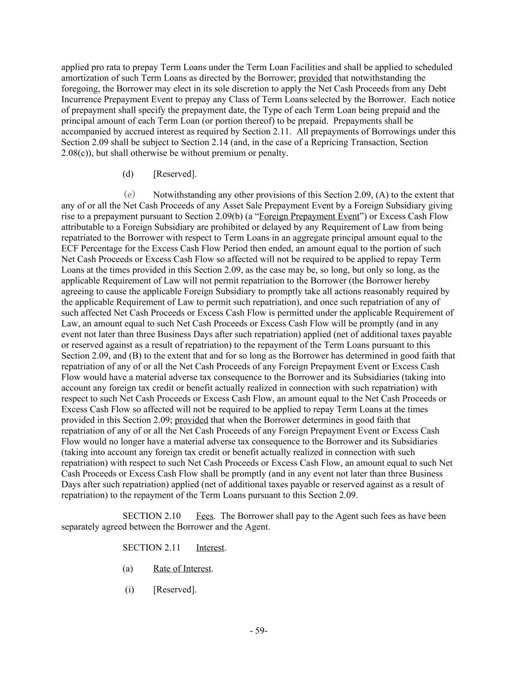 applied pro rata to prepay Term Loans under the Term Loan Facilities and shall be applied to scheduled amortization of such Term Loans as directed by the Borrower; provided that notwithstanding the foregoing, the Borrower may elect in its sole discretion to apply the Net Cash Proceeds from any Debt Incurrence Prepayment Event to prepay any Class of Term Loans selected by the Borrower. Each notice of prepayment shall specify the prepayment date, the Type of each Term Loan being prepaid and the principal amount of each Term Loan (or portion thereof) to be prepaid. Prepayments shall be accompanied by accrued interest as required by Section 2.11. All prepayments of Borrowings under this Section 2.09 shall be subject to Section 2.14 (and, in the case of a Repricing Transaction, Section 2.08(c)), but shall otherwise be without premium or penalty. [Reserved].(d) Notwithstanding any other provisions of this Section 2.09, (A) to the extent that(e) any of or all the Net Cash Proceeds of any Asset Sale Prepayment Event by a Foreign Subsidiary giving rise to a prepayment pursuant to Section 2.09(b) (a “Foreign Prepayment Event”) or Excess Cash Flow attributable to a Foreign Subsidiary are prohibited or delayed by any Requirement of Law from being repatriated to the Borrower with respect to Term Loans in an aggregate principal amount equal to the ECF Percentage for the Excess Cash Flow Period then ended, an amount equal to the portion of such Net Cash Proceeds or Excess Cash Flow so affected will not be required to be applied to repay Term Loans at the times provided in this Section 2.09, as the case may be, so long, but only so long, as the applicable Requirement of Law will not permit repatriation to the Borrower (the Borrower hereby agreeing to cause the applicable Foreign Subsidiary to promptly take all actions reasonably required by the applicable Requirement of Law to permit such repatriation), and once such repatriation of any of such affected Net Cash Proceeds or Excess Cash Flow is permitted under the applicable Requirement of Law, an amount equal to such Net Cash Proceeds or Excess Cash Flow will be promptly (and in any event not later than three Business Days after such repatriation) applied (net of additional taxes payable or reserved against as a result of repatriation) to the repayment of the Term Loans pursuant to this Section 2.09, and (B) to the extent that and for so long as the Borrower has determined in good faith that repatriation of any of or all the Net Cash Proceeds of any Foreign Prepayment Event or Excess Cash Flow would have a material adverse tax consequence to the Borrower and its Subsidiaries (taking into account any foreign tax credit or benefit actually realized in connection with such repatriation) with respect to such Net Cash Proceeds or Excess Cash Flow, an amount equal to the Net Cash Proceeds or Excess Cash Flow so affected will not be required to be applied to repay Term Loans at the times provided in this Section 2.09; provided that when the Borrower determines in good faith that repatriation of any of or all the Net Cash Proceeds of any Foreign Prepayment Event or Excess Cash Flow would no longer have a material adverse tax consequence to the Borrower and its Subsidiaries (taking into account any foreign tax credit or benefit actually realized in connection with such repatriation) with respect to such Net Cash Proceeds or Excess Cash Flow, an amount equal to such Net Cash Proceeds or Excess Cash Flow shall be promptly (and in any event not later than three Business Days after such repatriation) applied (net of additional taxes payable or reserved against as a result of repatriation) to the repayment of the Term Loans pursuant to this Section 2.09. Fees. The Borrower shall pay to the Agent such fees as have beenSECTION 2.10 separately agreed between the Borrower and the Agent. Interest.SECTION 2.11 Rate of Interest.(a) (i) [Reserved]. - 59-