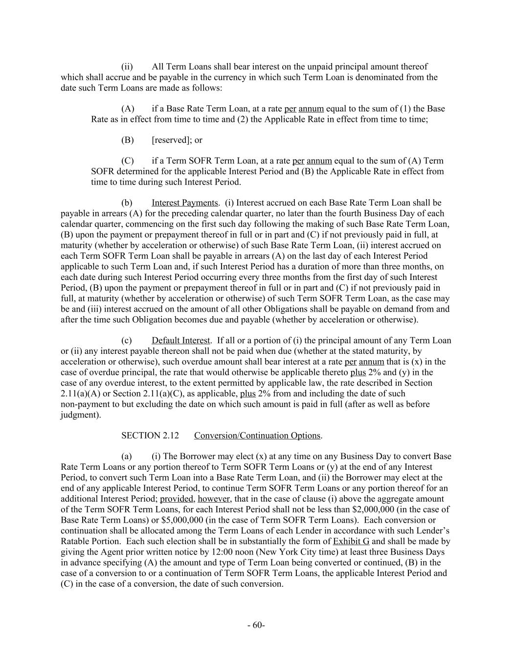 (ii) All Term Loans shall bear interest on the unpaid principal amount thereof which shall accrue and be payable in the currency in which such Term Loan is denominated from the date such Term Loans are made as follows: if a Base Rate Term Loan, at a rate per annum equal to the sum of (1) the Base(A) Rate as in effect from time to time and (2) the Applicable Rate in effect from time to time; [reserved]; or(B) if a Term SOFR Term Loan, at a rate per annum equal to the sum of (A) Term(C) SOFR determined for the applicable Interest Period and (B) the Applicable Rate in effect from time to time during such Interest Period. Interest Payments. (i) Interest accrued on each Base Rate Term Loan shall be(b) payable in arrears (A) for the preceding calendar quarter, no later than the fourth Business Day of each calendar quarter, commencing on the first such day following the making of such Base Rate Term Loan, (B) upon the payment or prepayment thereof in full or in part and (C) if not previously paid in full, at maturity (whether by acceleration or otherwise) of such Base Rate Term Loan, (ii) interest accrued on each Term SOFR Term Loan shall be payable in arrears (A) on the last day of each Interest Period applicable to such Term Loan and, if such Interest Period has a duration of more than three months, on each date during such Interest Period occurring every three months from the first day of such Interest Period, (B) upon the payment or prepayment thereof in full or in part and (C) if not previously paid in full, at maturity (whether by acceleration or otherwise) of such Term SOFR Term Loan, as the case may be and (iii) interest accrued on the amount of all other Obligations shall be payable on demand from and after the time such Obligation becomes due and payable (whether by acceleration or otherwise). Default Interest. If all or a portion of (i) the principal amount of any Term Loan(c) or (ii) any interest payable thereon shall not be paid when due (whether at the stated maturity, by acceleration or otherwise), such overdue amount shall bear interest at a rate per annum that is (x) in the case of overdue principal, the rate that would otherwise be applicable thereto plus 2% and (y) in the case of any overdue interest, to the extent permitted by applicable law, the rate described in Section 2.11(a)(A) or Section 2.11(a)(C), as applicable, plus 2% from and including the date of such non-payment to but excluding the date on which such amount is paid in full (after as well as before judgment). Conversion/Continuation Options.SECTION 2.12 (i) The Borrower may elect (x) at any time on any Business Day to convert Base(a) Rate Term Loans or any portion thereof to Term SOFR Term Loans or (y) at the end of any Interest Period, to convert such Term Loan into a Base Rate Term Loan, and (ii) the Borrower may elect at the end of any applicable Interest Period, to continue Term SOFR Term Loans or any portion thereof for an additional Interest Period; provided, however, that in the case of clause (i) above the aggregate amount of the Term SOFR Term Loans, for each Interest Period shall not be less than $2,000,000 (in the case of Base Rate Term Loans) or $5,000,000 (in the case of Term SOFR Term Loans). Each conversion or continuation shall be allocated among the Term Loans of each Lender in accordance with such Lender’s Ratable Portion. Each such election shall be in substantially the form of Exhibit G and shall be made by giving the Agent prior written notice by 12:00 noon (New York City time) at least three Business Days in advance specifying (A) the amount and type of Term Loan being converted or continued, (B) in the case of a conversion to or a continuation of Term SOFR Term Loans, the applicable Interest Period and (C) in the case of a conversion, the date of such conversion. - 60-
