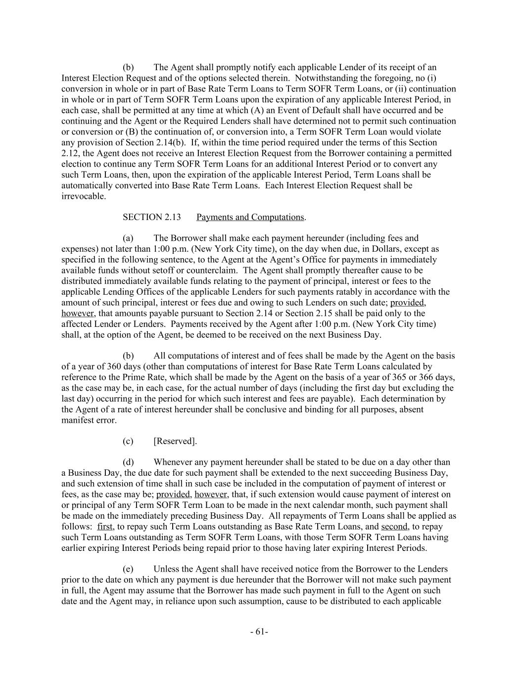 The Agent shall promptly notify each applicable Lender of its receipt of an(b) Interest Election Request and of the options selected therein. Notwithstanding the foregoing, no (i) conversion in whole or in part of Base Rate Term Loans to Term SOFR Term Loans, or (ii) continuation in whole or in part of Term SOFR Term Loans upon the expiration of any applicable Interest Period, in each case, shall be permitted at any time at which (A) an Event of Default shall have occurred and be continuing and the Agent or the Required Lenders shall have determined not to permit such continuation or conversion or (B) the continuation of, or conversion into, a Term SOFR Term Loan would violate any provision of Section 2.14(b). If, within the time period required under the terms of this Section 2.12, the Agent does not receive an Interest Election Request from the Borrower containing a permitted election to continue any Term SOFR Term Loans for an additional Interest Period or to convert any such Term Loans, then, upon the expiration of the applicable Interest Period, Term Loans shall be automatically converted into Base Rate Term Loans. Each Interest Election Request shall be irrevocable. Payments and Computations.SECTION 2.13 The Borrower shall make each payment hereunder (including fees and(a) expenses) not later than 1:00 p.m. (New York City time), on the day when due, in Dollars, except as specified in the following sentence, to the Agent at the Agent’s Office for payments in immediately available funds without setoff or counterclaim. The Agent shall promptly thereafter cause to be distributed immediately available funds relating to the payment of principal, interest or fees to the applicable Lending Offices of the applicable Lenders for such payments ratably in accordance with the amount of such principal, interest or fees due and owing to such Lenders on such date; provided, however, that amounts payable pursuant to Section 2.14 or Section 2.15 shall be paid only to the affected Lender or Lenders. Payments received by the Agent after 1:00 p.m. (New York City time) shall, at the option of the Agent, be deemed to be received on the next Business Day. All computations of interest and of fees shall be made by the Agent on the basis(b) of a year of 360 days (other than computations of interest for Base Rate Term Loans calculated by reference to the Prime Rate, which shall be made by the Agent on the basis of a year of 365 or 366 days, as the case may be, in each case, for the actual number of days (including the first day but excluding the last day) occurring in the period for which such interest and fees are payable). Each determination by the Agent of a rate of interest hereunder shall be conclusive and binding for all purposes, absent manifest error. [Reserved].(c) Whenever any payment hereunder shall be stated to be due on a day other than(d) a Business Day, the due date for such payment shall be extended to the next succeeding Business Day, and such extension of time shall in such case be included in the computation of payment of interest or fees, as the case may be; provided, however, that, if such extension would cause payment of interest on or principal of any Term SOFR Term Loan to be made in the next calendar month, such payment shall be made on the immediately preceding Business Day. All repayments of Term Loans shall be applied as follows: first, to repay such Term Loans outstanding as Base Rate Term Loans, and second, to repay such Term Loans outstanding as Term SOFR Term Loans, with those Term SOFR Term Loans having earlier expiring Interest Periods being repaid prior to those having later expiring Interest Periods. Unless the Agent shall have received notice from the Borrower to the Lenders(e) prior to the date on which any payment is due hereunder that the Borrower will not make such payment in full, the Agent may assume that the Borrower has made such payment in full to the Agent on such date and the Agent may, in reliance upon such assumption, cause to be distributed to each applicable - 61-