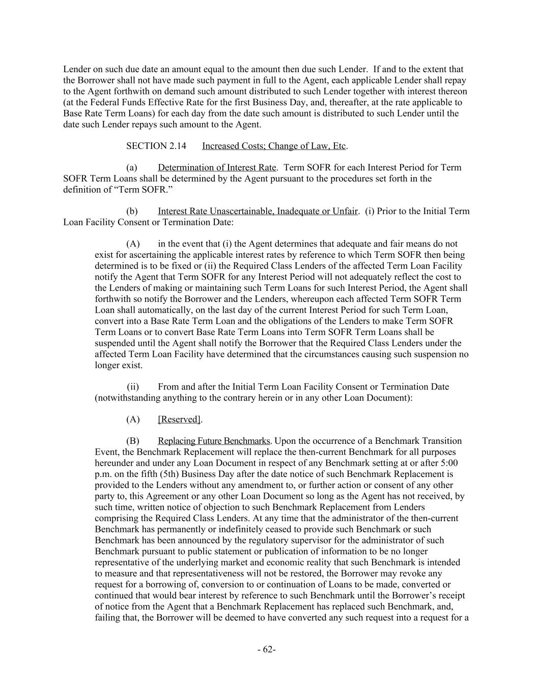 Lender on such due date an amount equal to the amount then due such Lender. If and to the extent that the Borrower shall not have made such payment in full to the Agent, each applicable Lender shall repay to the Agent forthwith on demand such amount distributed to such Lender together with interest thereon (at the Federal Funds Effective Rate for the first Business Day, and, thereafter, at the rate applicable to Base Rate Term Loans) for each day from the date such amount is distributed to such Lender until the date such Lender repays such amount to the Agent. Increased Costs; Change of Law, Etc.SECTION 2.14 Determination of Interest Rate. Term SOFR for each Interest Period for Term(a) SOFR Term Loans shall be determined by the Agent pursuant to the procedures set forth in the definition of “Term SOFR.” Interest Rate Unascertainable, Inadequate or Unfair. (i) Prior to the Initial Term(b) Loan Facility Consent or Termination Date: in the event that (i) the Agent determines that adequate and fair means do not(A) exist for ascertaining the applicable interest rates by reference to which Term SOFR then being determined is to be fixed or (ii) the Required Class Lenders of the affected Term Loan Facility notify the Agent that Term SOFR for any Interest Period will not adequately reflect the cost to the Lenders of making or maintaining such Term Loans for such Interest Period, the Agent shall forthwith so notify the Borrower and the Lenders, whereupon each affected Term SOFR Term Loan shall automatically, on the last day of the current Interest Period for such Term Loan, convert into a Base Rate Term Loan and the obligations of the Lenders to make Term SOFR Term Loans or to convert Base Rate Term Loans into Term SOFR Term Loans shall be suspended until the Agent shall notify the Borrower that the Required Class Lenders under the affected Term Loan Facility have determined that the circumstances causing such suspension no longer exist. From and after the Initial Term Loan Facility Consent or Termination Date(ii) (notwithstanding anything to the contrary herein or in any other Loan Document): [Reserved].(A) Replacing Future Benchmarks. Upon the occurrence of a Benchmark Transition(B) Event, the Benchmark Replacement will replace the then-current Benchmark for all purposes hereunder and under any Loan Document in respect of any Benchmark setting at or after 5:00 p.m. on the fifth (5th) Business Day after the date notice of such Benchmark Replacement is provided to the Lenders without any amendment to, or further action or consent of any other party to, this Agreement or any other Loan Document so long as the Agent has not received, by such time, written notice of objection to such Benchmark Replacement from Lenders comprising the Required Class Lenders. At any time that the administrator of the then-current Benchmark has permanently or indefinitely ceased to provide such Benchmark or such Benchmark has been announced by the regulatory supervisor for the administrator of such Benchmark pursuant to public statement or publication of information to be no longer representative of the underlying market and economic reality that such Benchmark is intended to measure and that representativeness will not be restored, the Borrower may revoke any request for a borrowing of, conversion to or continuation of Loans to be made, converted or continued that would bear interest by reference to such Benchmark until the Borrower’s receipt of notice from the Agent that a Benchmark Replacement has replaced such Benchmark, and, failing that, the Borrower will be deemed to have converted any such request into a request for a - 62-