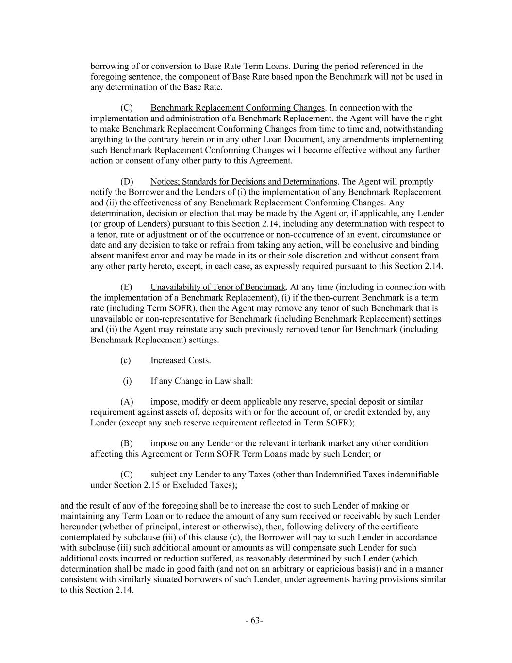 borrowing of or conversion to Base Rate Term Loans. During the period referenced in the foregoing sentence, the component of Base Rate based upon the Benchmark will not be used in any determination of the Base Rate. Benchmark Replacement Conforming Changes. In connection with the(C) implementation and administration of a Benchmark Replacement, the Agent will have the right to make Benchmark Replacement Conforming Changes from time to time and, notwithstanding anything to the contrary herein or in any other Loan Document, any amendments implementing such Benchmark Replacement Conforming Changes will become effective without any further action or consent of any other party to this Agreement. Notices; Standards for Decisions and Determinations. The Agent will promptly(D) notify the Borrower and the Lenders of (i) the implementation of any Benchmark Replacement and (ii) the effectiveness of any Benchmark Replacement Conforming Changes. Any determination, decision or election that may be made by the Agent or, if applicable, any Lender (or group of Lenders) pursuant to this Section 2.14, including any determination with respect to a tenor, rate or adjustment or of the occurrence or non-occurrence of an event, circumstance or date and any decision to take or refrain from taking any action, will be conclusive and binding absent manifest error and may be made in its or their sole discretion and without consent from any other party hereto, except, in each case, as expressly required pursuant to this Section 2.14. Unavailability of Tenor of Benchmark. At any time (including in connection with(E) the implementation of a Benchmark Replacement), (i) if the then-current Benchmark is a term rate (including Term SOFR), then the Agent may remove any tenor of such Benchmark that is unavailable or non-representative for Benchmark (including Benchmark Replacement) settings and (ii) the Agent may reinstate any such previously removed tenor for Benchmark (including Benchmark Replacement) settings. Increased Costs.(c) (i) If any Change in Law shall: impose, modify or deem applicable any reserve, special deposit or similar(A) requirement against assets of, deposits with or for the account of, or credit extended by, any Lender (except any such reserve requirement reflected in Term SOFR); impose on any Lender or the relevant interbank market any other condition(B) affecting this Agreement or Term SOFR Term Loans made by such Lender; or subject any Lender to any Taxes (other than Indemnified Taxes indemnifiable(C) under Section 2.15 or Excluded Taxes); and the result of any of the foregoing shall be to increase the cost to such Lender of making or maintaining any Term Loan or to reduce the amount of any sum received or receivable by such Lender hereunder (whether of principal, interest or otherwise), then, following delivery of the certificate contemplated by subclause (iii) of this clause (c), the Borrower will pay to such Lender in accordance with subclause (iii) such additional amount or amounts as will compensate such Lender for such additional costs incurred or reduction suffered, as reasonably determined by such Lender (which determination shall be made in good faith (and not on an arbitrary or capricious basis)) and in a manner consistent with similarly situated borrowers of such Lender, under agreements having provisions similar to this Section 2.14. - 63-