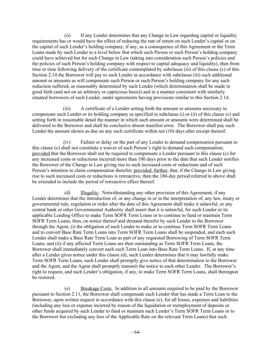(ii) If any Lender determines that any Change in Law regarding capital or liquidity requirements has or would have the effect of reducing the rate of return on such Lender’s capital or on the capital of such Lender’s holding company, if any, as a consequence of this Agreement or the Term Loans made by such Lender to a level below that which such Person or such Person’s holding company could have achieved but for such Change in Law (taking into consideration such Person’s policies and the policies of such Person’s holding company with respect to capital adequacy and liquidity), then from time to time following delivery of the certificate contemplated by subclause (iii) of this clause (c) of this Section 2.14 the Borrower will pay to such Lender in accordance with subclause (iii) such additional amount or amounts as will compensate such Person or such Person’s holding company for any such reduction suffered, as reasonably determined by such Lender (which determination shall be made in good faith (and not on an arbitrary or capricious basis)) and in a manner consistent with similarly situated borrowers of such Lender, under agreements having provisions similar to this Section 2.14. (iii) A certificate of a Lender setting forth the amount or amounts necessary to compensate such Lender or its holding company as specified in subclause (i) or (ii) of this clause (c) and setting forth in reasonable detail the manner in which such amount or amounts were determined shall be delivered to the Borrower and shall be conclusive absent manifest error. The Borrower shall pay such Lender the amount shown as due on any such certificate within ten (10) days after receipt thereof. (iv) Failure or delay on the part of any Lender to demand compensation pursuant to this clause (c) shall not constitute a waiver of such Person’s right to demand such compensation; provided that the Borrower shall not be required to compensate a Lender pursuant to this clause (c) for any increased costs or reductions incurred more than 180 days prior to the date that such Lender notifies the Borrower of the Change in Law giving rise to such increased costs or reductions and of such Person’s intention to claim compensation therefor; provided, further, that, if the Change in Law giving rise to such increased costs or reductions is retroactive, then the 180-day period referred to above shall be extended to include the period of retroactive effect thereof. Illegality. Notwithstanding any other provision of this Agreement, if any(d) Lender determines that the introduction of, or any change in or in the interpretation of, any law, treaty or governmental rule, regulation or order after the date of this Agreement shall make it unlawful, or any central bank or other Governmental Authority shall assert that it is unlawful, for such Lender or its applicable Lending Office to make Term SOFR Term Loans or to continue to fund or maintain Term SOFR Term Loans, then, on notice thereof and demand therefor by such Lender to the Borrower through the Agent, (i) the obligation of such Lender to make or to continue Term SOFR Term Loans and to convert Base Rate Term Loans into Term SOFR Term Loans shall be suspended, and each such Lender shall make a Base Rate Term Loan as part of any requested Borrowing of Term SOFR Term Loans, and (ii) if any affected Term Loans are then outstanding as Term SOFR Term Loans, the Borrower shall immediately convert each such Term Loan into Base Rate Term Loans. If, at any time after a Lender gives notice under this clause (d), such Lender determines that it may lawfully make Term SOFR Term Loans, such Lender shall promptly give notice of that determination to the Borrower and the Agent, and the Agent shall promptly transmit the notice to each other Lender. The Borrower’s right to request, and such Lender’s obligation, if any, to make Term SOFR Term Loans, shall thereupon be restored. Breakage Costs. In addition to all amounts required to be paid by the Borrower(e) pursuant to Section 2.11, the Borrower shall compensate each Lender that has made a Term Loan to the Borrower, upon written request in accordance with this clause (e), for all losses, expenses and liabilities (including any loss or expense incurred by reason of the liquidation or reemployment of deposits or other funds acquired by such Lender to fund or maintain such Lender’s Term SOFR Term Loans or to the Borrower but excluding any loss of the Applicable Rate on the relevant Term Loans) that such - 64-