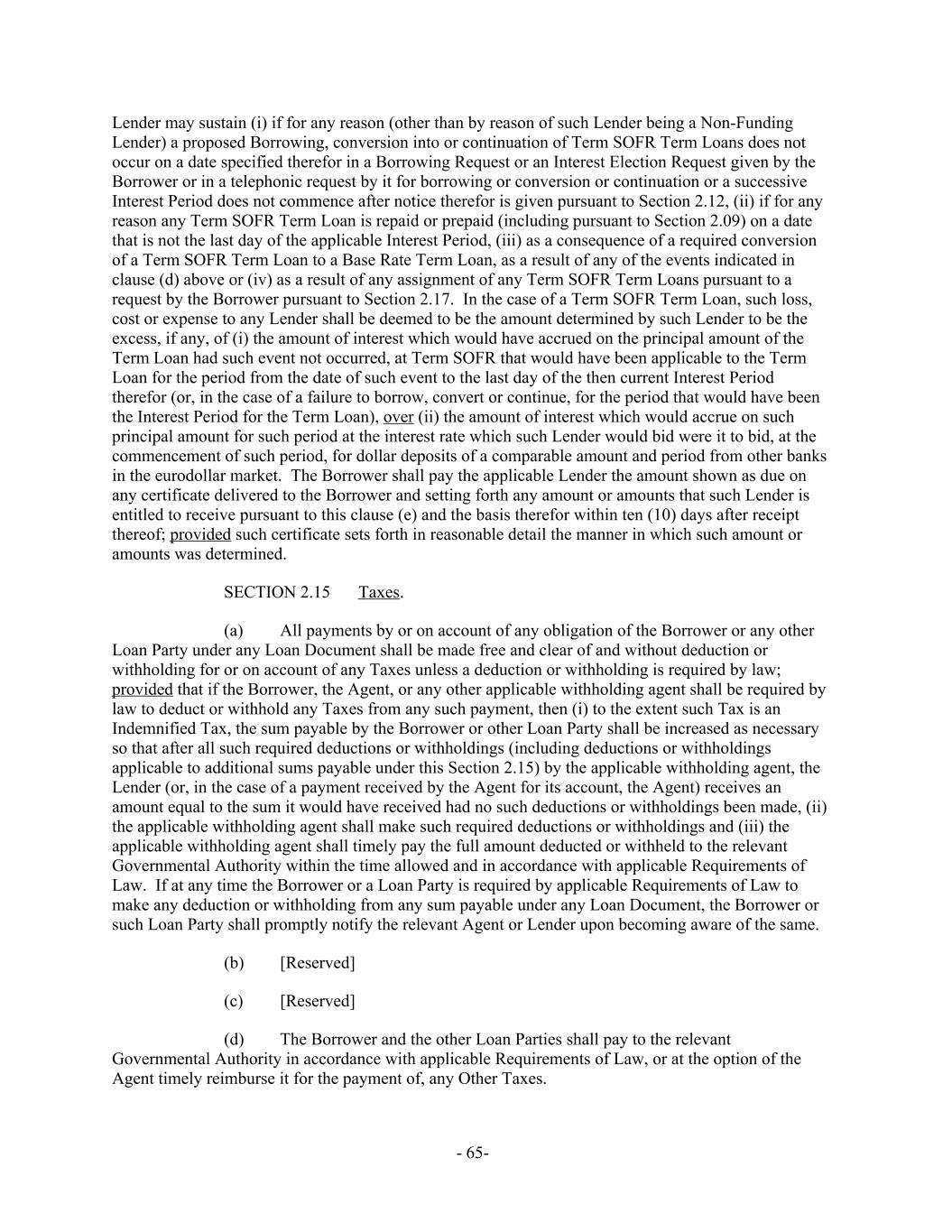 Lender may sustain (i) if for any reason (other than by reason of such Lender being a Non-Funding Lender) a proposed Borrowing, conversion into or continuation of Term SOFR Term Loans does not occur on a date specified therefor in a Borrowing Request or an Interest Election Request given by the Borrower or in a telephonic request by it for borrowing or conversion or continuation or a successive Interest Period does not commence after notice therefor is given pursuant to Section 2.12, (ii) if for any reason any Term SOFR Term Loan is repaid or prepaid (including pursuant to Section 2.09) on a date that is not the last day of the applicable Interest Period, (iii) as a consequence of a required conversion of a Term SOFR Term Loan to a Base Rate Term Loan, as a result of any of the events indicated in clause (d) above or (iv) as a result of any assignment of any Term SOFR Term Loans pursuant to a request by the Borrower pursuant to Section 2.17. In the case of a Term SOFR Term Loan, such loss, cost or expense to any Lender shall be deemed to be the amount determined by such Lender to be the excess, if any, of (i) the amount of interest which would have accrued on the principal amount of the Term Loan had such event not occurred, at Term SOFR that would have been applicable to the Term Loan for the period from the date of such event to the last day of the then current Interest Period therefor (or, in the case of a failure to borrow, convert or continue, for the period that would have been the Interest Period for the Term Loan), over (ii) the amount of interest which would accrue on such principal amount for such period at the interest rate which such Lender would bid were it to bid, at the commencement of such period, for dollar deposits of a comparable amount and period from other banks in the eurodollar market. The Borrower shall pay the applicable Lender the amount shown as due on any certificate delivered to the Borrower and setting forth any amount or amounts that such Lender is entitled to receive pursuant to this clause (e) and the basis therefor within ten (10) days after receipt thereof; provided such certificate sets forth in reasonable detail the manner in which such amount or amounts was determined. Taxes.SECTION 2.15 All payments by or on account of any obligation of the Borrower or any other(a) Loan Party under any Loan Document shall be made free and clear of and without deduction or withholding for or on account of any Taxes unless a deduction or withholding is required by law; provided that if the Borrower, the Agent, or any other applicable withholding agent shall be required by law to deduct or withhold any Taxes from any such payment, then (i) to the extent such Tax is an Indemnified Tax, the sum payable by the Borrower or other Loan Party shall be increased as necessary so that after all such required deductions or withholdings (including deductions or withholdings applicable to additional sums payable under this Section 2.15) by the applicable withholding agent, the Lender (or, in the case of a payment received by the Agent for its account, the Agent) receives an amount equal to the sum it would have received had no such deductions or withholdings been made, (ii) the applicable withholding agent shall make such required deductions or withholdings and (iii) the applicable withholding agent shall timely pay the full amount deducted or withheld to the relevant Governmental Authority within the time allowed and in accordance with applicable Requirements of Law. If at any time the Borrower or a Loan Party is required by applicable Requirements of Law to make any deduction or withholding from any sum payable under any Loan Document, the Borrower or such Loan Party shall promptly notify the relevant Agent or Lender upon becoming aware of the same. [Reserved](b) [Reserved](c) The Borrower and the other Loan Parties shall pay to the relevant(d) Governmental Authority in accordance with applicable Requirements of Law, or at the option of the Agent timely reimburse it for the payment of, any Other Taxes. - 65-