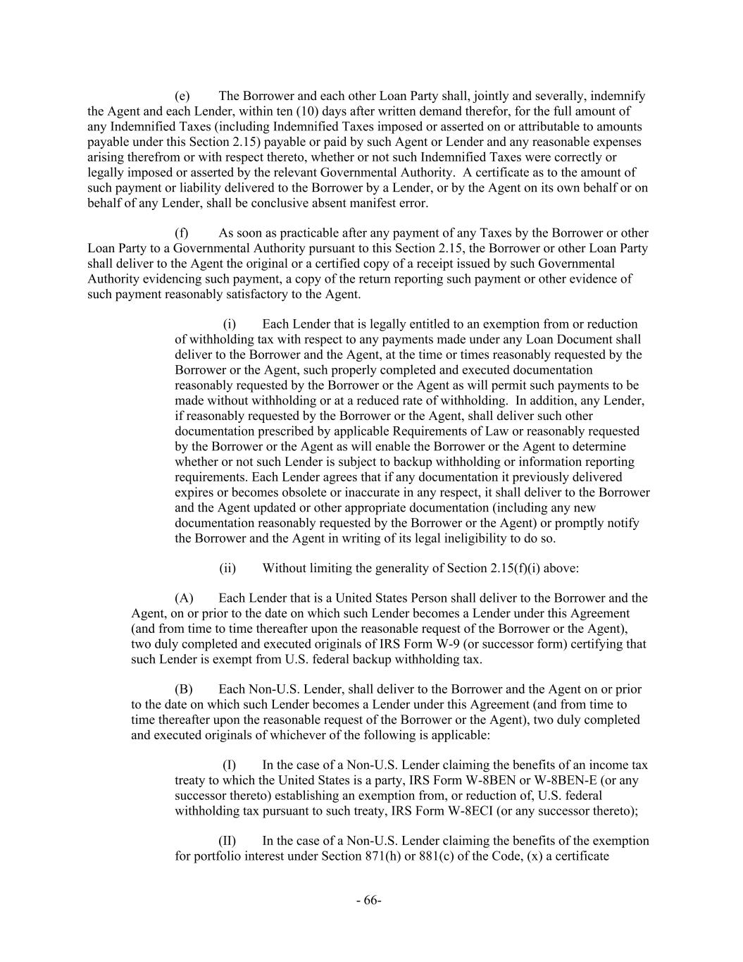 The Borrower and each other Loan Party shall, jointly and severally, indemnify(e) the Agent and each Lender, within ten (10) days after written demand therefor, for the full amount of any Indemnified Taxes (including Indemnified Taxes imposed or asserted on or attributable to amounts payable under this Section 2.15) payable or paid by such Agent or Lender and any reasonable expenses arising therefrom or with respect thereto, whether or not such Indemnified Taxes were correctly or legally imposed or asserted by the relevant Governmental Authority. A certificate as to the amount of such payment or liability delivered to the Borrower by a Lender, or by the Agent on its own behalf or on behalf of any Lender, shall be conclusive absent manifest error. As soon as practicable after any payment of any Taxes by the Borrower or other(f) Loan Party to a Governmental Authority pursuant to this Section 2.15, the Borrower or other Loan Party shall deliver to the Agent the original or a certified copy of a receipt issued by such Governmental Authority evidencing such payment, a copy of the return reporting such payment or other evidence of such payment reasonably satisfactory to the Agent. (i) Each Lender that is legally entitled to an exemption from or reduction of withholding tax with respect to any payments made under any Loan Document shall deliver to the Borrower and the Agent, at the time or times reasonably requested by the Borrower or the Agent, such properly completed and executed documentation reasonably requested by the Borrower or the Agent as will permit such payments to be made without withholding or at a reduced rate of withholding. In addition, any Lender, if reasonably requested by the Borrower or the Agent, shall deliver such other documentation prescribed by applicable Requirements of Law or reasonably requested by the Borrower or the Agent as will enable the Borrower or the Agent to determine whether or not such Lender is subject to backup withholding or information reporting requirements. Each Lender agrees that if any documentation it previously delivered expires or becomes obsolete or inaccurate in any respect, it shall deliver to the Borrower and the Agent updated or other appropriate documentation (including any new documentation reasonably requested by the Borrower or the Agent) or promptly notify the Borrower and the Agent in writing of its legal ineligibility to do so. (ii) Without limiting the generality of Section 2.15(f)(i) above: Each Lender that is a United States Person shall deliver to the Borrower and the(A) Agent, on or prior to the date on which such Lender becomes a Lender under this Agreement (and from time to time thereafter upon the reasonable request of the Borrower or the Agent), two duly completed and executed originals of IRS Form W-9 (or successor form) certifying that such Lender is exempt from U.S. federal backup withholding tax. Each Non-U.S. Lender, shall deliver to the Borrower and the Agent on or prior(B) to the date on which such Lender becomes a Lender under this Agreement (and from time to time thereafter upon the reasonable request of the Borrower or the Agent), two duly completed and executed originals of whichever of the following is applicable: In the case of a Non-U.S. Lender claiming the benefits of an income tax(I) treaty to which the United States is a party, IRS Form W-8BEN or W-8BEN-E (or any successor thereto) establishing an exemption from, or reduction of, U.S. federal withholding tax pursuant to such treaty, IRS Form W-8ECI (or any successor thereto); In the case of a Non-U.S. Lender claiming the benefits of the exemption(II) for portfolio interest under Section 871(h) or 881(c) of the Code, (x) a certificate - 66-