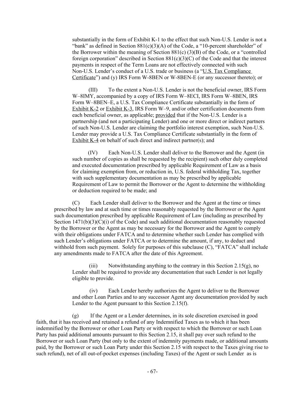 substantially in the form of Exhibit K-1 to the effect that such Non-U.S. Lender is not a “bank” as defined in Section 881(c)(3)(A) of the Code, a “10-percent shareholder” of the Borrower within the meaning of Section 881(c) (3)(B) of the Code, or a “controlled foreign corporation” described in Section 881(c)(3)(C) of the Code and that the interest payments in respect of the Term Loans are not effectively connected with such Non-U.S. Lender’s conduct of a U.S. trade or business (a “U.S. Tax Compliance Certificate”) and (y) IRS Form W-8BEN or W-8BEN-E (or any successor thereto); or To the extent a Non-U.S. Lender is not the beneficial owner, IRS Form(III) W–8IMY, accompanied by a copy of IRS Form W–8ECI, IRS Form W–8BEN, IRS Form W–8BEN–E, a U.S. Tax Compliance Certificate substantially in the form of Exhibit K-2 or Exhibit K-3, IRS Form W–9, and/or other certification documents from each beneficial owner, as applicable; provided that if the Non-U.S. Lender is a partnership (and not a participating Lender) and one or more direct or indirect partners of such Non-U.S. Lender are claiming the portfolio interest exemption, such Non-U.S. Lender may provide a U.S. Tax Compliance Certificate substantially in the form of Exhibit K-4 on behalf of such direct and indirect partner(s); and Each Non-U.S. Lender shall deliver to the Borrower and the Agent (in(IV) such number of copies as shall be requested by the recipient) such other duly completed and executed documentation prescribed by applicable Requirement of Law as a basis for claiming exemption from, or reduction in, U.S. federal withholding Tax, together with such supplementary documentation as may be prescribed by applicable Requirement of Law to permit the Borrower or the Agent to determine the withholding or deduction required to be made; and Each Lender shall deliver to the Borrower and the Agent at the time or times(C) prescribed by law and at such time or times reasonably requested by the Borrower or the Agent such documentation prescribed by applicable Requirement of Law (including as prescribed by Section 1471(b)(3)(C)(i) of the Code) and such additional documentation reasonably requested by the Borrower or the Agent as may be necessary for the Borrower and the Agent to comply with their obligations under FATCA and to determine whether such Lender has complied with such Lender’s obligations under FATCA or to determine the amount, if any, to deduct and withhold from such payment. Solely for purposes of this subclause (C), “FATCA” shall include any amendments made to FATCA after the date of this Agreement. (iii) Notwithstanding anything to the contrary in this Section 2.15(g), no Lender shall be required to provide any documentation that such Lender is not legally eligible to provide. (iv) Each Lender hereby authorizes the Agent to deliver to the Borrower and other Loan Parties and to any successor Agent any documentation provided by such Lender to the Agent pursuant to this Section 2.15(f). If the Agent or a Lender determines, in its sole discretion exercised in good(g) faith, that it has received and retained a refund of any Indemnified Taxes as to which it has been indemnified by the Borrower or other Loan Party or with respect to which the Borrower or such Loan Party has paid additional amounts pursuant to this Section 2.15, it shall pay over such refund to the Borrower or such Loan Party (but only to the extent of indemnity payments made, or additional amounts paid, by the Borrower or such Loan Party under this Section 2.15 with respect to the Taxes giving rise to such refund), net of all out-of-pocket expenses (including Taxes) of the Agent or such Lender as is - 67-