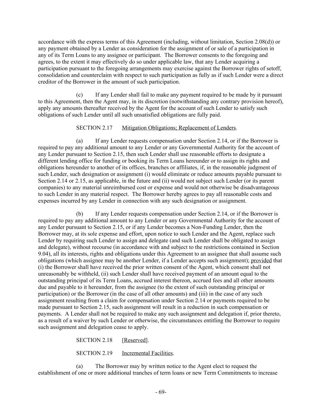 accordance with the express terms of this Agreement (including, without limitation, Section 2.08(d)) or any payment obtained by a Lender as consideration for the assignment of or sale of a participation in any of its Term Loans to any assignee or participant. The Borrower consents to the foregoing and agrees, to the extent it may effectively do so under applicable law, that any Lender acquiring a participation pursuant to the foregoing arrangements may exercise against the Borrower rights of setoff, consolidation and counterclaim with respect to such participation as fully as if such Lender were a direct creditor of the Borrower in the amount of such participation. If any Lender shall fail to make any payment required to be made by it pursuant(c) to this Agreement, then the Agent may, in its discretion (notwithstanding any contrary provision hereof), apply any amounts thereafter received by the Agent for the account of such Lender to satisfy such obligations of such Lender until all such unsatisfied obligations are fully paid. Mitigation Obligations; Replacement of Lenders.SECTION 2.17 If any Lender requests compensation under Section 2.14, or if the Borrower is(a) required to pay any additional amount to any Lender or any Governmental Authority for the account of any Lender pursuant to Section 2.15, then such Lender shall use reasonable efforts to designate a different lending office for funding or booking its Term Loans hereunder or to assign its rights and obligations hereunder to another of its offices, branches or affiliates, if, in the reasonable judgment of such Lender, such designation or assignment (i) would eliminate or reduce amounts payable pursuant to Section 2.14 or 2.15, as applicable, in the future and (ii) would not subject such Lender (or its parent companies) to any material unreimbursed cost or expense and would not otherwise be disadvantageous to such Lender in any material respect. The Borrower hereby agrees to pay all reasonable costs and expenses incurred by any Lender in connection with any such designation or assignment. If any Lender requests compensation under Section 2.14, or if the Borrower is(b) required to pay any additional amount to any Lender or any Governmental Authority for the account of any Lender pursuant to Section 2.15, or if any Lender becomes a Non-Funding Lender, then the Borrower may, at its sole expense and effort, upon notice to such Lender and the Agent, replace such Lender by requiring such Lender to assign and delegate (and such Lender shall be obligated to assign and delegate), without recourse (in accordance with and subject to the restrictions contained in Section 9.04), all its interests, rights and obligations under this Agreement to an assignee that shall assume such obligations (which assignee may be another Lender, if a Lender accepts such assignment); provided that (i) the Borrower shall have received the prior written consent of the Agent, which consent shall not unreasonably be withheld, (ii) such Lender shall have received payment of an amount equal to the outstanding principal of its Term Loans, accrued interest thereon, accrued fees and all other amounts due and payable to it hereunder, from the assignee (to the extent of such outstanding principal or participation) or the Borrower (in the case of all other amounts) and (iii) in the case of any such assignment resulting from a claim for compensation under Section 2.14 or payments required to be made pursuant to Section 2.15, such assignment will result in a reduction in such compensation or payments. A Lender shall not be required to make any such assignment and delegation if, prior thereto, as a result of a waiver by such Lender or otherwise, the circumstances entitling the Borrower to require such assignment and delegation cease to apply. [Reserved].SECTION 2.18 Incremental Facilities.SECTION 2.19 The Borrower may by written notice to the Agent elect to request the(a) establishment of one or more additional tranches of term loans or new Term Commitments to increase - 69-