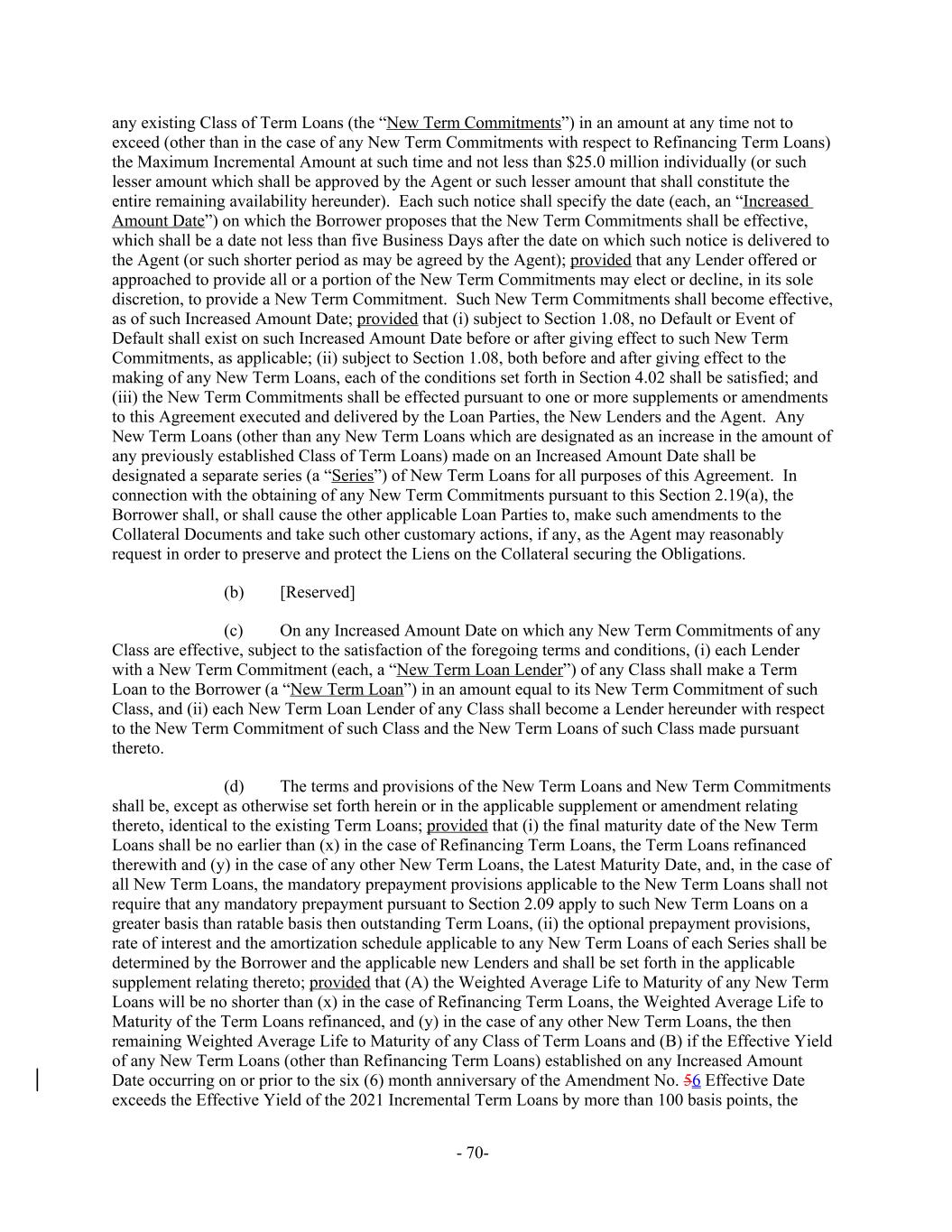any existing Class of Term Loans (the “New Term Commitments”) in an amount at any time not to exceed (other than in the case of any New Term Commitments with respect to Refinancing Term Loans) the Maximum Incremental Amount at such time and not less than $25.0 million individually (or such lesser amount which shall be approved by the Agent or such lesser amount that shall constitute the entire remaining availability hereunder). Each such notice shall specify the date (each, an “Increased Amount Date”) on which the Borrower proposes that the New Term Commitments shall be effective, which shall be a date not less than five Business Days after the date on which such notice is delivered to the Agent (or such shorter period as may be agreed by the Agent); provided that any Lender offered or approached to provide all or a portion of the New Term Commitments may elect or decline, in its sole discretion, to provide a New Term Commitment. Such New Term Commitments shall become effective, as of such Increased Amount Date; provided that (i) subject to Section 1.08, no Default or Event of Default shall exist on such Increased Amount Date before or after giving effect to such New Term Commitments, as applicable; (ii) subject to Section 1.08, both before and after giving effect to the making of any New Term Loans, each of the conditions set forth in Section 4.02 shall be satisfied; and (iii) the New Term Commitments shall be effected pursuant to one or more supplements or amendments to this Agreement executed and delivered by the Loan Parties, the New Lenders and the Agent. Any New Term Loans (other than any New Term Loans which are designated as an increase in the amount of any previously established Class of Term Loans) made on an Increased Amount Date shall be designated a separate series (a “Series”) of New Term Loans for all purposes of this Agreement. In connection with the obtaining of any New Term Commitments pursuant to this Section 2.19(a), the Borrower shall, or shall cause the other applicable Loan Parties to, make such amendments to the Collateral Documents and take such other customary actions, if any, as the Agent may reasonably request in order to preserve and protect the Liens on the Collateral securing the Obligations. [Reserved](b) On any Increased Amount Date on which any New Term Commitments of any(c) Class are effective, subject to the satisfaction of the foregoing terms and conditions, (i) each Lender with a New Term Commitment (each, a “New Term Loan Lender”) of any Class shall make a Term Loan to the Borrower (a “New Term Loan”) in an amount equal to its New Term Commitment of such Class, and (ii) each New Term Loan Lender of any Class shall become a Lender hereunder with respect to the New Term Commitment of such Class and the New Term Loans of such Class made pursuant thereto. The terms and provisions of the New Term Loans and New Term Commitments(d) shall be, except as otherwise set forth herein or in the applicable supplement or amendment relating thereto, identical to the existing Term Loans; provided that (i) the final maturity date of the New Term Loans shall be no earlier than (x) in the case of Refinancing Term Loans, the Term Loans refinanced therewith and (y) in the case of any other New Term Loans, the Latest Maturity Date, and, in the case of all New Term Loans, the mandatory prepayment provisions applicable to the New Term Loans shall not require that any mandatory prepayment pursuant to Section 2.09 apply to such New Term Loans on a greater basis than ratable basis then outstanding Term Loans, (ii) the optional prepayment provisions, rate of interest and the amortization schedule applicable to any New Term Loans of each Series shall be determined by the Borrower and the applicable new Lenders and shall be set forth in the applicable supplement relating thereto; provided that (A) the Weighted Average Life to Maturity of any New Term Loans will be no shorter than (x) in the case of Refinancing Term Loans, the Weighted Average Life to Maturity of the Term Loans refinanced, and (y) in the case of any other New Term Loans, the then remaining Weighted Average Life to Maturity of any Class of Term Loans and (B) if the Effective Yield of any New Term Loans (other than Refinancing Term Loans) established on any Increased Amount Date occurring on or prior to the six (6) month anniversary of the Amendment No. 56 Effective Date exceeds the Effective Yield of the 2021 Incremental Term Loans by more than 100 basis points, the - 70-