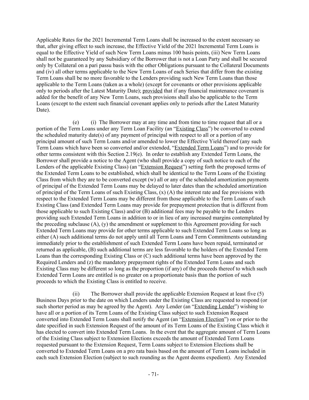 Applicable Rates for the 2021 Incremental Term Loans shall be increased to the extent necessary so that, after giving effect to such increase, the Effective Yield of the 2021 Incremental Term Loans is equal to the Effective Yield of such New Term Loans minus 100 basis points, (iii) New Term Loans shall not be guaranteed by any Subsidiary of the Borrower that is not a Loan Party and shall be secured only by Collateral on a pari passu basis with the other Obligations pursuant to the Collateral Documents and (iv) all other terms applicable to the New Term Loans of each Series that differ from the existing Term Loans shall be no more favorable to the Lenders providing such New Term Loans than those applicable to the Term Loans (taken as a whole) (except for covenants or other provisions applicable only to periods after the Latest Maturity Date); provided that if any financial maintenance covenant is added for the benefit of any New Term Loans, such provisions shall also be applicable to the Term Loans (except to the extent such financial covenant applies only to periods after the Latest Maturity Date). (i) The Borrower may at any time and from time to time request that all or a(e) portion of the Term Loans under any Term Loan Facility (an “Existing Class”) be converted to extend the scheduled maturity date(s) of any payment of principal with respect to all or a portion of any principal amount of such Term Loans and/or amended to lower the Effective Yield thereof (any such Term Loans which have been so converted and/or extended, “Extended Term Loans”) and to provide for other terms consistent with this Section 2.19(e). In order to establish any Extended Term Loans, the Borrower shall provide a notice to the Agent (who shall provide a copy of such notice to each of the Lenders of the applicable Existing Class) (an “Extension Request”) setting forth the proposed terms of the Extended Term Loans to be established, which shall be identical to the Term Loans of the Existing Class from which they are to be converted except (w) all or any of the scheduled amortization payments of principal of the Extended Term Loans may be delayed to later dates than the scheduled amortization of principal of the Term Loans of such Existing Class, (x) (A) the interest rate and fee provisions with respect to the Extended Term Loans may be different from those applicable to the Term Loans of such Existing Class (and Extended Term Loans may provide for prepayment protection that is different from those applicable to such Existing Class) and/or (B) additional fees may be payable to the Lenders providing such Extended Term Loans in addition to or in lieu of any increased margins contemplated by the preceding subclause (A), (y) the amendment or supplement to this Agreement providing for such Extended Term Loans may provide for other terms applicable to such Extended Term Loans so long as either (A) such additional terms do not apply until all Term Loans and Term Commitments outstanding immediately prior to the establishment of such Extended Term Loans have been repaid, terminated or returned as applicable, (B) such additional terms are less favorable to the holders of the Extended Term Loans than the corresponding Existing Class or (C) such additional terms have been approved by the Required Lenders and (z) the mandatory prepayment rights of the Extended Term Loans and such Existing Class may be different so long as the proportion (if any) of the proceeds thereof to which such Extended Term Loans are entitled is no greater on a proportionate basis than the portion of such proceeds to which the Existing Class is entitled to receive. (ii) The Borrower shall provide the applicable Extension Request at least five (5) Business Days prior to the date on which Lenders under the Existing Class are requested to respond (or such shorter period as may be agreed by the Agent). Any Lender (an “Extending Lender”) wishing to have all or a portion of its Term Loans of the Existing Class subject to such Extension Request converted into Extended Term Loans shall notify the Agent (an “Extension Election”) on or prior to the date specified in such Extension Request of the amount of its Term Loans of the Existing Class which it has elected to convert into Extended Term Loans. In the event that the aggregate amount of Term Loans of the Existing Class subject to Extension Elections exceeds the amount of Extended Term Loans requested pursuant to the Extension Request, Term Loans subject to Extension Elections shall be converted to Extended Term Loans on a pro rata basis based on the amount of Term Loans included in each such Extension Election (subject to such rounding as the Agent deems expedient). Any Extended - 71-