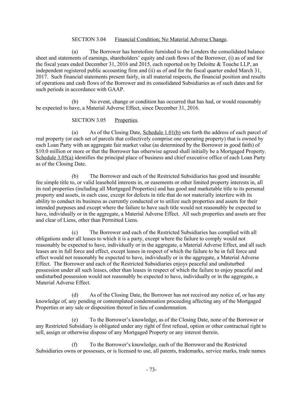 Financial Condition; No Material Adverse Change.SECTION 3.04 The Borrower has heretofore furnished to the Lenders the consolidated balance(a) sheet and statements of earnings, shareholders’ equity and cash flows of the Borrower, (i) as of and for the fiscal years ended December 31, 2016 and 2015, each reported on by Deloitte & Touche LLP, an independent registered public accounting firm and (ii) as of and for the fiscal quarter ended March 31, 2017. Such financial statements present fairly, in all material respects, the financial position and results of operations and cash flows of the Borrower and its consolidated Subsidiaries as of such dates and for such periods in accordance with GAAP. No event, change or condition has occurred that has had, or would reasonably(b) be expected to have, a Material Adverse Effect, since December 31, 2016. Properties.SECTION 3.05 As of the Closing Date, Schedule 1.01(b) sets forth the address of each parcel of(a) real property (or each set of parcels that collectively comprise one operating property) that is owned by each Loan Party with an aggregate fair market value (as determined by the Borrower in good faith) of $10.0 million or more or that the Borrower has otherwise agreed shall initially be a Mortgaged Property. Schedule 3.05(a) identifies the principal place of business and chief executive office of each Loan Party as of the Closing Date. The Borrower and each of the Restricted Subsidiaries has good and insurable(b) fee simple title to, or valid leasehold interests in, or easements or other limited property interests in, all its real properties (including all Mortgaged Properties) and has good and marketable title to its personal property and assets, in each case, except for defects in title that do not materially interfere with its ability to conduct its business as currently conducted or to utilize such properties and assets for their intended purposes and except where the failure to have such title would not reasonably be expected to have, individually or in the aggregate, a Material Adverse Effect. All such properties and assets are free and clear of Liens, other than Permitted Liens. The Borrower and each of the Restricted Subsidiaries has complied with all(c) obligations under all leases to which it is a party, except where the failure to comply would not reasonably be expected to have, individually or in the aggregate, a Material Adverse Effect, and all such leases are in full force and effect, except leases in respect of which the failure to be in full force and effect would not reasonably be expected to have, individually or in the aggregate, a Material Adverse Effect. The Borrower and each of the Restricted Subsidiaries enjoys peaceful and undisturbed possession under all such leases, other than leases in respect of which the failure to enjoy peaceful and undisturbed possession would not reasonably be expected to have, individually or in the aggregate, a Material Adverse Effect. As of the Closing Date, the Borrower has not received any notice of, or has any(d) knowledge of, any pending or contemplated condemnation proceeding affecting any of the Mortgaged Properties or any sale or disposition thereof in lieu of condemnation. To the Borrower’s knowledge, as of the Closing Date, none of the Borrower or(e) any Restricted Subsidiary is obligated under any right of first refusal, option or other contractual right to sell, assign or otherwise dispose of any Mortgaged Property or any interest therein. To the Borrower’s knowledge, each of the Borrower and the Restricted(f) Subsidiaries owns or possesses, or is licensed to use, all patents, trademarks, service marks, trade names - 73-