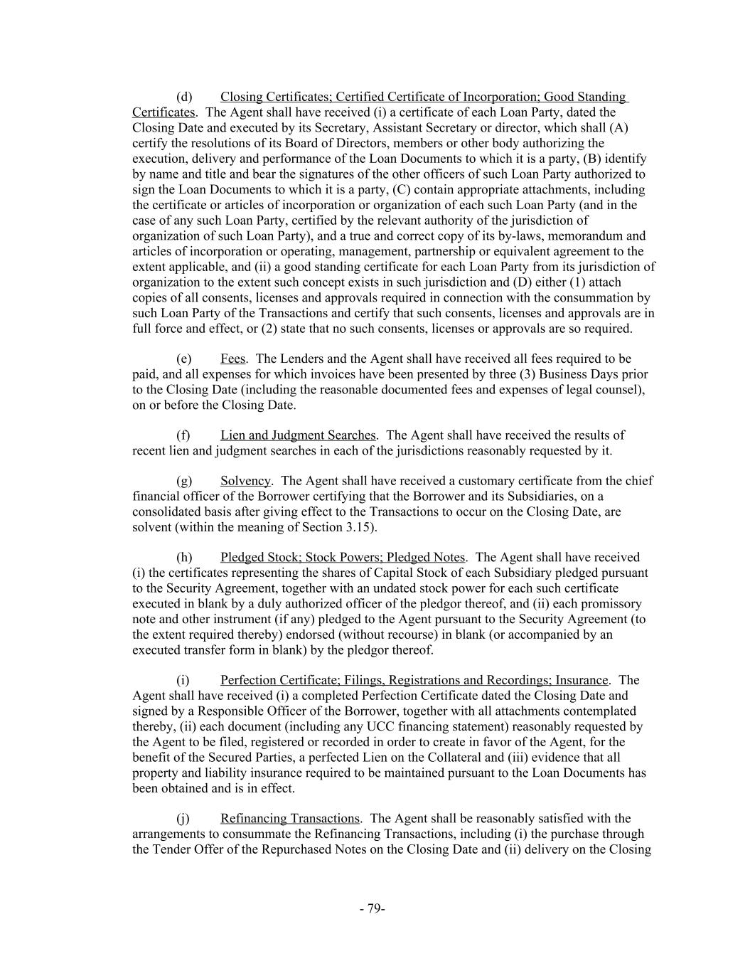 (d) Closing Certificates; Certified Certificate of Incorporation; Good Standing Certificates. The Agent shall have received (i) a certificate of each Loan Party, dated the Closing Date and executed by its Secretary, Assistant Secretary or director, which shall (A) certify the resolutions of its Board of Directors, members or other body authorizing the execution, delivery and performance of the Loan Documents to which it is a party, (B) identify by name and title and bear the signatures of the other officers of such Loan Party authorized to sign the Loan Documents to which it is a party, (C) contain appropriate attachments, including the certificate or articles of incorporation or organization of each such Loan Party (and in the case of any such Loan Party, certified by the relevant authority of the jurisdiction of organization of such Loan Party), and a true and correct copy of its by-laws, memorandum and articles of incorporation or operating, management, partnership or equivalent agreement to the extent applicable, and (ii) a good standing certificate for each Loan Party from its jurisdiction of organization to the extent such concept exists in such jurisdiction and (D) either (1) attach copies of all consents, licenses and approvals required in connection with the consummation by such Loan Party of the Transactions and certify that such consents, licenses and approvals are in full force and effect, or (2) state that no such consents, licenses or approvals are so required. (e) Fees. The Lenders and the Agent shall have received all fees required to be paid, and all expenses for which invoices have been presented by three (3) Business Days prior to the Closing Date (including the reasonable documented fees and expenses of legal counsel), on or before the Closing Date. (f) Lien and Judgment Searches. The Agent shall have received the results of recent lien and judgment searches in each of the jurisdictions reasonably requested by it. (g) Solvency. The Agent shall have received a customary certificate from the chief financial officer of the Borrower certifying that the Borrower and its Subsidiaries, on a consolidated basis after giving effect to the Transactions to occur on the Closing Date, are solvent (within the meaning of Section 3.15). (h) Pledged Stock; Stock Powers; Pledged Notes. The Agent shall have received (i) the certificates representing the shares of Capital Stock of each Subsidiary pledged pursuant to the Security Agreement, together with an undated stock power for each such certificate executed in blank by a duly authorized officer of the pledgor thereof, and (ii) each promissory note and other instrument (if any) pledged to the Agent pursuant to the Security Agreement (to the extent required thereby) endorsed (without recourse) in blank (or accompanied by an executed transfer form in blank) by the pledgor thereof. (i) Perfection Certificate; Filings, Registrations and Recordings; Insurance. The Agent shall have received (i) a completed Perfection Certificate dated the Closing Date and signed by a Responsible Officer of the Borrower, together with all attachments contemplated thereby, (ii) each document (including any UCC financing statement) reasonably requested by the Agent to be filed, registered or recorded in order to create in favor of the Agent, for the benefit of the Secured Parties, a perfected Lien on the Collateral and (iii) evidence that all property and liability insurance required to be maintained pursuant to the Loan Documents has been obtained and is in effect. (j) Refinancing Transactions. The Agent shall be reasonably satisfied with the arrangements to consummate the Refinancing Transactions, including (i) the purchase through the Tender Offer of the Repurchased Notes on the Closing Date and (ii) delivery on the Closing - 79-