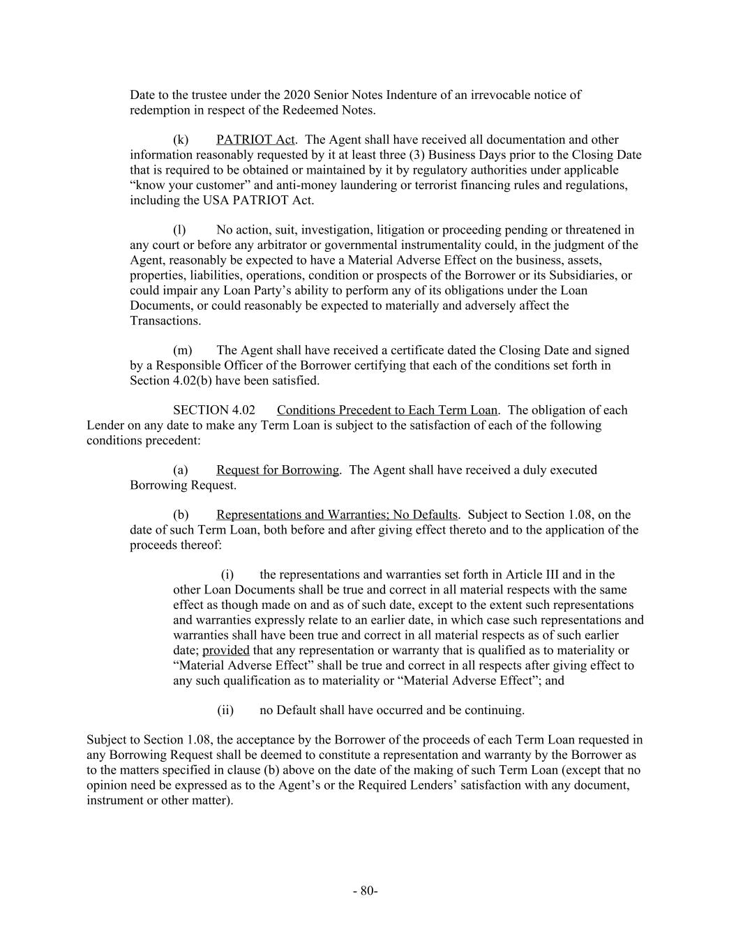 Date to the trustee under the 2020 Senior Notes Indenture of an irrevocable notice of redemption in respect of the Redeemed Notes. (k) PATRIOT Act. The Agent shall have received all documentation and other information reasonably requested by it at least three (3) Business Days prior to the Closing Date that is required to be obtained or maintained by it by regulatory authorities under applicable “know your customer” and anti-money laundering or terrorist financing rules and regulations, including the USA PATRIOT Act. (l) No action, suit, investigation, litigation or proceeding pending or threatened in any court or before any arbitrator or governmental instrumentality could, in the judgment of the Agent, reasonably be expected to have a Material Adverse Effect on the business, assets, properties, liabilities, operations, condition or prospects of the Borrower or its Subsidiaries, or could impair any Loan Party’s ability to perform any of its obligations under the Loan Documents, or could reasonably be expected to materially and adversely affect the Transactions. (m) The Agent shall have received a certificate dated the Closing Date and signed by a Responsible Officer of the Borrower certifying that each of the conditions set forth in Section 4.02(b) have been satisfied. Conditions Precedent to Each Term Loan. The obligation of eachSECTION 4.02 Lender on any date to make any Term Loan is subject to the satisfaction of each of the following conditions precedent: (a) Request for Borrowing. The Agent shall have received a duly executed Borrowing Request. (b) Representations and Warranties; No Defaults. Subject to Section 1.08, on the date of such Term Loan, both before and after giving effect thereto and to the application of the proceeds thereof: (i) the representations and warranties set forth in Article III and in the other Loan Documents shall be true and correct in all material respects with the same effect as though made on and as of such date, except to the extent such representations and warranties expressly relate to an earlier date, in which case such representations and warranties shall have been true and correct in all material respects as of such earlier date; provided that any representation or warranty that is qualified as to materiality or “Material Adverse Effect” shall be true and correct in all respects after giving effect to any such qualification as to materiality or “Material Adverse Effect”; and (ii) no Default shall have occurred and be continuing. Subject to Section 1.08, the acceptance by the Borrower of the proceeds of each Term Loan requested in any Borrowing Request shall be deemed to constitute a representation and warranty by the Borrower as to the matters specified in clause (b) above on the date of the making of such Term Loan (except that no opinion need be expressed as to the Agent’s or the Required Lenders’ satisfaction with any document, instrument or other matter). - 80-