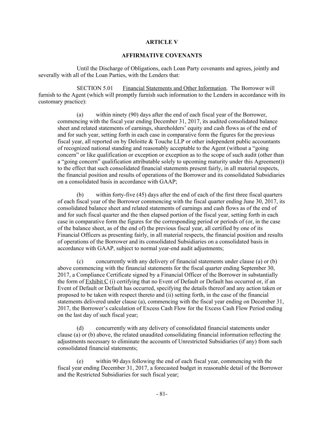 ARTICLE V AFFIRMATIVE COVENANTS Until the Discharge of Obligations, each Loan Party covenants and agrees, jointly and severally with all of the Loan Parties, with the Lenders that: Financial Statements and Other Information. The Borrower willSECTION 5.01 furnish to the Agent (which will promptly furnish such information to the Lenders in accordance with its customary practice): (a) within ninety (90) days after the end of each fiscal year of the Borrower, commencing with the fiscal year ending December 31, 2017, its audited consolidated balance sheet and related statements of earnings, shareholders’ equity and cash flows as of the end of and for such year, setting forth in each case in comparative form the figures for the previous fiscal year, all reported on by Deloitte & Touche LLP or other independent public accountants of recognized national standing and reasonably acceptable to the Agent (without a “going concern” or like qualification or exception or exception as to the scope of such audit (other than a “going concern” qualification attributable solely to upcoming maturity under this Agreement)) to the effect that such consolidated financial statements present fairly, in all material respects, the financial position and results of operations of the Borrower and its consolidated Subsidiaries on a consolidated basis in accordance with GAAP; (b) within forty-five (45) days after the end of each of the first three fiscal quarters of each fiscal year of the Borrower commencing with the fiscal quarter ending June 30, 2017, its consolidated balance sheet and related statements of earnings and cash flows as of the end of and for such fiscal quarter and the then elapsed portion of the fiscal year, setting forth in each case in comparative form the figures for the corresponding period or periods of (or, in the case of the balance sheet, as of the end of) the previous fiscal year, all certified by one of its Financial Officers as presenting fairly, in all material respects, the financial position and results of operations of the Borrower and its consolidated Subsidiaries on a consolidated basis in accordance with GAAP, subject to normal year-end audit adjustments; (c) concurrently with any delivery of financial statements under clause (a) or (b) above commencing with the financial statements for the fiscal quarter ending September 30, 2017, a Compliance Certificate signed by a Financial Officer of the Borrower in substantially the form of Exhibit C (i) certifying that no Event of Default or Default has occurred or, if an Event of Default or Default has occurred, specifying the details thereof and any action taken or proposed to be taken with respect thereto and (ii) setting forth, in the case of the financial statements delivered under clause (a), commencing with the fiscal year ending on December 31, 2017, the Borrower’s calculation of Excess Cash Flow for the Excess Cash Flow Period ending on the last day of such fiscal year; (d) concurrently with any delivery of consolidated financial statements under clause (a) or (b) above, the related unaudited consolidating financial information reflecting the adjustments necessary to eliminate the accounts of Unrestricted Subsidiaries (if any) from such consolidated financial statements; (e) within 90 days following the end of each fiscal year, commencing with the fiscal year ending December 31, 2017, a forecasted budget in reasonable detail of the Borrower and the Restricted Subsidiaries for such fiscal year; - 81-