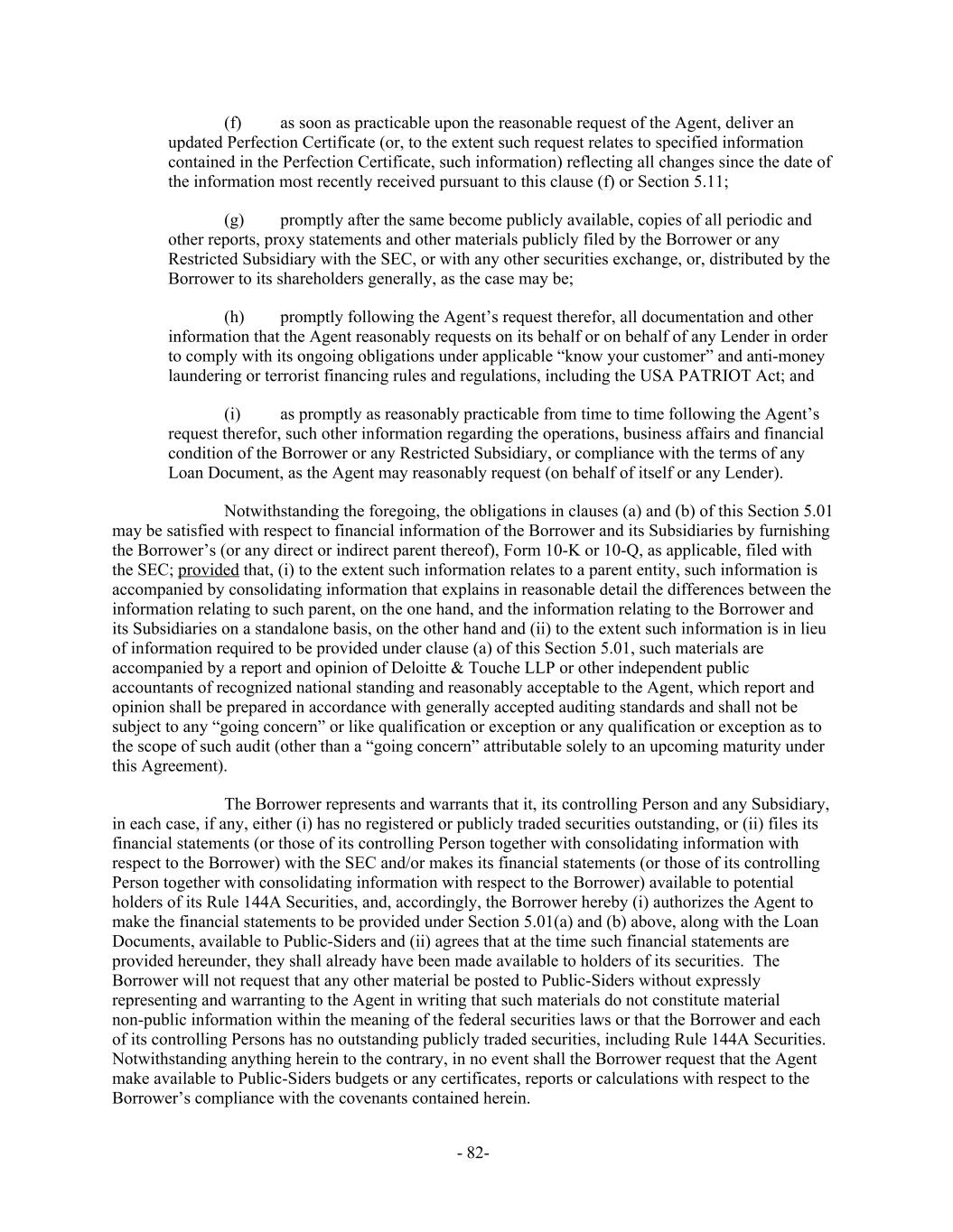 (f) as soon as practicable upon the reasonable request of the Agent, deliver an updated Perfection Certificate (or, to the extent such request relates to specified information contained in the Perfection Certificate, such information) reflecting all changes since the date of the information most recently received pursuant to this clause (f) or Section 5.11; (g) promptly after the same become publicly available, copies of all periodic and other reports, proxy statements and other materials publicly filed by the Borrower or any Restricted Subsidiary with the SEC, or with any other securities exchange, or, distributed by the Borrower to its shareholders generally, as the case may be; (h) promptly following the Agent’s request therefor, all documentation and other information that the Agent reasonably requests on its behalf or on behalf of any Lender in order to comply with its ongoing obligations under applicable “know your customer” and anti-money laundering or terrorist financing rules and regulations, including the USA PATRIOT Act; and (i) as promptly as reasonably practicable from time to time following the Agent’s request therefor, such other information regarding the operations, business affairs and financial condition of the Borrower or any Restricted Subsidiary, or compliance with the terms of any Loan Document, as the Agent may reasonably request (on behalf of itself or any Lender). Notwithstanding the foregoing, the obligations in clauses (a) and (b) of this Section 5.01 may be satisfied with respect to financial information of the Borrower and its Subsidiaries by furnishing the Borrower’s (or any direct or indirect parent thereof), Form 10-K or 10-Q, as applicable, filed with the SEC; provided that, (i) to the extent such information relates to a parent entity, such information is accompanied by consolidating information that explains in reasonable detail the differences between the information relating to such parent, on the one hand, and the information relating to the Borrower and its Subsidiaries on a standalone basis, on the other hand and (ii) to the extent such information is in lieu of information required to be provided under clause (a) of this Section 5.01, such materials are accompanied by a report and opinion of Deloitte & Touche LLP or other independent public accountants of recognized national standing and reasonably acceptable to the Agent, which report and opinion shall be prepared in accordance with generally accepted auditing standards and shall not be subject to any “going concern” or like qualification or exception or any qualification or exception as to the scope of such audit (other than a “going concern” attributable solely to an upcoming maturity under this Agreement). The Borrower represents and warrants that it, its controlling Person and any Subsidiary, in each case, if any, either (i) has no registered or publicly traded securities outstanding, or (ii) files its financial statements (or those of its controlling Person together with consolidating information with respect to the Borrower) with the SEC and/or makes its financial statements (or those of its controlling Person together with consolidating information with respect to the Borrower) available to potential holders of its Rule 144A Securities, and, accordingly, the Borrower hereby (i) authorizes the Agent to make the financial statements to be provided under Section 5.01(a) and (b) above, along with the Loan Documents, available to Public-Siders and (ii) agrees that at the time such financial statements are provided hereunder, they shall already have been made available to holders of its securities. The Borrower will not request that any other material be posted to Public-Siders without expressly representing and warranting to the Agent in writing that such materials do not constitute material non-public information within the meaning of the federal securities laws or that the Borrower and each of its controlling Persons has no outstanding publicly traded securities, including Rule 144A Securities. Notwithstanding anything herein to the contrary, in no event shall the Borrower request that the Agent make available to Public-Siders budgets or any certificates, reports or calculations with respect to the Borrower’s compliance with the covenants contained herein. - 82-