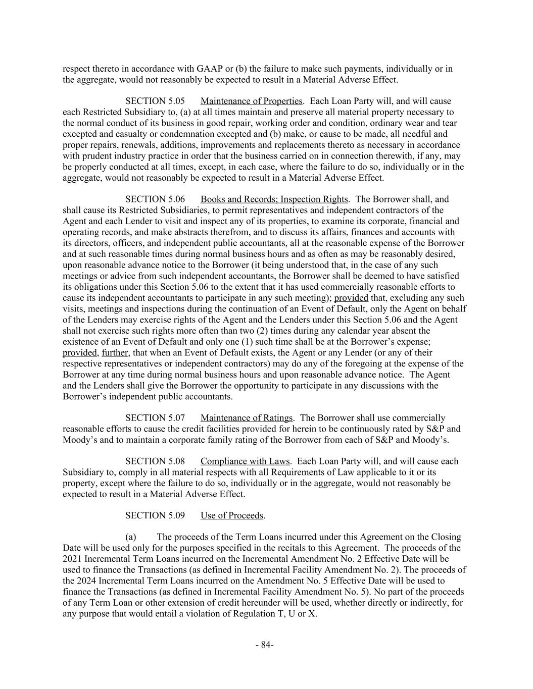 respect thereto in accordance with GAAP or (b) the failure to make such payments, individually or in the aggregate, would not reasonably be expected to result in a Material Adverse Effect. Maintenance of Properties. Each Loan Party will, and will causeSECTION 5.05 each Restricted Subsidiary to, (a) at all times maintain and preserve all material property necessary to the normal conduct of its business in good repair, working order and condition, ordinary wear and tear excepted and casualty or condemnation excepted and (b) make, or cause to be made, all needful and proper repairs, renewals, additions, improvements and replacements thereto as necessary in accordance with prudent industry practice in order that the business carried on in connection therewith, if any, may be properly conducted at all times, except, in each case, where the failure to do so, individually or in the aggregate, would not reasonably be expected to result in a Material Adverse Effect. Books and Records; Inspection Rights. The Borrower shall, andSECTION 5.06 shall cause its Restricted Subsidiaries, to permit representatives and independent contractors of the Agent and each Lender to visit and inspect any of its properties, to examine its corporate, financial and operating records, and make abstracts therefrom, and to discuss its affairs, finances and accounts with its directors, officers, and independent public accountants, all at the reasonable expense of the Borrower and at such reasonable times during normal business hours and as often as may be reasonably desired, upon reasonable advance notice to the Borrower (it being understood that, in the case of any such meetings or advice from such independent accountants, the Borrower shall be deemed to have satisfied its obligations under this Section 5.06 to the extent that it has used commercially reasonable efforts to cause its independent accountants to participate in any such meeting); provided that, excluding any such visits, meetings and inspections during the continuation of an Event of Default, only the Agent on behalf of the Lenders may exercise rights of the Agent and the Lenders under this Section 5.06 and the Agent shall not exercise such rights more often than two (2) times during any calendar year absent the existence of an Event of Default and only one (1) such time shall be at the Borrower’s expense; provided, further, that when an Event of Default exists, the Agent or any Lender (or any of their respective representatives or independent contractors) may do any of the foregoing at the expense of the Borrower at any time during normal business hours and upon reasonable advance notice. The Agent and the Lenders shall give the Borrower the opportunity to participate in any discussions with the Borrower’s independent public accountants. Maintenance of Ratings. The Borrower shall use commerciallySECTION 5.07 reasonable efforts to cause the credit facilities provided for herein to be continuously rated by S&P and Moody’s and to maintain a corporate family rating of the Borrower from each of S&P and Moody’s. Compliance with Laws. Each Loan Party will, and will cause eachSECTION 5.08 Subsidiary to, comply in all material respects with all Requirements of Law applicable to it or its property, except where the failure to do so, individually or in the aggregate, would not reasonably be expected to result in a Material Adverse Effect. Use of Proceeds.SECTION 5.09 The proceeds of the Term Loans incurred under this Agreement on the Closing(a) Date will be used only for the purposes specified in the recitals to this Agreement. The proceeds of the 2021 Incremental Term Loans incurred on the Incremental Amendment No. 2 Effective Date will be used to finance the Transactions (as defined in Incremental Facility Amendment No. 2). The proceeds of the 2024 Incremental Term Loans incurred on the Amendment No. 5 Effective Date will be used to finance the Transactions (as defined in Incremental Facility Amendment No. 5). No part of the proceeds of any Term Loan or other extension of credit hereunder will be used, whether directly or indirectly, for any purpose that would entail a violation of Regulation T, U or X. - 84-
