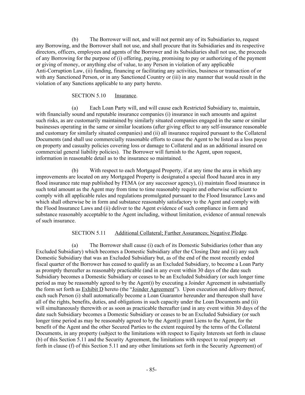 The Borrower will not, and will not permit any of its Subsidiaries to, request(b) any Borrowing, and the Borrower shall not use, and shall procure that its Subsidiaries and its respective directors, officers, employees and agents of the Borrower and its Subsidiaries shall not use, the proceeds of any Borrowing for the purpose of (i) offering, paying, promising to pay or authorizing of the payment or giving of money, or anything else of value, to any Person in violation of any applicable Anti-Corruption Law, (ii) funding, financing or facilitating any activities, business or transaction of or with any Sanctioned Person, or in any Sanctioned Country or (iii) in any manner that would result in the violation of any Sanctions applicable to any party hereto. Insurance.SECTION 5.10 Each Loan Party will, and will cause each Restricted Subsidiary to, maintain,(a) with financially sound and reputable insurance companies (i) insurance in such amounts and against such risks, as are customarily maintained by similarly situated companies engaged in the same or similar businesses operating in the same or similar locations (after giving effect to any self-insurance reasonable and customary for similarly situated companies) and (ii) all insurance required pursuant to the Collateral Documents (and shall use commercially reasonable efforts to cause the Agent to be listed as a loss payee on property and casualty policies covering loss or damage to Collateral and as an additional insured on commercial general liability policies). The Borrower will furnish to the Agent, upon request, information in reasonable detail as to the insurance so maintained. With respect to each Mortgaged Property, if at any time the area in which any(b) improvements are located on any Mortgaged Property is designated a special flood hazard area in any flood insurance rate map published by FEMA (or any successor agency), (i) maintain flood insurance in such total amount as the Agent may from time to time reasonably require and otherwise sufficient to comply with all applicable rules and regulations promulgated pursuant to the Flood Insurance Laws and which shall otherwise be in form and substance reasonably satisfactory to the Agent and comply with the Flood Insurance Laws and (ii) deliver to the Agent evidence of such compliance in form and substance reasonably acceptable to the Agent including, without limitation, evidence of annual renewals of such insurance. Additional Collateral; Further Assurances; Negative Pledge.SECTION 5.11 The Borrower shall cause (i) each of its Domestic Subsidiaries (other than any(a) Excluded Subsidiary) which becomes a Domestic Subsidiary after the Closing Date and (ii) any such Domestic Subsidiary that was an Excluded Subsidiary but, as of the end of the most recently ended fiscal quarter of the Borrower has ceased to qualify as an Excluded Subsidiary, to become a Loan Party as promptly thereafter as reasonably practicable (and in any event within 30 days of the date such Subsidiary becomes a Domestic Subsidiary or ceases to be an Excluded Subsidiary (or such longer time period as may be reasonably agreed to by the Agent)) by executing a Joinder Agreement in substantially the form set forth as Exhibit D hereto (the “Joinder Agreement”). Upon execution and delivery thereof, each such Person (i) shall automatically become a Loan Guarantor hereunder and thereupon shall have all of the rights, benefits, duties, and obligations in such capacity under the Loan Documents and (ii) will simultaneously therewith or as soon as practicable thereafter (and in any event within 30 days of the date such Subsidiary becomes a Domestic Subsidiary or ceases to be an Excluded Subsidiary (or such longer time period as may be reasonably agreed to by the Agent)) grant Liens to the Agent, for the benefit of the Agent and the other Secured Parties to the extent required by the terms of the Collateral Documents, in any property (subject to the limitations with respect to Equity Interests set forth in clause (b) of this Section 5.11 and the Security Agreement, the limitations with respect to real property set forth in clause (f) of this Section 5.11 and any other limitations set forth in the Security Agreement) of - 85-