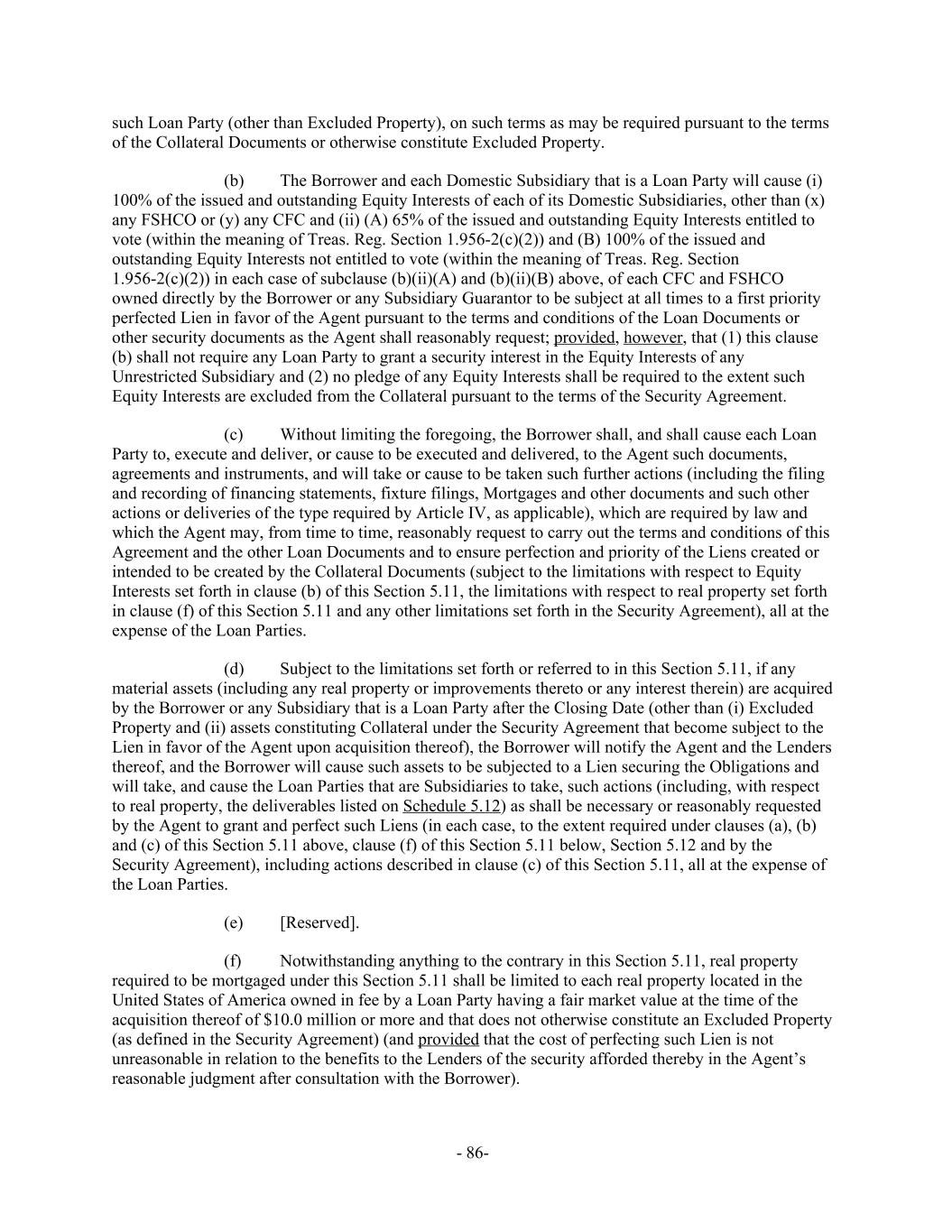 such Loan Party (other than Excluded Property), on such terms as may be required pursuant to the terms of the Collateral Documents or otherwise constitute Excluded Property. The Borrower and each Domestic Subsidiary that is a Loan Party will cause (i)(b) 100% of the issued and outstanding Equity Interests of each of its Domestic Subsidiaries, other than (x) any FSHCO or (y) any CFC and (ii) (A) 65% of the issued and outstanding Equity Interests entitled to vote (within the meaning of Treas. Reg. Section 1.956-2(c)(2)) and (B) 100% of the issued and outstanding Equity Interests not entitled to vote (within the meaning of Treas. Reg. Section 1.956-2(c)(2)) in each case of subclause (b)(ii)(A) and (b)(ii)(B) above, of each CFC and FSHCO owned directly by the Borrower or any Subsidiary Guarantor to be subject at all times to a first priority perfected Lien in favor of the Agent pursuant to the terms and conditions of the Loan Documents or other security documents as the Agent shall reasonably request; provided, however, that (1) this clause (b) shall not require any Loan Party to grant a security interest in the Equity Interests of any Unrestricted Subsidiary and (2) no pledge of any Equity Interests shall be required to the extent such Equity Interests are excluded from the Collateral pursuant to the terms of the Security Agreement. Without limiting the foregoing, the Borrower shall, and shall cause each Loan(c) Party to, execute and deliver, or cause to be executed and delivered, to the Agent such documents, agreements and instruments, and will take or cause to be taken such further actions (including the filing and recording of financing statements, fixture filings, Mortgages and other documents and such other actions or deliveries of the type required by Article IV, as applicable), which are required by law and which the Agent may, from time to time, reasonably request to carry out the terms and conditions of this Agreement and the other Loan Documents and to ensure perfection and priority of the Liens created or intended to be created by the Collateral Documents (subject to the limitations with respect to Equity Interests set forth in clause (b) of this Section 5.11, the limitations with respect to real property set forth in clause (f) of this Section 5.11 and any other limitations set forth in the Security Agreement), all at the expense of the Loan Parties. Subject to the limitations set forth or referred to in this Section 5.11, if any(d) material assets (including any real property or improvements thereto or any interest therein) are acquired by the Borrower or any Subsidiary that is a Loan Party after the Closing Date (other than (i) Excluded Property and (ii) assets constituting Collateral under the Security Agreement that become subject to the Lien in favor of the Agent upon acquisition thereof), the Borrower will notify the Agent and the Lenders thereof, and the Borrower will cause such assets to be subjected to a Lien securing the Obligations and will take, and cause the Loan Parties that are Subsidiaries to take, such actions (including, with respect to real property, the deliverables listed on Schedule 5.12) as shall be necessary or reasonably requested by the Agent to grant and perfect such Liens (in each case, to the extent required under clauses (a), (b) and (c) of this Section 5.11 above, clause (f) of this Section 5.11 below, Section 5.12 and by the Security Agreement), including actions described in clause (c) of this Section 5.11, all at the expense of the Loan Parties. [Reserved].(e) Notwithstanding anything to the contrary in this Section 5.11, real property(f) required to be mortgaged under this Section 5.11 shall be limited to each real property located in the United States of America owned in fee by a Loan Party having a fair market value at the time of the acquisition thereof of $10.0 million or more and that does not otherwise constitute an Excluded Property (as defined in the Security Agreement) (and provided that the cost of perfecting such Lien is not unreasonable in relation to the benefits to the Lenders of the security afforded thereby in the Agent’s reasonable judgment after consultation with the Borrower). - 86-