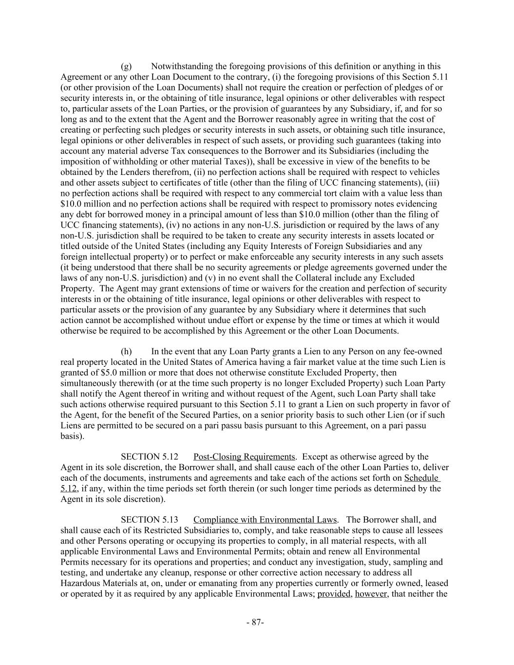 Notwithstanding the foregoing provisions of this definition or anything in this(g) Agreement or any other Loan Document to the contrary, (i) the foregoing provisions of this Section 5.11 (or other provision of the Loan Documents) shall not require the creation or perfection of pledges of or security interests in, or the obtaining of title insurance, legal opinions or other deliverables with respect to, particular assets of the Loan Parties, or the provision of guarantees by any Subsidiary, if, and for so long as and to the extent that the Agent and the Borrower reasonably agree in writing that the cost of creating or perfecting such pledges or security interests in such assets, or obtaining such title insurance, legal opinions or other deliverables in respect of such assets, or providing such guarantees (taking into account any material adverse Tax consequences to the Borrower and its Subsidiaries (including the imposition of withholding or other material Taxes)), shall be excessive in view of the benefits to be obtained by the Lenders therefrom, (ii) no perfection actions shall be required with respect to vehicles and other assets subject to certificates of title (other than the filing of UCC financing statements), (iii) no perfection actions shall be required with respect to any commercial tort claim with a value less than $10.0 million and no perfection actions shall be required with respect to promissory notes evidencing any debt for borrowed money in a principal amount of less than $10.0 million (other than the filing of UCC financing statements), (iv) no actions in any non-U.S. jurisdiction or required by the laws of any non-U.S. jurisdiction shall be required to be taken to create any security interests in assets located or titled outside of the United States (including any Equity Interests of Foreign Subsidiaries and any foreign intellectual property) or to perfect or make enforceable any security interests in any such assets (it being understood that there shall be no security agreements or pledge agreements governed under the laws of any non-U.S. jurisdiction) and (v) in no event shall the Collateral include any Excluded Property. The Agent may grant extensions of time or waivers for the creation and perfection of security interests in or the obtaining of title insurance, legal opinions or other deliverables with respect to particular assets or the provision of any guarantee by any Subsidiary where it determines that such action cannot be accomplished without undue effort or expense by the time or times at which it would otherwise be required to be accomplished by this Agreement or the other Loan Documents. In the event that any Loan Party grants a Lien to any Person on any fee-owned(h) real property located in the United States of America having a fair market value at the time such Lien is granted of $5.0 million or more that does not otherwise constitute Excluded Property, then simultaneously therewith (or at the time such property is no longer Excluded Property) such Loan Party shall notify the Agent thereof in writing and without request of the Agent, such Loan Party shall take such actions otherwise required pursuant to this Section 5.11 to grant a Lien on such property in favor of the Agent, for the benefit of the Secured Parties, on a senior priority basis to such other Lien (or if such Liens are permitted to be secured on a pari passu basis pursuant to this Agreement, on a pari passu basis). Post-Closing Requirements. Except as otherwise agreed by theSECTION 5.12 Agent in its sole discretion, the Borrower shall, and shall cause each of the other Loan Parties to, deliver each of the documents, instruments and agreements and take each of the actions set forth on Schedule 5.12, if any, within the time periods set forth therein (or such longer time periods as determined by the Agent in its sole discretion). Compliance with Environmental Laws. The Borrower shall, andSECTION 5.13 shall cause each of its Restricted Subsidiaries to, comply, and take reasonable steps to cause all lessees and other Persons operating or occupying its properties to comply, in all material respects, with all applicable Environmental Laws and Environmental Permits; obtain and renew all Environmental Permits necessary for its operations and properties; and conduct any investigation, study, sampling and testing, and undertake any cleanup, response or other corrective action necessary to address all Hazardous Materials at, on, under or emanating from any properties currently or formerly owned, leased or operated by it as required by any applicable Environmental Laws; provided, however, that neither the - 87-