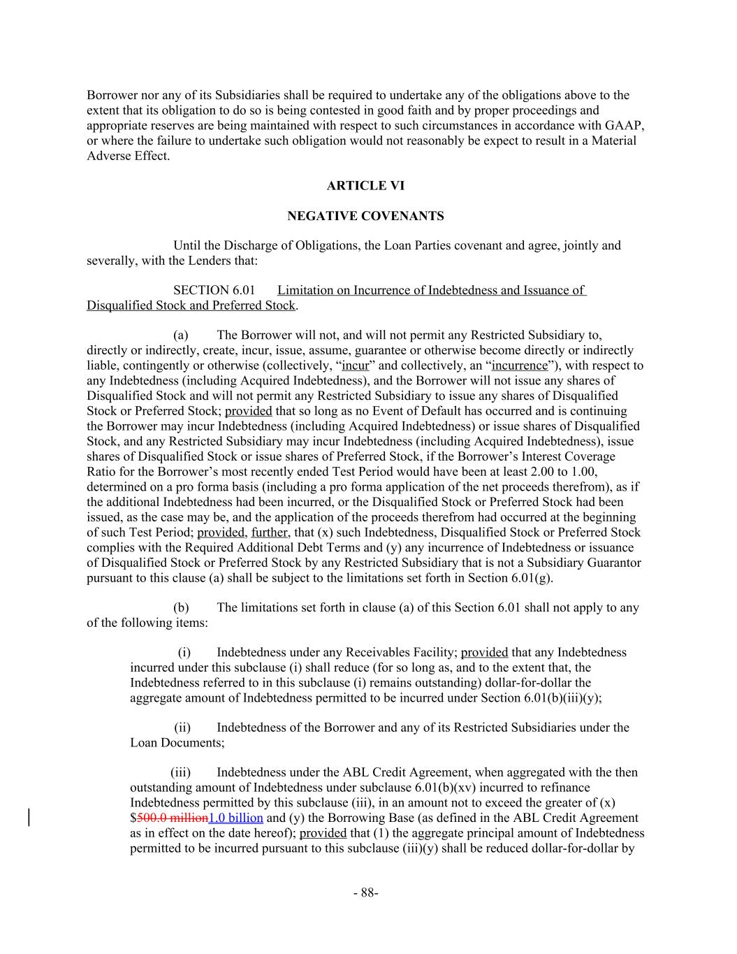 Borrower nor any of its Subsidiaries shall be required to undertake any of the obligations above to the extent that its obligation to do so is being contested in good faith and by proper proceedings and appropriate reserves are being maintained with respect to such circumstances in accordance with GAAP, or where the failure to undertake such obligation would not reasonably be expect to result in a Material Adverse Effect. ARTICLE VI NEGATIVE COVENANTS Until the Discharge of Obligations, the Loan Parties covenant and agree, jointly and severally, with the Lenders that: Limitation on Incurrence of Indebtedness and Issuance of SECTION 6.01 Disqualified Stock and Preferred Stock. The Borrower will not, and will not permit any Restricted Subsidiary to,(a) directly or indirectly, create, incur, issue, assume, guarantee or otherwise become directly or indirectly liable, contingently or otherwise (collectively, “incur” and collectively, an “incurrence”), with respect to any Indebtedness (including Acquired Indebtedness), and the Borrower will not issue any shares of Disqualified Stock and will not permit any Restricted Subsidiary to issue any shares of Disqualified Stock or Preferred Stock; provided that so long as no Event of Default has occurred and is continuing the Borrower may incur Indebtedness (including Acquired Indebtedness) or issue shares of Disqualified Stock, and any Restricted Subsidiary may incur Indebtedness (including Acquired Indebtedness), issue shares of Disqualified Stock or issue shares of Preferred Stock, if the Borrower’s Interest Coverage Ratio for the Borrower’s most recently ended Test Period would have been at least 2.00 to 1.00, determined on a pro forma basis (including a pro forma application of the net proceeds therefrom), as if the additional Indebtedness had been incurred, or the Disqualified Stock or Preferred Stock had been issued, as the case may be, and the application of the proceeds therefrom had occurred at the beginning of such Test Period; provided, further, that (x) such Indebtedness, Disqualified Stock or Preferred Stock complies with the Required Additional Debt Terms and (y) any incurrence of Indebtedness or issuance of Disqualified Stock or Preferred Stock by any Restricted Subsidiary that is not a Subsidiary Guarantor pursuant to this clause (a) shall be subject to the limitations set forth in Section 6.01(g). The limitations set forth in clause (a) of this Section 6.01 shall not apply to any(b) of the following items: Indebtedness under any Receivables Facility; provided that any Indebtedness(i) incurred under this subclause (i) shall reduce (for so long as, and to the extent that, the Indebtedness referred to in this subclause (i) remains outstanding) dollar-for-dollar the aggregate amount of Indebtedness permitted to be incurred under Section 6.01(b)(iii)(y); Indebtedness of the Borrower and any of its Restricted Subsidiaries under the(ii) Loan Documents; Indebtedness under the ABL Credit Agreement, when aggregated with the then(iii) outstanding amount of Indebtedness under subclause 6.01(b)(xv) incurred to refinance Indebtedness permitted by this subclause (iii), in an amount not to exceed the greater of (x) $500.0 million1.0 billion and (y) the Borrowing Base (as defined in the ABL Credit Agreement as in effect on the date hereof); provided that (1) the aggregate principal amount of Indebtedness permitted to be incurred pursuant to this subclause (iii)(y) shall be reduced dollar-for-dollar by - 88-