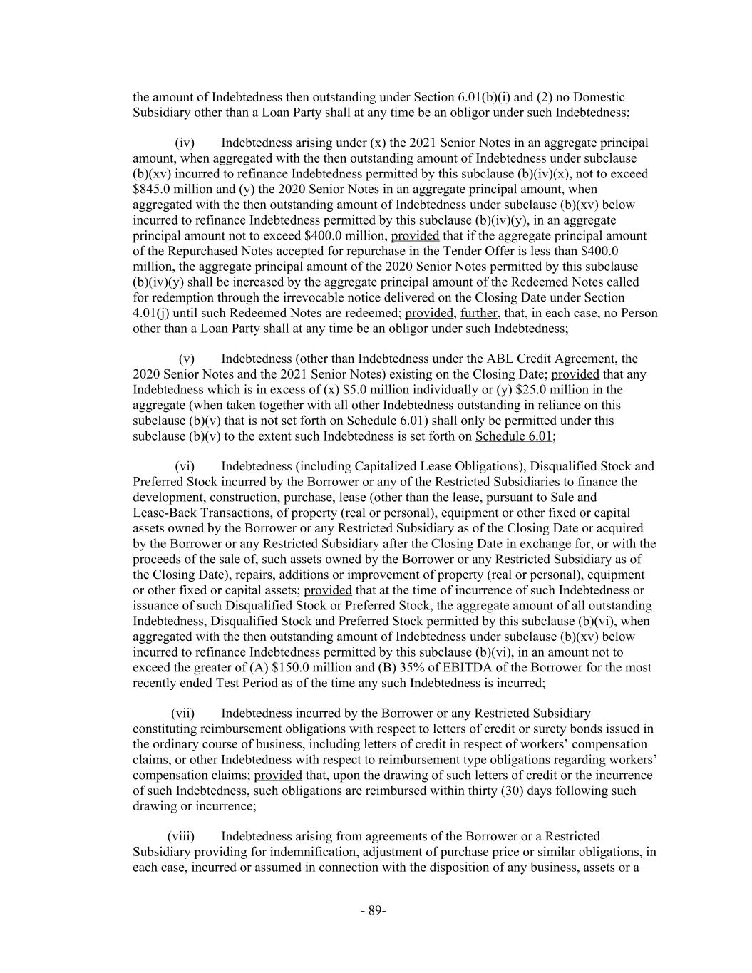 the amount of Indebtedness then outstanding under Section 6.01(b)(i) and (2) no Domestic Subsidiary other than a Loan Party shall at any time be an obligor under such Indebtedness; Indebtedness arising under (x) the 2021 Senior Notes in an aggregate principal(iv) amount, when aggregated with the then outstanding amount of Indebtedness under subclause (b)(xv) incurred to refinance Indebtedness permitted by this subclause (b)(iv)(x), not to exceed $845.0 million and (y) the 2020 Senior Notes in an aggregate principal amount, when aggregated with the then outstanding amount of Indebtedness under subclause (b)(xv) below incurred to refinance Indebtedness permitted by this subclause (b)(iv)(y), in an aggregate principal amount not to exceed $400.0 million, provided that if the aggregate principal amount of the Repurchased Notes accepted for repurchase in the Tender Offer is less than $400.0 million, the aggregate principal amount of the 2020 Senior Notes permitted by this subclause (b)(iv)(y) shall be increased by the aggregate principal amount of the Redeemed Notes called for redemption through the irrevocable notice delivered on the Closing Date under Section 4.01(j) until such Redeemed Notes are redeemed; provided, further, that, in each case, no Person other than a Loan Party shall at any time be an obligor under such Indebtedness; Indebtedness (other than Indebtedness under the ABL Credit Agreement, the(v) 2020 Senior Notes and the 2021 Senior Notes) existing on the Closing Date; provided that any Indebtedness which is in excess of (x) $5.0 million individually or (y) $25.0 million in the aggregate (when taken together with all other Indebtedness outstanding in reliance on this subclause (b)(v) that is not set forth on Schedule 6.01) shall only be permitted under this subclause (b)(v) to the extent such Indebtedness is set forth on Schedule 6.01; Indebtedness (including Capitalized Lease Obligations), Disqualified Stock and(vi) Preferred Stock incurred by the Borrower or any of the Restricted Subsidiaries to finance the development, construction, purchase, lease (other than the lease, pursuant to Sale and Lease-Back Transactions, of property (real or personal), equipment or other fixed or capital assets owned by the Borrower or any Restricted Subsidiary as of the Closing Date or acquired by the Borrower or any Restricted Subsidiary after the Closing Date in exchange for, or with the proceeds of the sale of, such assets owned by the Borrower or any Restricted Subsidiary as of the Closing Date), repairs, additions or improvement of property (real or personal), equipment or other fixed or capital assets; provided that at the time of incurrence of such Indebtedness or issuance of such Disqualified Stock or Preferred Stock, the aggregate amount of all outstanding Indebtedness, Disqualified Stock and Preferred Stock permitted by this subclause (b)(vi), when aggregated with the then outstanding amount of Indebtedness under subclause (b)(xv) below incurred to refinance Indebtedness permitted by this subclause (b)(vi), in an amount not to exceed the greater of (A) $150.0 million and (B) 35% of EBITDA of the Borrower for the most recently ended Test Period as of the time any such Indebtedness is incurred; Indebtedness incurred by the Borrower or any Restricted Subsidiary(vii) constituting reimbursement obligations with respect to letters of credit or surety bonds issued in the ordinary course of business, including letters of credit in respect of workers’ compensation claims, or other Indebtedness with respect to reimbursement type obligations regarding workers’ compensation claims; provided that, upon the drawing of such letters of credit or the incurrence of such Indebtedness, such obligations are reimbursed within thirty (30) days following such drawing or incurrence; Indebtedness arising from agreements of the Borrower or a Restricted(viii) Subsidiary providing for indemnification, adjustment of purchase price or similar obligations, in each case, incurred or assumed in connection with the disposition of any business, assets or a - 89-