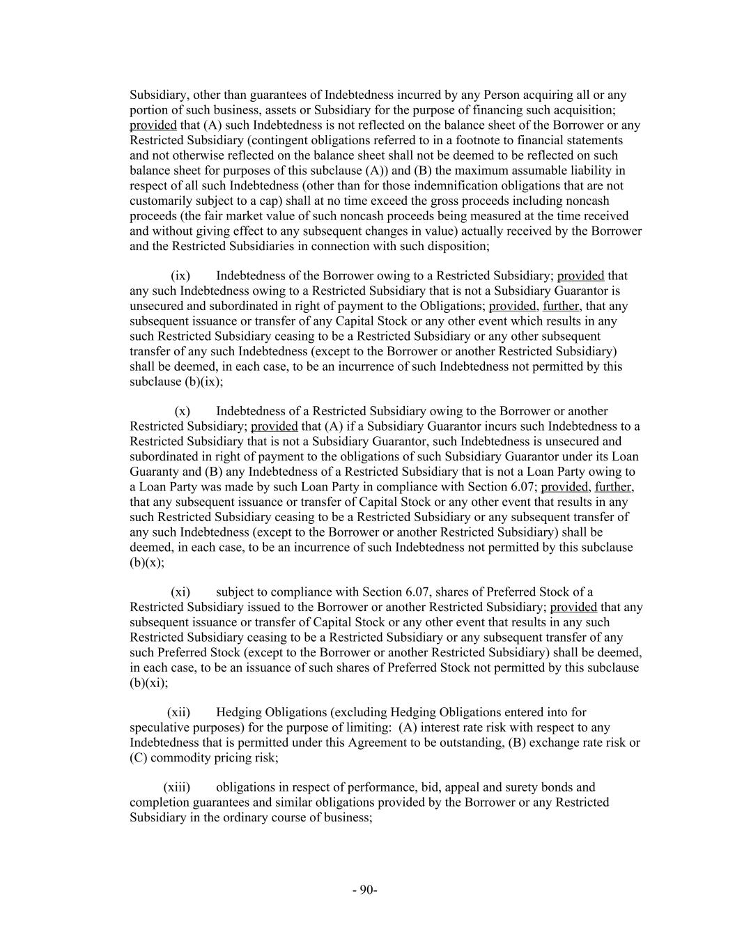 Subsidiary, other than guarantees of Indebtedness incurred by any Person acquiring all or any portion of such business, assets or Subsidiary for the purpose of financing such acquisition; provided that (A) such Indebtedness is not reflected on the balance sheet of the Borrower or any Restricted Subsidiary (contingent obligations referred to in a footnote to financial statements and not otherwise reflected on the balance sheet shall not be deemed to be reflected on such balance sheet for purposes of this subclause (A)) and (B) the maximum assumable liability in respect of all such Indebtedness (other than for those indemnification obligations that are not customarily subject to a cap) shall at no time exceed the gross proceeds including noncash proceeds (the fair market value of such noncash proceeds being measured at the time received and without giving effect to any subsequent changes in value) actually received by the Borrower and the Restricted Subsidiaries in connection with such disposition; Indebtedness of the Borrower owing to a Restricted Subsidiary; provided that(ix) any such Indebtedness owing to a Restricted Subsidiary that is not a Subsidiary Guarantor is unsecured and subordinated in right of payment to the Obligations; provided, further, that any subsequent issuance or transfer of any Capital Stock or any other event which results in any such Restricted Subsidiary ceasing to be a Restricted Subsidiary or any other subsequent transfer of any such Indebtedness (except to the Borrower or another Restricted Subsidiary) shall be deemed, in each case, to be an incurrence of such Indebtedness not permitted by this subclause (b)(ix); Indebtedness of a Restricted Subsidiary owing to the Borrower or another(x) Restricted Subsidiary; provided that (A) if a Subsidiary Guarantor incurs such Indebtedness to a Restricted Subsidiary that is not a Subsidiary Guarantor, such Indebtedness is unsecured and subordinated in right of payment to the obligations of such Subsidiary Guarantor under its Loan Guaranty and (B) any Indebtedness of a Restricted Subsidiary that is not a Loan Party owing to a Loan Party was made by such Loan Party in compliance with Section 6.07; provided, further, that any subsequent issuance or transfer of Capital Stock or any other event that results in any such Restricted Subsidiary ceasing to be a Restricted Subsidiary or any subsequent transfer of any such Indebtedness (except to the Borrower or another Restricted Subsidiary) shall be deemed, in each case, to be an incurrence of such Indebtedness not permitted by this subclause (b)(x); subject to compliance with Section 6.07, shares of Preferred Stock of a(xi) Restricted Subsidiary issued to the Borrower or another Restricted Subsidiary; provided that any subsequent issuance or transfer of Capital Stock or any other event that results in any such Restricted Subsidiary ceasing to be a Restricted Subsidiary or any subsequent transfer of any such Preferred Stock (except to the Borrower or another Restricted Subsidiary) shall be deemed, in each case, to be an issuance of such shares of Preferred Stock not permitted by this subclause (b)(xi); Hedging Obligations (excluding Hedging Obligations entered into for(xii) speculative purposes) for the purpose of limiting: (A) interest rate risk with respect to any Indebtedness that is permitted under this Agreement to be outstanding, (B) exchange rate risk or (C) commodity pricing risk; obligations in respect of performance, bid, appeal and surety bonds and(xiii) completion guarantees and similar obligations provided by the Borrower or any Restricted Subsidiary in the ordinary course of business; - 90-
