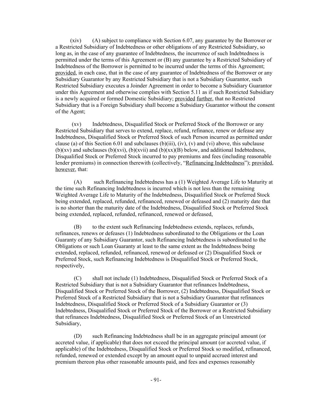(A) subject to compliance with Section 6.07, any guarantee by the Borrower or(xiv) a Restricted Subsidiary of Indebtedness or other obligations of any Restricted Subsidiary, so long as, in the case of any guarantee of Indebtedness, the incurrence of such Indebtedness is permitted under the terms of this Agreement or (B) any guarantee by a Restricted Subsidiary of Indebtedness of the Borrower is permitted to be incurred under the terms of this Agreement; provided, in each case, that in the case of any guarantee of Indebtedness of the Borrower or any Subsidiary Guarantor by any Restricted Subsidiary that is not a Subsidiary Guarantor, such Restricted Subsidiary executes a Joinder Agreement in order to become a Subsidiary Guarantor under this Agreement and otherwise complies with Section 5.11 as if such Restricted Subsidiary is a newly acquired or formed Domestic Subsidiary; provided further, that no Restricted Subsidiary that is a Foreign Subsidiary shall become a Subsidiary Guarantor without the consent of the Agent; Indebtedness, Disqualified Stock or Preferred Stock of the Borrower or any(xv) Restricted Subsidiary that serves to extend, replace, refund, refinance, renew or defease any Indebtedness, Disqualified Stock or Preferred Stock of such Person incurred as permitted under clause (a) of this Section 6.01 and subclauses (b)(iii), (iv), (v) and (vi) above, this subclause (b)(xv) and subclauses (b)(xvi), (b)(xvii) and (b)(xx)(B) below, and additional Indebtedness, Disqualified Stock or Preferred Stock incurred to pay premiums and fees (including reasonable lender premiums) in connection therewith (collectively, “Refinancing Indebtedness”); provided, however, that: such Refinancing Indebtedness has a (1) Weighted Average Life to Maturity at(A) the time such Refinancing Indebtedness is incurred which is not less than the remaining Weighted Average Life to Maturity of the Indebtedness, Disqualified Stock or Preferred Stock being extended, replaced, refunded, refinanced, renewed or defeased and (2) maturity date that is no shorter than the maturity date of the Indebtedness, Disqualified Stock or Preferred Stock being extended, replaced, refunded, refinanced, renewed or defeased, to the extent such Refinancing Indebtedness extends, replaces, refunds,(B) refinances, renews or defeases (1) Indebtedness subordinated to the Obligations or the Loan Guaranty of any Subsidiary Guarantor, such Refinancing Indebtedness is subordinated to the Obligations or such Loan Guaranty at least to the same extent as the Indebtedness being extended, replaced, refunded, refinanced, renewed or defeased or (2) Disqualified Stock or Preferred Stock, such Refinancing Indebtedness is Disqualified Stock or Preferred Stock, respectively, shall not include (1) Indebtedness, Disqualified Stock or Preferred Stock of a(C) Restricted Subsidiary that is not a Subsidiary Guarantor that refinances Indebtedness, Disqualified Stock or Preferred Stock of the Borrower, (2) Indebtedness, Disqualified Stock or Preferred Stock of a Restricted Subsidiary that is not a Subsidiary Guarantor that refinances Indebtedness, Disqualified Stock or Preferred Stock of a Subsidiary Guarantor or (3) Indebtedness, Disqualified Stock or Preferred Stock of the Borrower or a Restricted Subsidiary that refinances Indebtedness, Disqualified Stock or Preferred Stock of an Unrestricted Subsidiary, such Refinancing Indebtedness shall be in an aggregate principal amount (or(D) accreted value, if applicable) that does not exceed the principal amount (or accreted value, if applicable) of the Indebtedness, Disqualified Stock or Preferred Stock so modified, refinanced, refunded, renewed or extended except by an amount equal to unpaid accrued interest and premium thereon plus other reasonable amounts paid, and fees and expenses reasonably - 91-