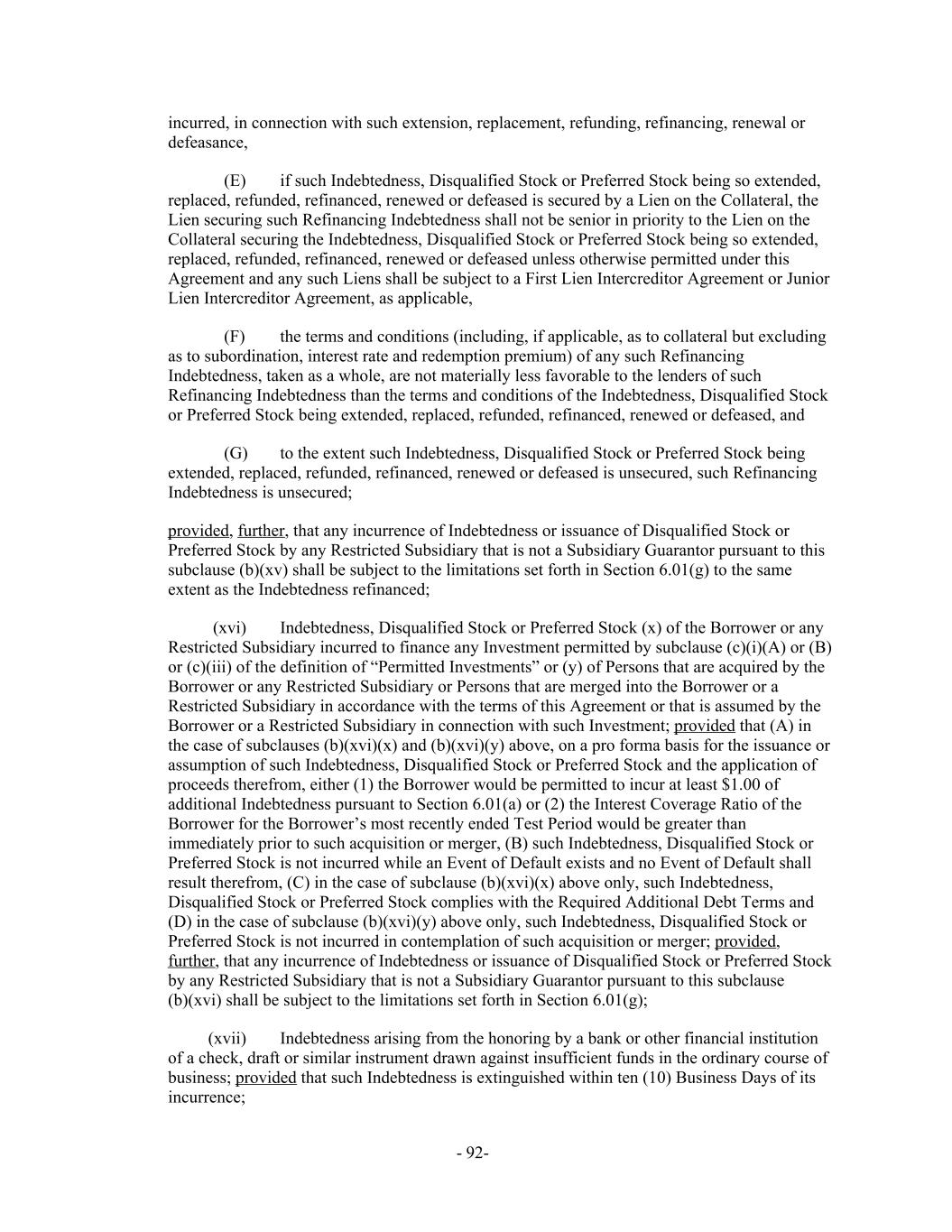 incurred, in connection with such extension, replacement, refunding, refinancing, renewal or defeasance, if such Indebtedness, Disqualified Stock or Preferred Stock being so extended,(E) replaced, refunded, refinanced, renewed or defeased is secured by a Lien on the Collateral, the Lien securing such Refinancing Indebtedness shall not be senior in priority to the Lien on the Collateral securing the Indebtedness, Disqualified Stock or Preferred Stock being so extended, replaced, refunded, refinanced, renewed or defeased unless otherwise permitted under this Agreement and any such Liens shall be subject to a First Lien Intercreditor Agreement or Junior Lien Intercreditor Agreement, as applicable, the terms and conditions (including, if applicable, as to collateral but excluding(F) as to subordination, interest rate and redemption premium) of any such Refinancing Indebtedness, taken as a whole, are not materially less favorable to the lenders of such Refinancing Indebtedness than the terms and conditions of the Indebtedness, Disqualified Stock or Preferred Stock being extended, replaced, refunded, refinanced, renewed or defeased, and to the extent such Indebtedness, Disqualified Stock or Preferred Stock being(G) extended, replaced, refunded, refinanced, renewed or defeased is unsecured, such Refinancing Indebtedness is unsecured; provided, further, that any incurrence of Indebtedness or issuance of Disqualified Stock or Preferred Stock by any Restricted Subsidiary that is not a Subsidiary Guarantor pursuant to this subclause (b)(xv) shall be subject to the limitations set forth in Section 6.01(g) to the same extent as the Indebtedness refinanced; Indebtedness, Disqualified Stock or Preferred Stock (x) of the Borrower or any(xvi) Restricted Subsidiary incurred to finance any Investment permitted by subclause (c)(i)(A) or (B) or (c)(iii) of the definition of “Permitted Investments” or (y) of Persons that are acquired by the Borrower or any Restricted Subsidiary or Persons that are merged into the Borrower or a Restricted Subsidiary in accordance with the terms of this Agreement or that is assumed by the Borrower or a Restricted Subsidiary in connection with such Investment; provided that (A) in the case of subclauses (b)(xvi)(x) and (b)(xvi)(y) above, on a pro forma basis for the issuance or assumption of such Indebtedness, Disqualified Stock or Preferred Stock and the application of proceeds therefrom, either (1) the Borrower would be permitted to incur at least $1.00 of additional Indebtedness pursuant to Section 6.01(a) or (2) the Interest Coverage Ratio of the Borrower for the Borrower’s most recently ended Test Period would be greater than immediately prior to such acquisition or merger, (B) such Indebtedness, Disqualified Stock or Preferred Stock is not incurred while an Event of Default exists and no Event of Default shall result therefrom, (C) in the case of subclause (b)(xvi)(x) above only, such Indebtedness, Disqualified Stock or Preferred Stock complies with the Required Additional Debt Terms and (D) in the case of subclause (b)(xvi)(y) above only, such Indebtedness, Disqualified Stock or Preferred Stock is not incurred in contemplation of such acquisition or merger; provided, further, that any incurrence of Indebtedness or issuance of Disqualified Stock or Preferred Stock by any Restricted Subsidiary that is not a Subsidiary Guarantor pursuant to this subclause (b)(xvi) shall be subject to the limitations set forth in Section 6.01(g); Indebtedness arising from the honoring by a bank or other financial institution(xvii) of a check, draft or similar instrument drawn against insufficient funds in the ordinary course of business; provided that such Indebtedness is extinguished within ten (10) Business Days of its incurrence; - 92-