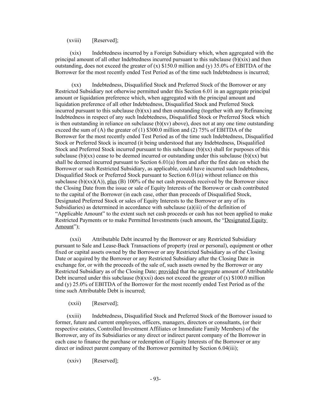 [Reserved];(xviii) Indebtedness incurred by a Foreign Subsidiary which, when aggregated with the(xix) principal amount of all other Indebtedness incurred pursuant to this subclause (b)(xix) and then outstanding, does not exceed the greater of (x) $150.0 million and (y) 35.0% of EBITDA of the Borrower for the most recently ended Test Period as of the time such Indebtedness is incurred; Indebtedness, Disqualified Stock and Preferred Stock of the Borrower or any(xx) Restricted Subsidiary not otherwise permitted under this Section 6.01 in an aggregate principal amount or liquidation preference which, when aggregated with the principal amount and liquidation preference of all other Indebtedness, Disqualified Stock and Preferred Stock incurred pursuant to this subclause (b)(xx) and then outstanding (together with any Refinancing Indebtedness in respect of any such Indebtedness, Disqualified Stock or Preferred Stock which is then outstanding in reliance on subclause (b)(xv) above), does not at any one time outstanding exceed the sum of (A) the greater of (1) $300.0 million and (2) 75% of EBITDA of the Borrower for the most recently ended Test Period as of the time such Indebtedness, Disqualified Stock or Preferred Stock is incurred (it being understood that any Indebtedness, Disqualified Stock and Preferred Stock incurred pursuant to this subclause (b)(xx) shall for purposes of this subclause (b)(xx) cease to be deemed incurred or outstanding under this subclause (b)(xx) but shall be deemed incurred pursuant to Section 6.01(a) from and after the first date on which the Borrower or such Restricted Subsidiary, as applicable, could have incurred such Indebtedness, Disqualified Stock or Preferred Stock pursuant to Section 6.01(a) without reliance on this subclause (b)(xx)(A)), plus (B) 100% of the net cash proceeds received by the Borrower since the Closing Date from the issue or sale of Equity Interests of the Borrower or cash contributed to the capital of the Borrower (in each case, other than proceeds of Disqualified Stock, Designated Preferred Stock or sales of Equity Interests to the Borrower or any of its Subsidiaries) as determined in accordance with subclause (a)(iii) of the definition of “Applicable Amount” to the extent such net cash proceeds or cash has not been applied to make Restricted Payments or to make Permitted Investments (such amount, the “Designated Equity Amount”); Attributable Debt incurred by the Borrower or any Restricted Subsidiary(xxi) pursuant to Sale and Lease-Back Transactions of property (real or personal), equipment or other fixed or capital assets owned by the Borrower or any Restricted Subsidiary as of the Closing Date or acquired by the Borrower or any Restricted Subsidiary after the Closing Date in exchange for, or with the proceeds of the sale of, such assets owned by the Borrower or any Restricted Subsidiary as of the Closing Date; provided that the aggregate amount of Attributable Debt incurred under this subclause (b)(xxi) does not exceed the greater of (x) $100.0 million and (y) 25.0% of EBITDA of the Borrower for the most recently ended Test Period as of the time such Attributable Debt is incurred; [Reserved];(xxii) Indebtedness, Disqualified Stock and Preferred Stock of the Borrower issued to(xxiii) former, future and current employees, officers, managers, directors or consultants, (or their respective estates, Controlled Investment Affiliates or Immediate Family Members) of the Borrower, any of its Subsidiaries or any direct or indirect parent company of the Borrower in each case to finance the purchase or redemption of Equity Interests of the Borrower or any direct or indirect parent company of the Borrower permitted by Section 6.04(iii); [Reserved];(xxiv) - 93-