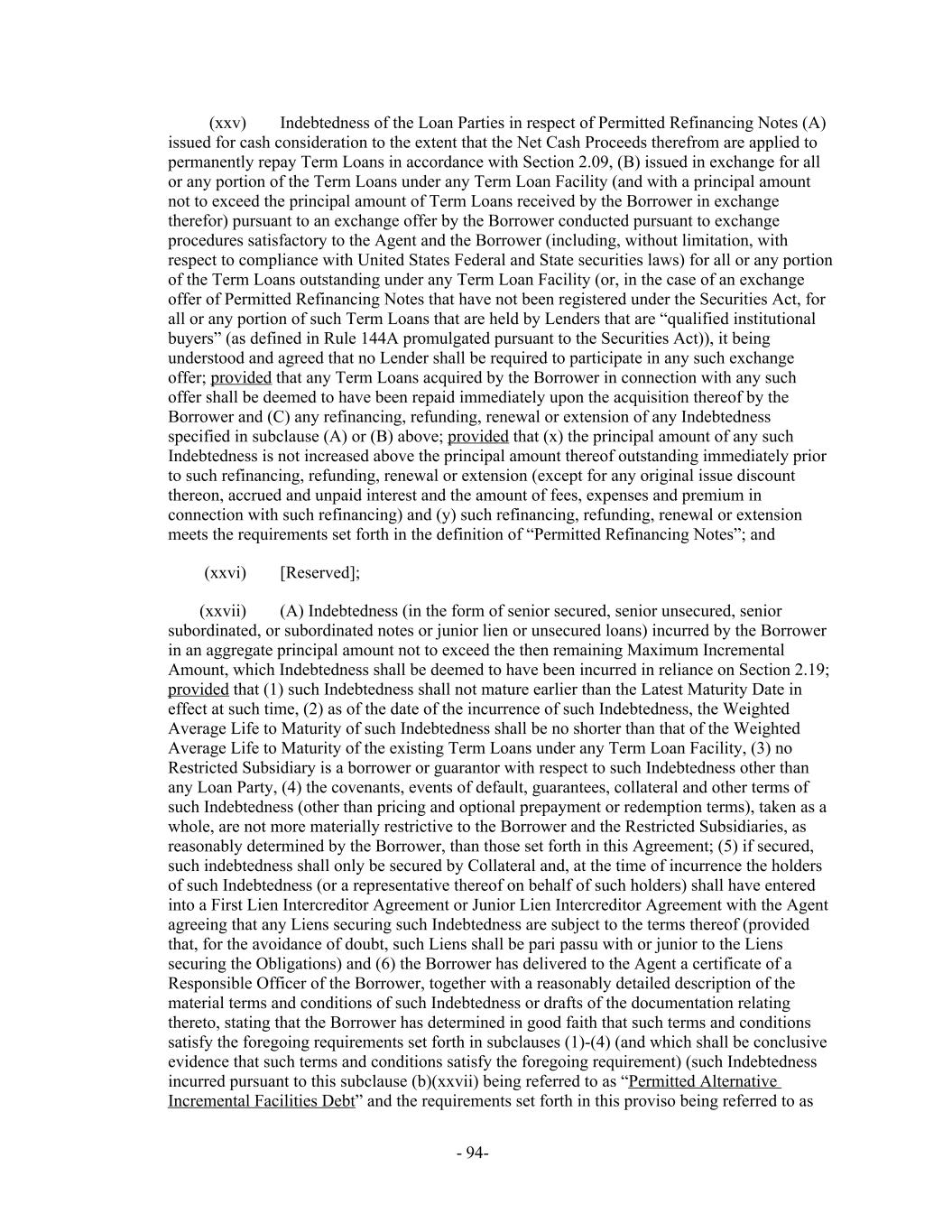 Indebtedness of the Loan Parties in respect of Permitted Refinancing Notes (A)(xxv) issued for cash consideration to the extent that the Net Cash Proceeds therefrom are applied to permanently repay Term Loans in accordance with Section 2.09, (B) issued in exchange for all or any portion of the Term Loans under any Term Loan Facility (and with a principal amount not to exceed the principal amount of Term Loans received by the Borrower in exchange therefor) pursuant to an exchange offer by the Borrower conducted pursuant to exchange procedures satisfactory to the Agent and the Borrower (including, without limitation, with respect to compliance with United States Federal and State securities laws) for all or any portion of the Term Loans outstanding under any Term Loan Facility (or, in the case of an exchange offer of Permitted Refinancing Notes that have not been registered under the Securities Act, for all or any portion of such Term Loans that are held by Lenders that are “qualified institutional buyers” (as defined in Rule 144A promulgated pursuant to the Securities Act)), it being understood and agreed that no Lender shall be required to participate in any such exchange offer; provided that any Term Loans acquired by the Borrower in connection with any such offer shall be deemed to have been repaid immediately upon the acquisition thereof by the Borrower and (C) any refinancing, refunding, renewal or extension of any Indebtedness specified in subclause (A) or (B) above; provided that (x) the principal amount of any such Indebtedness is not increased above the principal amount thereof outstanding immediately prior to such refinancing, refunding, renewal or extension (except for any original issue discount thereon, accrued and unpaid interest and the amount of fees, expenses and premium in connection with such refinancing) and (y) such refinancing, refunding, renewal or extension meets the requirements set forth in the definition of “Permitted Refinancing Notes”; and [Reserved];(xxvi) (A) Indebtedness (in the form of senior secured, senior unsecured, senior(xxvii) subordinated, or subordinated notes or junior lien or unsecured loans) incurred by the Borrower in an aggregate principal amount not to exceed the then remaining Maximum Incremental Amount, which Indebtedness shall be deemed to have been incurred in reliance on Section 2.19; provided that (1) such Indebtedness shall not mature earlier than the Latest Maturity Date in effect at such time, (2) as of the date of the incurrence of such Indebtedness, the Weighted Average Life to Maturity of such Indebtedness shall be no shorter than that of the Weighted Average Life to Maturity of the existing Term Loans under any Term Loan Facility, (3) no Restricted Subsidiary is a borrower or guarantor with respect to such Indebtedness other than any Loan Party, (4) the covenants, events of default, guarantees, collateral and other terms of such Indebtedness (other than pricing and optional prepayment or redemption terms), taken as a whole, are not more materially restrictive to the Borrower and the Restricted Subsidiaries, as reasonably determined by the Borrower, than those set forth in this Agreement; (5) if secured, such indebtedness shall only be secured by Collateral and, at the time of incurrence the holders of such Indebtedness (or a representative thereof on behalf of such holders) shall have entered into a First Lien Intercreditor Agreement or Junior Lien Intercreditor Agreement with the Agent agreeing that any Liens securing such Indebtedness are subject to the terms thereof (provided that, for the avoidance of doubt, such Liens shall be pari passu with or junior to the Liens securing the Obligations) and (6) the Borrower has delivered to the Agent a certificate of a Responsible Officer of the Borrower, together with a reasonably detailed description of the material terms and conditions of such Indebtedness or drafts of the documentation relating thereto, stating that the Borrower has determined in good faith that such terms and conditions satisfy the foregoing requirements set forth in subclauses (1)-(4) (and which shall be conclusive evidence that such terms and conditions satisfy the foregoing requirement) (such Indebtedness incurred pursuant to this subclause (b)(xxvii) being referred to as “Permitted Alternative Incremental Facilities Debt” and the requirements set forth in this proviso being referred to as - 94-