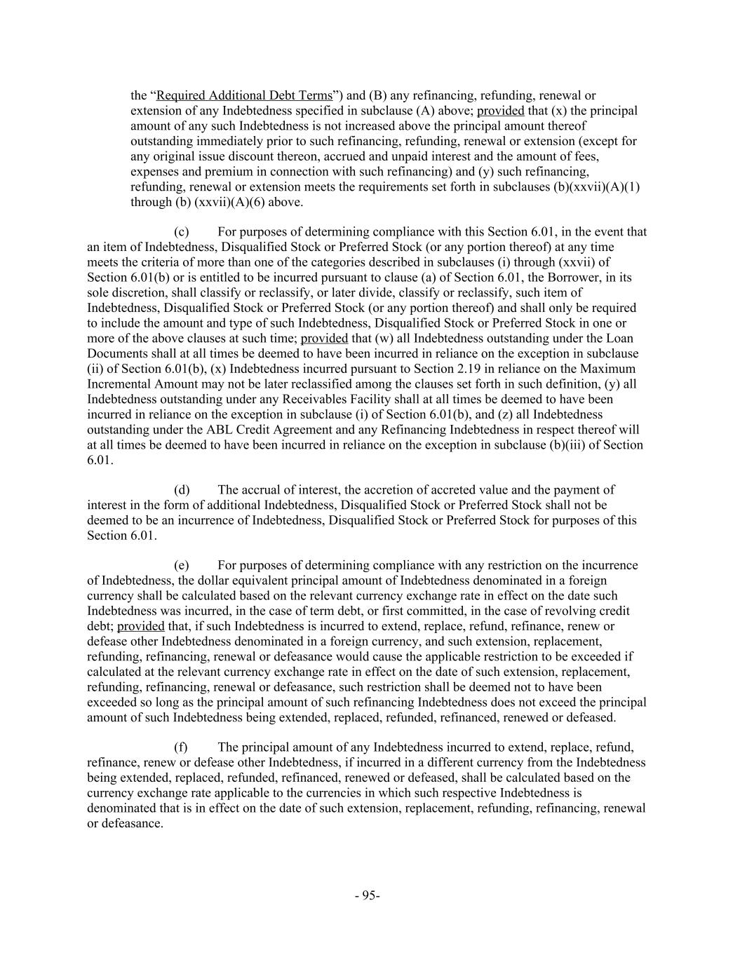 the “Required Additional Debt Terms”) and (B) any refinancing, refunding, renewal or extension of any Indebtedness specified in subclause (A) above; provided that (x) the principal amount of any such Indebtedness is not increased above the principal amount thereof outstanding immediately prior to such refinancing, refunding, renewal or extension (except for any original issue discount thereon, accrued and unpaid interest and the amount of fees, expenses and premium in connection with such refinancing) and (y) such refinancing, refunding, renewal or extension meets the requirements set forth in subclauses (b)(xxvii)(A)(1) through (b) (xxvii)(A)(6) above. For purposes of determining compliance with this Section 6.01, in the event that(c) an item of Indebtedness, Disqualified Stock or Preferred Stock (or any portion thereof) at any time meets the criteria of more than one of the categories described in subclauses (i) through (xxvii) of Section 6.01(b) or is entitled to be incurred pursuant to clause (a) of Section 6.01, the Borrower, in its sole discretion, shall classify or reclassify, or later divide, classify or reclassify, such item of Indebtedness, Disqualified Stock or Preferred Stock (or any portion thereof) and shall only be required to include the amount and type of such Indebtedness, Disqualified Stock or Preferred Stock in one or more of the above clauses at such time; provided that (w) all Indebtedness outstanding under the Loan Documents shall at all times be deemed to have been incurred in reliance on the exception in subclause (ii) of Section 6.01(b), (x) Indebtedness incurred pursuant to Section 2.19 in reliance on the Maximum Incremental Amount may not be later reclassified among the clauses set forth in such definition, (y) all Indebtedness outstanding under any Receivables Facility shall at all times be deemed to have been incurred in reliance on the exception in subclause (i) of Section 6.01(b), and (z) all Indebtedness outstanding under the ABL Credit Agreement and any Refinancing Indebtedness in respect thereof will at all times be deemed to have been incurred in reliance on the exception in subclause (b)(iii) of Section 6.01. The accrual of interest, the accretion of accreted value and the payment of(d) interest in the form of additional Indebtedness, Disqualified Stock or Preferred Stock shall not be deemed to be an incurrence of Indebtedness, Disqualified Stock or Preferred Stock for purposes of this Section 6.01. For purposes of determining compliance with any restriction on the incurrence(e) of Indebtedness, the dollar equivalent principal amount of Indebtedness denominated in a foreign currency shall be calculated based on the relevant currency exchange rate in effect on the date such Indebtedness was incurred, in the case of term debt, or first committed, in the case of revolving credit debt; provided that, if such Indebtedness is incurred to extend, replace, refund, refinance, renew or defease other Indebtedness denominated in a foreign currency, and such extension, replacement, refunding, refinancing, renewal or defeasance would cause the applicable restriction to be exceeded if calculated at the relevant currency exchange rate in effect on the date of such extension, replacement, refunding, refinancing, renewal or defeasance, such restriction shall be deemed not to have been exceeded so long as the principal amount of such refinancing Indebtedness does not exceed the principal amount of such Indebtedness being extended, replaced, refunded, refinanced, renewed or defeased. The principal amount of any Indebtedness incurred to extend, replace, refund,(f) refinance, renew or defease other Indebtedness, if incurred in a different currency from the Indebtedness being extended, replaced, refunded, refinanced, renewed or defeased, shall be calculated based on the currency exchange rate applicable to the currencies in which such respective Indebtedness is denominated that is in effect on the date of such extension, replacement, refunding, refinancing, renewal or defeasance. - 95-