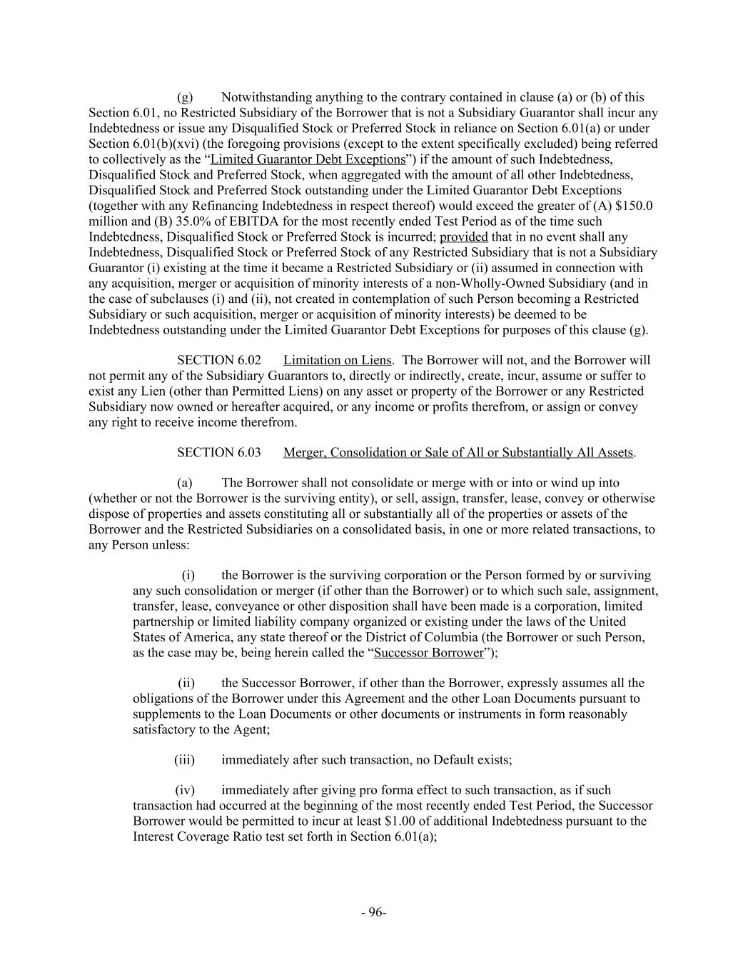 Notwithstanding anything to the contrary contained in clause (a) or (b) of this(g) Section 6.01, no Restricted Subsidiary of the Borrower that is not a Subsidiary Guarantor shall incur any Indebtedness or issue any Disqualified Stock or Preferred Stock in reliance on Section 6.01(a) or under Section 6.01(b)(xvi) (the foregoing provisions (except to the extent specifically excluded) being referred to collectively as the “Limited Guarantor Debt Exceptions”) if the amount of such Indebtedness, Disqualified Stock and Preferred Stock, when aggregated with the amount of all other Indebtedness, Disqualified Stock and Preferred Stock outstanding under the Limited Guarantor Debt Exceptions (together with any Refinancing Indebtedness in respect thereof) would exceed the greater of (A) $150.0 million and (B) 35.0% of EBITDA for the most recently ended Test Period as of the time such Indebtedness, Disqualified Stock or Preferred Stock is incurred; provided that in no event shall any Indebtedness, Disqualified Stock or Preferred Stock of any Restricted Subsidiary that is not a Subsidiary Guarantor (i) existing at the time it became a Restricted Subsidiary or (ii) assumed in connection with any acquisition, merger or acquisition of minority interests of a non-Wholly-Owned Subsidiary (and in the case of subclauses (i) and (ii), not created in contemplation of such Person becoming a Restricted Subsidiary or such acquisition, merger or acquisition of minority interests) be deemed to be Indebtedness outstanding under the Limited Guarantor Debt Exceptions for purposes of this clause (g). Limitation on Liens. The Borrower will not, and the Borrower willSECTION 6.02 not permit any of the Subsidiary Guarantors to, directly or indirectly, create, incur, assume or suffer to exist any Lien (other than Permitted Liens) on any asset or property of the Borrower or any Restricted Subsidiary now owned or hereafter acquired, or any income or profits therefrom, or assign or convey any right to receive income therefrom. Merger, Consolidation or Sale of All or Substantially All Assets.SECTION 6.03 The Borrower shall not consolidate or merge with or into or wind up into(a) (whether or not the Borrower is the surviving entity), or sell, assign, transfer, lease, convey or otherwise dispose of properties and assets constituting all or substantially all of the properties or assets of the Borrower and the Restricted Subsidiaries on a consolidated basis, in one or more related transactions, to any Person unless: the Borrower is the surviving corporation or the Person formed by or surviving(i) any such consolidation or merger (if other than the Borrower) or to which such sale, assignment, transfer, lease, conveyance or other disposition shall have been made is a corporation, limited partnership or limited liability company organized or existing under the laws of the United States of America, any state thereof or the District of Columbia (the Borrower or such Person, as the case may be, being herein called the “Successor Borrower”); the Successor Borrower, if other than the Borrower, expressly assumes all the(ii) obligations of the Borrower under this Agreement and the other Loan Documents pursuant to supplements to the Loan Documents or other documents or instruments in form reasonably satisfactory to the Agent; immediately after such transaction, no Default exists;(iii) immediately after giving pro forma effect to such transaction, as if such(iv) transaction had occurred at the beginning of the most recently ended Test Period, the Successor Borrower would be permitted to incur at least $1.00 of additional Indebtedness pursuant to the Interest Coverage Ratio test set forth in Section 6.01(a); - 96-