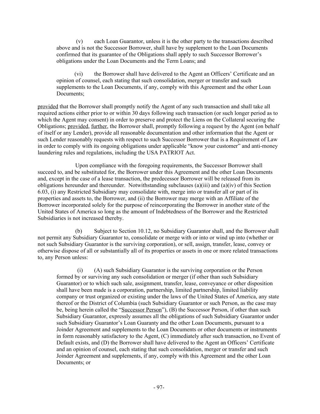 each Loan Guarantor, unless it is the other party to the transactions described(v) above and is not the Successor Borrower, shall have by supplement to the Loan Documents confirmed that its guarantee of the Obligations shall apply to such Successor Borrower’s obligations under the Loan Documents and the Term Loans; and the Borrower shall have delivered to the Agent an Officers’ Certificate and an(vi) opinion of counsel, each stating that such consolidation, merger or transfer and such supplements to the Loan Documents, if any, comply with this Agreement and the other Loan Documents; provided that the Borrower shall promptly notify the Agent of any such transaction and shall take all required actions either prior to or within 30 days following such transaction (or such longer period as to which the Agent may consent) in order to preserve and protect the Liens on the Collateral securing the Obligations; provided, further, the Borrower shall, promptly following a request by the Agent (on behalf of itself or any Lender), provide all reasonable documentation and other information that the Agent or such Lender reasonably requests with respect to such Successor Borrower that is a Requirement of Law in order to comply with its ongoing obligations under applicable “know your customer” and anti-money laundering rules and regulations, including the USA PATRIOT Act. Upon compliance with the foregoing requirements, the Successor Borrower shall succeed to, and be substituted for, the Borrower under this Agreement and the other Loan Documents and, except in the case of a lease transaction, the predecessor Borrower will be released from its obligations hereunder and thereunder. Notwithstanding subclauses (a)(iii) and (a)(iv) of this Section 6.03, (i) any Restricted Subsidiary may consolidate with, merge into or transfer all or part of its properties and assets to, the Borrower, and (ii) the Borrower may merge with an Affiliate of the Borrower incorporated solely for the purpose of reincorporating the Borrower in another state of the United States of America so long as the amount of Indebtedness of the Borrower and the Restricted Subsidiaries is not increased thereby. Subject to Section 10.12, no Subsidiary Guarantor shall, and the Borrower shall(b) not permit any Subsidiary Guarantor to, consolidate or merge with or into or wind up into (whether or not such Subsidiary Guarantor is the surviving corporation), or sell, assign, transfer, lease, convey or otherwise dispose of all or substantially all of its properties or assets in one or more related transactions to, any Person unless: (A) such Subsidiary Guarantor is the surviving corporation or the Person(i) formed by or surviving any such consolidation or merger (if other than such Subsidiary Guarantor) or to which such sale, assignment, transfer, lease, conveyance or other disposition shall have been made is a corporation, partnership, limited partnership, limited liability company or trust organized or existing under the laws of the United States of America, any state thereof or the District of Columbia (such Subsidiary Guarantor or such Person, as the case may be, being herein called the “Successor Person”), (B) the Successor Person, if other than such Subsidiary Guarantor, expressly assumes all the obligations of such Subsidiary Guarantor under such Subsidiary Guarantor’s Loan Guaranty and the other Loan Documents, pursuant to a Joinder Agreement and supplements to the Loan Documents or other documents or instruments in form reasonably satisfactory to the Agent, (C) immediately after such transaction, no Event of Default exists, and (D) the Borrower shall have delivered to the Agent an Officers’ Certificate and an opinion of counsel, each stating that such consolidation, merger or transfer and such Joinder Agreement and supplements, if any, comply with this Agreement and the other Loan Documents; or - 97-
