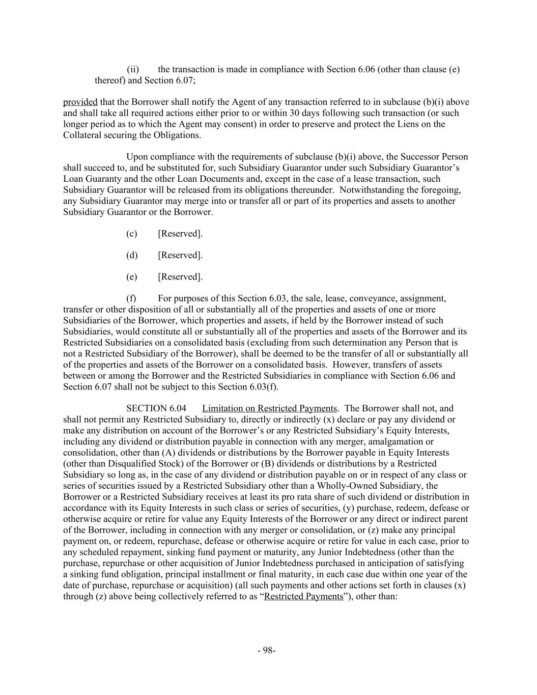 the transaction is made in compliance with Section 6.06 (other than clause (e)(ii) thereof) and Section 6.07; provided that the Borrower shall notify the Agent of any transaction referred to in subclause (b)(i) above and shall take all required actions either prior to or within 30 days following such transaction (or such longer period as to which the Agent may consent) in order to preserve and protect the Liens on the Collateral securing the Obligations. Upon compliance with the requirements of subclause (b)(i) above, the Successor Person shall succeed to, and be substituted for, such Subsidiary Guarantor under such Subsidiary Guarantor’s Loan Guaranty and the other Loan Documents and, except in the case of a lease transaction, such Subsidiary Guarantor will be released from its obligations thereunder. Notwithstanding the foregoing, any Subsidiary Guarantor may merge into or transfer all or part of its properties and assets to another Subsidiary Guarantor or the Borrower. [Reserved].(c) [Reserved].(d) [Reserved].(e) For purposes of this Section 6.03, the sale, lease, conveyance, assignment,(f) transfer or other disposition of all or substantially all of the properties and assets of one or more Subsidiaries of the Borrower, which properties and assets, if held by the Borrower instead of such Subsidiaries, would constitute all or substantially all of the properties and assets of the Borrower and its Restricted Subsidiaries on a consolidated basis (excluding from such determination any Person that is not a Restricted Subsidiary of the Borrower), shall be deemed to be the transfer of all or substantially all of the properties and assets of the Borrower on a consolidated basis. However, transfers of assets between or among the Borrower and the Restricted Subsidiaries in compliance with Section 6.06 and Section 6.07 shall not be subject to this Section 6.03(f). Limitation on Restricted Payments. The Borrower shall not, andSECTION 6.04 shall not permit any Restricted Subsidiary to, directly or indirectly (x) declare or pay any dividend or make any distribution on account of the Borrower’s or any Restricted Subsidiary’s Equity Interests, including any dividend or distribution payable in connection with any merger, amalgamation or consolidation, other than (A) dividends or distributions by the Borrower payable in Equity Interests (other than Disqualified Stock) of the Borrower or (B) dividends or distributions by a Restricted Subsidiary so long as, in the case of any dividend or distribution payable on or in respect of any class or series of securities issued by a Restricted Subsidiary other than a Wholly-Owned Subsidiary, the Borrower or a Restricted Subsidiary receives at least its pro rata share of such dividend or distribution in accordance with its Equity Interests in such class or series of securities, (y) purchase, redeem, defease or otherwise acquire or retire for value any Equity Interests of the Borrower or any direct or indirect parent of the Borrower, including in connection with any merger or consolidation, or (z) make any principal payment on, or redeem, repurchase, defease or otherwise acquire or retire for value in each case, prior to any scheduled repayment, sinking fund payment or maturity, any Junior Indebtedness (other than the purchase, repurchase or other acquisition of Junior Indebtedness purchased in anticipation of satisfying a sinking fund obligation, principal installment or final maturity, in each case due within one year of the date of purchase, repurchase or acquisition) (all such payments and other actions set forth in clauses (x) through (z) above being collectively referred to as “Restricted Payments”), other than: - 98-