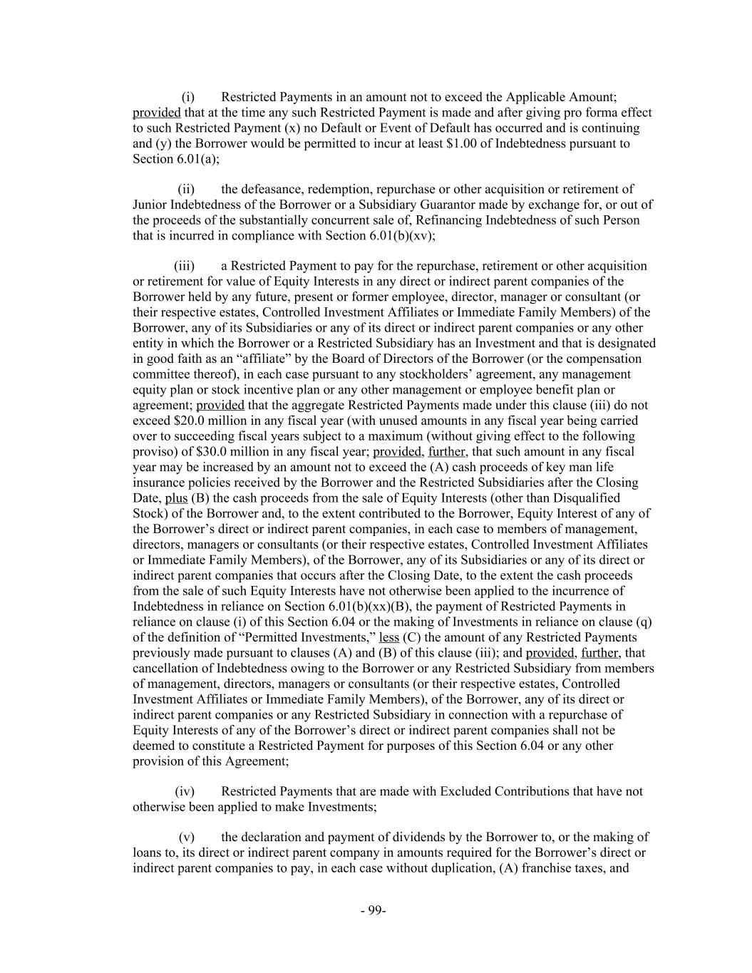 Restricted Payments in an amount not to exceed the Applicable Amount;(i) provided that at the time any such Restricted Payment is made and after giving pro forma effect to such Restricted Payment (x) no Default or Event of Default has occurred and is continuing and (y) the Borrower would be permitted to incur at least $1.00 of Indebtedness pursuant to Section 6.01(a); the defeasance, redemption, repurchase or other acquisition or retirement of(ii) Junior Indebtedness of the Borrower or a Subsidiary Guarantor made by exchange for, or out of the proceeds of the substantially concurrent sale of, Refinancing Indebtedness of such Person that is incurred in compliance with Section 6.01(b)(xv); a Restricted Payment to pay for the repurchase, retirement or other acquisition(iii) or retirement for value of Equity Interests in any direct or indirect parent companies of the Borrower held by any future, present or former employee, director, manager or consultant (or their respective estates, Controlled Investment Affiliates or Immediate Family Members) of the Borrower, any of its Subsidiaries or any of its direct or indirect parent companies or any other entity in which the Borrower or a Restricted Subsidiary has an Investment and that is designated in good faith as an “affiliate” by the Board of Directors of the Borrower (or the compensation committee thereof), in each case pursuant to any stockholders’ agreement, any management equity plan or stock incentive plan or any other management or employee benefit plan or agreement; provided that the aggregate Restricted Payments made under this clause (iii) do not exceed $20.0 million in any fiscal year (with unused amounts in any fiscal year being carried over to succeeding fiscal years subject to a maximum (without giving effect to the following proviso) of $30.0 million in any fiscal year; provided, further, that such amount in any fiscal year may be increased by an amount not to exceed the (A) cash proceeds of key man life insurance policies received by the Borrower and the Restricted Subsidiaries after the Closing Date, plus (B) the cash proceeds from the sale of Equity Interests (other than Disqualified Stock) of the Borrower and, to the extent contributed to the Borrower, Equity Interest of any of the Borrower’s direct or indirect parent companies, in each case to members of management, directors, managers or consultants (or their respective estates, Controlled Investment Affiliates or Immediate Family Members), of the Borrower, any of its Subsidiaries or any of its direct or indirect parent companies that occurs after the Closing Date, to the extent the cash proceeds from the sale of such Equity Interests have not otherwise been applied to the incurrence of Indebtedness in reliance on Section 6.01(b)(xx)(B), the payment of Restricted Payments in reliance on clause (i) of this Section 6.04 or the making of Investments in reliance on clause (q) of the definition of “Permitted Investments,” less (C) the amount of any Restricted Payments previously made pursuant to clauses (A) and (B) of this clause (iii); and provided, further, that cancellation of Indebtedness owing to the Borrower or any Restricted Subsidiary from members of management, directors, managers or consultants (or their respective estates, Controlled Investment Affiliates or Immediate Family Members), of the Borrower, any of its direct or indirect parent companies or any Restricted Subsidiary in connection with a repurchase of Equity Interests of any of the Borrower’s direct or indirect parent companies shall not be deemed to constitute a Restricted Payment for purposes of this Section 6.04 or any other provision of this Agreement; Restricted Payments that are made with Excluded Contributions that have not(iv) otherwise been applied to make Investments; the declaration and payment of dividends by the Borrower to, or the making of(v) loans to, its direct or indirect parent company in amounts required for the Borrower’s direct or indirect parent companies to pay, in each case without duplication, (A) franchise taxes, and - 99-