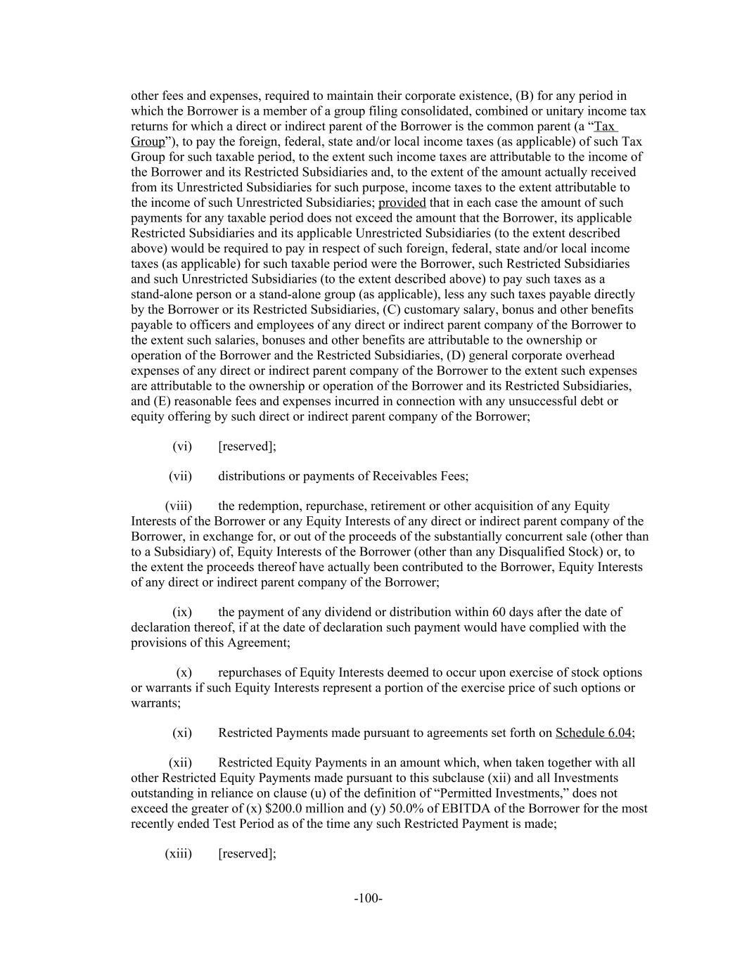 other fees and expenses, required to maintain their corporate existence, (B) for any period in which the Borrower is a member of a group filing consolidated, combined or unitary income tax returns for which a direct or indirect parent of the Borrower is the common parent (a “Tax Group”), to pay the foreign, federal, state and/or local income taxes (as applicable) of such Tax Group for such taxable period, to the extent such income taxes are attributable to the income of the Borrower and its Restricted Subsidiaries and, to the extent of the amount actually received from its Unrestricted Subsidiaries for such purpose, income taxes to the extent attributable to the income of such Unrestricted Subsidiaries; provided that in each case the amount of such payments for any taxable period does not exceed the amount that the Borrower, its applicable Restricted Subsidiaries and its applicable Unrestricted Subsidiaries (to the extent described above) would be required to pay in respect of such foreign, federal, state and/or local income taxes (as applicable) for such taxable period were the Borrower, such Restricted Subsidiaries and such Unrestricted Subsidiaries (to the extent described above) to pay such taxes as a stand-alone person or a stand-alone group (as applicable), less any such taxes payable directly by the Borrower or its Restricted Subsidiaries, (C) customary salary, bonus and other benefits payable to officers and employees of any direct or indirect parent company of the Borrower to the extent such salaries, bonuses and other benefits are attributable to the ownership or operation of the Borrower and the Restricted Subsidiaries, (D) general corporate overhead expenses of any direct or indirect parent company of the Borrower to the extent such expenses are attributable to the ownership or operation of the Borrower and its Restricted Subsidiaries, and (E) reasonable fees and expenses incurred in connection with any unsuccessful debt or equity offering by such direct or indirect parent company of the Borrower; [reserved];(vi) distributions or payments of Receivables Fees;(vii) the redemption, repurchase, retirement or other acquisition of any Equity(viii) Interests of the Borrower or any Equity Interests of any direct or indirect parent company of the Borrower, in exchange for, or out of the proceeds of the substantially concurrent sale (other than to a Subsidiary) of, Equity Interests of the Borrower (other than any Disqualified Stock) or, to the extent the proceeds thereof have actually been contributed to the Borrower, Equity Interests of any direct or indirect parent company of the Borrower; the payment of any dividend or distribution within 60 days after the date of(ix) declaration thereof, if at the date of declaration such payment would have complied with the provisions of this Agreement; repurchases of Equity Interests deemed to occur upon exercise of stock options(x) or warrants if such Equity Interests represent a portion of the exercise price of such options or warrants; Restricted Payments made pursuant to agreements set forth on Schedule 6.04;(xi) Restricted Equity Payments in an amount which, when taken together with all(xii) other Restricted Equity Payments made pursuant to this subclause (xii) and all Investments outstanding in reliance on clause (u) of the definition of “Permitted Investments,” does not exceed the greater of (x) $200.0 million and (y) 50.0% of EBITDA of the Borrower for the most recently ended Test Period as of the time any such Restricted Payment is made; [reserved];(xiii) -100-