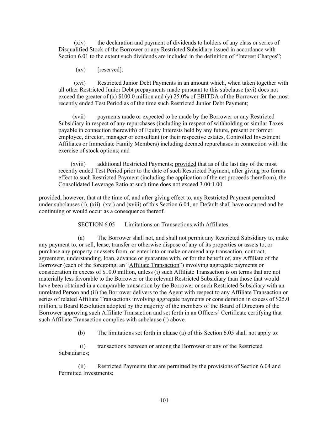 the declaration and payment of dividends to holders of any class or series of(xiv) Disqualified Stock of the Borrower or any Restricted Subsidiary issued in accordance with Section 6.01 to the extent such dividends are included in the definition of “Interest Charges”; [reserved];(xv) Restricted Junior Debt Payments in an amount which, when taken together with(xvi) all other Restricted Junior Debt prepayments made pursuant to this subclause (xvi) does not exceed the greater of (x) $100.0 million and (y) 25.0% of EBITDA of the Borrower for the most recently ended Test Period as of the time such Restricted Junior Debt Payment; payments made or expected to be made by the Borrower or any Restricted(xvii) Subsidiary in respect of any repurchases (including in respect of withholding or similar Taxes payable in connection therewith) of Equity Interests held by any future, present or former employee, director, manager or consultant (or their respective estates, Controlled Investment Affiliates or Immediate Family Members) including deemed repurchases in connection with the exercise of stock options; and additional Restricted Payments; provided that as of the last day of the most(xviii) recently ended Test Period prior to the date of such Restricted Payment, after giving pro forma effect to such Restricted Payment (including the application of the net proceeds therefrom), the Consolidated Leverage Ratio at such time does not exceed 3.00:1.00. provided, however, that at the time of, and after giving effect to, any Restricted Payment permitted under subclauses (i), (xii), (xvi) and (xviii) of this Section 6.04, no Default shall have occurred and be continuing or would occur as a consequence thereof. Limitations on Transactions with Affiliates.SECTION 6.05 The Borrower shall not, and shall not permit any Restricted Subsidiary to, make(a) any payment to, or sell, lease, transfer or otherwise dispose of any of its properties or assets to, or purchase any property or assets from, or enter into or make or amend any transaction, contract, agreement, understanding, loan, advance or guarantee with, or for the benefit of, any Affiliate of the Borrower (each of the foregoing, an “Affiliate Transaction”) involving aggregate payments or consideration in excess of $10.0 million, unless (i) such Affiliate Transaction is on terms that are not materially less favorable to the Borrower or the relevant Restricted Subsidiary than those that would have been obtained in a comparable transaction by the Borrower or such Restricted Subsidiary with an unrelated Person and (ii) the Borrower delivers to the Agent with respect to any Affiliate Transaction or series of related Affiliate Transactions involving aggregate payments or consideration in excess of $25.0 million, a Board Resolution adopted by the majority of the members of the Board of Directors of the Borrower approving such Affiliate Transaction and set forth in an Officers’ Certificate certifying that such Affiliate Transaction complies with subclause (i) above. The limitations set forth in clause (a) of this Section 6.05 shall not apply to:(b) transactions between or among the Borrower or any of the Restricted(i) Subsidiaries; Restricted Payments that are permitted by the provisions of Section 6.04 and(ii) Permitted Investments; -101-