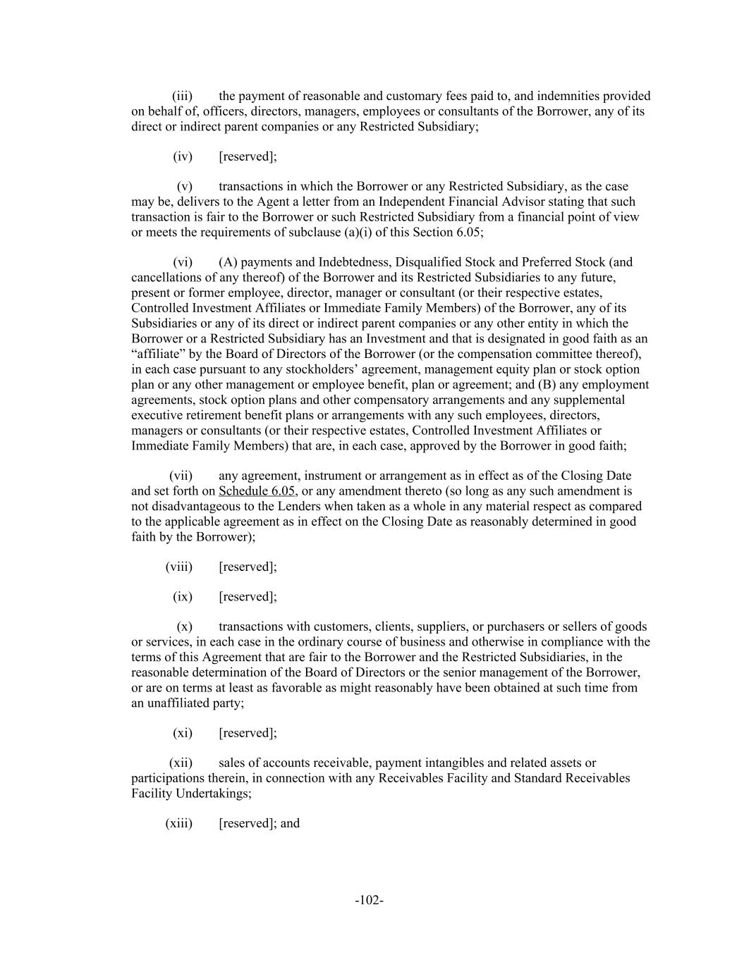 the payment of reasonable and customary fees paid to, and indemnities provided(iii) on behalf of, officers, directors, managers, employees or consultants of the Borrower, any of its direct or indirect parent companies or any Restricted Subsidiary; [reserved];(iv) transactions in which the Borrower or any Restricted Subsidiary, as the case(v) may be, delivers to the Agent a letter from an Independent Financial Advisor stating that such transaction is fair to the Borrower or such Restricted Subsidiary from a financial point of view or meets the requirements of subclause (a)(i) of this Section 6.05; (A) payments and Indebtedness, Disqualified Stock and Preferred Stock (and(vi) cancellations of any thereof) of the Borrower and its Restricted Subsidiaries to any future, present or former employee, director, manager or consultant (or their respective estates, Controlled Investment Affiliates or Immediate Family Members) of the Borrower, any of its Subsidiaries or any of its direct or indirect parent companies or any other entity in which the Borrower or a Restricted Subsidiary has an Investment and that is designated in good faith as an “affiliate” by the Board of Directors of the Borrower (or the compensation committee thereof), in each case pursuant to any stockholders’ agreement, management equity plan or stock option plan or any other management or employee benefit, plan or agreement; and (B) any employment agreements, stock option plans and other compensatory arrangements and any supplemental executive retirement benefit plans or arrangements with any such employees, directors, managers or consultants (or their respective estates, Controlled Investment Affiliates or Immediate Family Members) that are, in each case, approved by the Borrower in good faith; any agreement, instrument or arrangement as in effect as of the Closing Date(vii) and set forth on Schedule 6.05, or any amendment thereto (so long as any such amendment is not disadvantageous to the Lenders when taken as a whole in any material respect as compared to the applicable agreement as in effect on the Closing Date as reasonably determined in good faith by the Borrower); [reserved];(viii) [reserved];(ix) transactions with customers, clients, suppliers, or purchasers or sellers of goods(x) or services, in each case in the ordinary course of business and otherwise in compliance with the terms of this Agreement that are fair to the Borrower and the Restricted Subsidiaries, in the reasonable determination of the Board of Directors or the senior management of the Borrower, or are on terms at least as favorable as might reasonably have been obtained at such time from an unaffiliated party; [reserved];(xi) sales of accounts receivable, payment intangibles and related assets or(xii) participations therein, in connection with any Receivables Facility and Standard Receivables Facility Undertakings; [reserved]; and(xiii) -102-