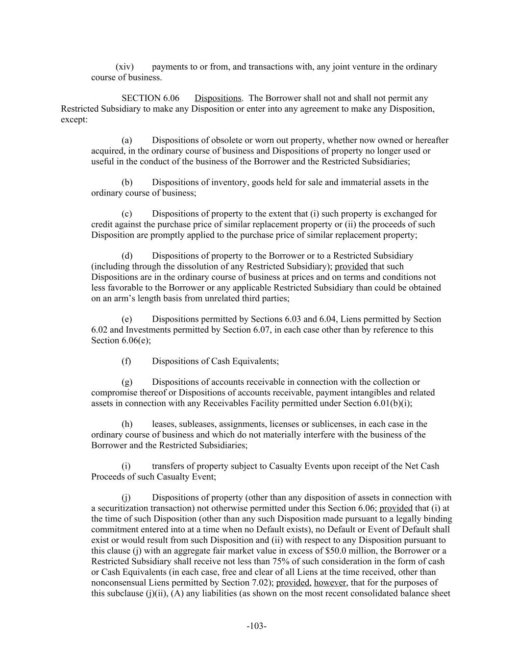 payments to or from, and transactions with, any joint venture in the ordinary(xiv) course of business. Dispositions. The Borrower shall not and shall not permit anySECTION 6.06 Restricted Subsidiary to make any Disposition or enter into any agreement to make any Disposition, except: (a) Dispositions of obsolete or worn out property, whether now owned or hereafter acquired, in the ordinary course of business and Dispositions of property no longer used or useful in the conduct of the business of the Borrower and the Restricted Subsidiaries; (b) Dispositions of inventory, goods held for sale and immaterial assets in the ordinary course of business; (c) Dispositions of property to the extent that (i) such property is exchanged for credit against the purchase price of similar replacement property or (ii) the proceeds of such Disposition are promptly applied to the purchase price of similar replacement property; (d) Dispositions of property to the Borrower or to a Restricted Subsidiary (including through the dissolution of any Restricted Subsidiary); provided that such Dispositions are in the ordinary course of business at prices and on terms and conditions not less favorable to the Borrower or any applicable Restricted Subsidiary than could be obtained on an arm’s length basis from unrelated third parties; (e) Dispositions permitted by Sections 6.03 and 6.04, Liens permitted by Section 6.02 and Investments permitted by Section 6.07, in each case other than by reference to this Section 6.06(e); (f) Dispositions of Cash Equivalents; (g) Dispositions of accounts receivable in connection with the collection or compromise thereof or Dispositions of accounts receivable, payment intangibles and related assets in connection with any Receivables Facility permitted under Section 6.01(b)(i); (h) leases, subleases, assignments, licenses or sublicenses, in each case in the ordinary course of business and which do not materially interfere with the business of the Borrower and the Restricted Subsidiaries; (i) transfers of property subject to Casualty Events upon receipt of the Net Cash Proceeds of such Casualty Event; (j) Dispositions of property (other than any disposition of assets in connection with a securitization transaction) not otherwise permitted under this Section 6.06; provided that (i) at the time of such Disposition (other than any such Disposition made pursuant to a legally binding commitment entered into at a time when no Default exists), no Default or Event of Default shall exist or would result from such Disposition and (ii) with respect to any Disposition pursuant to this clause (j) with an aggregate fair market value in excess of $50.0 million, the Borrower or a Restricted Subsidiary shall receive not less than 75% of such consideration in the form of cash or Cash Equivalents (in each case, free and clear of all Liens at the time received, other than nonconsensual Liens permitted by Section 7.02); provided, however, that for the purposes of this subclause (j)(ii), (A) any liabilities (as shown on the most recent consolidated balance sheet -103-