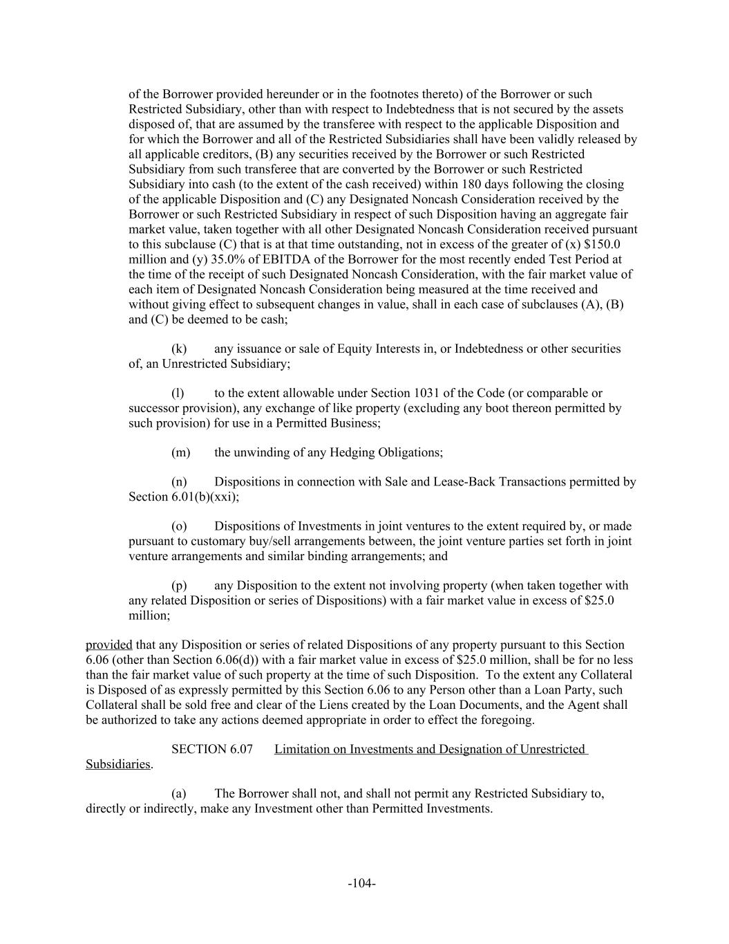 of the Borrower provided hereunder or in the footnotes thereto) of the Borrower or such Restricted Subsidiary, other than with respect to Indebtedness that is not secured by the assets disposed of, that are assumed by the transferee with respect to the applicable Disposition and for which the Borrower and all of the Restricted Subsidiaries shall have been validly released by all applicable creditors, (B) any securities received by the Borrower or such Restricted Subsidiary from such transferee that are converted by the Borrower or such Restricted Subsidiary into cash (to the extent of the cash received) within 180 days following the closing of the applicable Disposition and (C) any Designated Noncash Consideration received by the Borrower or such Restricted Subsidiary in respect of such Disposition having an aggregate fair market value, taken together with all other Designated Noncash Consideration received pursuant to this subclause (C) that is at that time outstanding, not in excess of the greater of (x) $150.0 million and (y) 35.0% of EBITDA of the Borrower for the most recently ended Test Period at the time of the receipt of such Designated Noncash Consideration, with the fair market value of each item of Designated Noncash Consideration being measured at the time received and without giving effect to subsequent changes in value, shall in each case of subclauses (A), (B) and (C) be deemed to be cash; (k) any issuance or sale of Equity Interests in, or Indebtedness or other securities of, an Unrestricted Subsidiary; (l) to the extent allowable under Section 1031 of the Code (or comparable or successor provision), any exchange of like property (excluding any boot thereon permitted by such provision) for use in a Permitted Business; (m) the unwinding of any Hedging Obligations; (n) Dispositions in connection with Sale and Lease-Back Transactions permitted by Section 6.01(b)(xxi); (o) Dispositions of Investments in joint ventures to the extent required by, or made pursuant to customary buy/sell arrangements between, the joint venture parties set forth in joint venture arrangements and similar binding arrangements; and (p) any Disposition to the extent not involving property (when taken together with any related Disposition or series of Dispositions) with a fair market value in excess of $25.0 million; provided that any Disposition or series of related Dispositions of any property pursuant to this Section 6.06 (other than Section 6.06(d)) with a fair market value in excess of $25.0 million, shall be for no less than the fair market value of such property at the time of such Disposition. To the extent any Collateral is Disposed of as expressly permitted by this Section 6.06 to any Person other than a Loan Party, such Collateral shall be sold free and clear of the Liens created by the Loan Documents, and the Agent shall be authorized to take any actions deemed appropriate in order to effect the foregoing. Limitation on Investments and Designation of Unrestricted SECTION 6.07 Subsidiaries. The Borrower shall not, and shall not permit any Restricted Subsidiary to,(a) directly or indirectly, make any Investment other than Permitted Investments. -104-